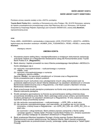 WZÓR UMOWY KONTA WZÓR UMOWY KARTY DEBETOWEJ Poniższe umowy zawarte zostały w dniu «DATA» pomiędzy: Toyota Bank Polska S.A. z siedzibą w Warszawie przy ulicy Postępu 18b, 02-676 Warszawa, wpisaną do rejestru przedsiębiorców prowadzonego przez Sąd Rejonowy dla m.st. Warszawy, XIII Wydział Gospodarczy Krajowego Rejestru Sądowego pod numerem 0000051233, zwaną dalej Bankiem, reprezentowaną przez oraz Panią «IMIE» «NAZWISKO» zamieszkałą w miejscowości «KOD_POCZTOWY» «MIASTO» «ADRES» legitymującą się dowodem osobistym «NUMER_DOK_TOZSAMOSCI», PESEL «PESEL», zwaną dalej Klientem. «Następny rekord» UMOWA KONTA 1. Wyrażenia pisane wielką literą i niezidentyfikowane w niniejszym dokumencie zachowują znaczenie nadane im w Regulaminie Świadczenia Usług dla Konsumentów przez Toyota Bank Polska S.A. (Regulamin). 2. Bank otworzy i będzie prowadził na rzecz Klienta posiadającego Identyfikator «MODULO» Konto składające się z: (a) rachunku oszczędnościowo – rozliczeniowego o numerze «NRB»; oraz (b) rachunku oszczędnościowego o numerze «Następny rekord»«NRB»; (łącznie: Konto), na warunkach określonych w Umowie oraz w Regulaminie. Konto prowadzone jest w złotych polskich. 3. Otwieranie innych rachunków oraz udostępnianie innych usług dokonywane jest na podstawie elektronicznych zleceń Klienta składanych na zasadach określonych w Umowie Bankowości Elektronicznej oraz w Regulaminie, o ile Klient zawarł z Bankiem Umowę Bankowości Elektronicznej. 4. Bank przechowuje środki pieniężne przekazane na Konto oraz przeprowadza na zlecenie Klienta rozliczenia pieniężne. 5. Środki pieniężne zgromadzone na Koncie są oprocentowane według zmiennej stopy procentowej określanej przez Bank. Bank zastrzega sobie prawo zmiany oprocentowania środków pieniężnych na zasadach określonych w Regulaminie. W dniu zawarcia umowy wysokość stopy procentowej wynosi: (a) dla rachunku oszczędnościowo – rozliczeniowego – «OPR_RR» w skali roku, (b) dla rachunku oszczędnościowego, pod warunkiem, że znajduje się na nim kwota minimalna, o której mowa w Regulaminie – od «OPR_RO_OD» do «OPR_RO_DO» w skali roku. Za czynności i usługi bankowe, Bank pobiera poprzez potrącenie z Konta opłaty i prowizje zgodne z Tabelą Opłat i Prowizji Toyota Bank Polska S.A. Zmiana wysokości opłat i prowizji następuje na zasadach określonych w Regulaminie. 6. Bank przekazuje Klientowi bezpłatne Wyciągi z Konta poprzez System Bankowości Elektronicznej w postaci elektronicznej. Na żądanie Klienta, Bank również przekazuje Wyciągi papierowe za pośrednictwem poczty, pobierając opłatę wskazaną w Tabeli Opłat i Prowizji. 7. Pozostałe warunki Umowy, w tym zasady oprocentowania środków, przeprowadzania rozliczeń pieniężnych, rozwiązywania Umowy określone są w Regulaminie stanowiącym integralną część Umowy oraz w Tabeli Oprocentowania. 8. Jeżeli co innego nie wynika z wyraźnego postanowienia Regulaminu, wszelkie zawiadomienia i oświadczenia stron związane z Umową mogą być składane w postaci elektronicznej na zasadach określonych w Umowie Bankowości Elektronicznej oraz w Regulaminie. 9. Umowa została zawarta na czas nieoznaczony. 10. Każda ze stron może wypowiedzieć Umowę na piśmie z zachowaniem postanowień Regulaminu. 11. Od niniejszej umowy Klient może odstąpić bez podania przyczyn składając stosowne oświadczenie na piśmie w terminie czternastu dni od dnia jej zawarcia. Do zachowania tego terminu wystarczy wysłanie oświadczenia przed jego upływem na adres Banku. Klient wyraża jednakże zgodę by Bank rozpoczął świadczenie usług przed upływem powyższego terminu. Wzór oświadczenia o odstąpieniu stanowi załącznik do niniejszej Umowy oraz znajduje się na stronie www.toyotabank.pl. 12. Klient potwierdza otrzymanie Regulaminu, Tabeli Opłat i Prowizji oraz Tabeli Oprocentowania. Dokumenty te są ponadto dostępne na www.toyotabank.pl. 13. Umowa podlega prawu polskiemu. UMOWA KARTY DEBETOWEJ 1. Wyrażenia pisane wielką litera i niezdefiniowane w niniejszym dokumencie zachowują znaczenie na dane im w Regulaminie Świadczenia Usług przez Toyota Bank Polska S.A. (Regulamin). 2. Na zasadach określonych w niniejszej Umowie (Umowa) oraz w Regulaminie, Bank: (a) wyda Klientowi posiadającemu konto w Banku, a na jego wniosek także pełnomocnikowi, kartę debetową (Karta Debetowa) do rachunku oszczędnościowo – rozliczeniowego prowadzonego w ramach Konta. Jeżeli Klientem jest osoba małoletnia, wydanie Karty Debetowej dla jej pełnomocnika wymaga zgody przedstawiciela ustawowego małoletniego; oraz (b) będzie rozliczał Transakcje płatnicze dokonane przy użyciu Karty Debetowej. 3. Karta Debetowa powiązana jest z rachunkiem o numerze NRB «Następny rekord»«NRB» 4. Umowę zawiera się na czas oznaczony do dnia upływu ważności Karty Debetowej, który wskazany jest na jej awersie. Jeżeli wydano więcej niż jedną Kartę Debetową pod uwagę brana jest data późniejsza. W razie wydania kolejnych Kart Debetowych, Umowa Karty Debetowej ulega przedłużeniu na okres ważności nowej Karty Debetowej, chyba że Bank złoży oświadczenie o nieprzedłużaniu Umowy co najmniej na 2 miesiące przed upływem ważności Karty Debetowej lub Klient złoży oświadczenie o nieprzedłużaniu Umowy co najmniej na 1 miesiąc przed końcem upływem ważności Karty Debetowej. Jeżeli żadna ze stron nie złoży oświadczenia o nieprzedłużaniu umowy w terminach, o których mowa w zdaniu poprzedzającym Bank doręcza Klientowi nowa Kartę Debetową. Oświadczenie o nieprzedłużeniu Umowy powinno być złożone w formie pisemnej lub za pośrednictwem Systemu Bankowości Elektronicznej. 5. Umowa Karty Debetowej wygasa lub ulega rozwiązaniu z chwilą wygaśnięcia lub rozwiązania Umowy Konta, do którego wydano Kartę Debetową. 6. Za czynności i usługi bankowe, Bank pobiera poprzez potrącenie z