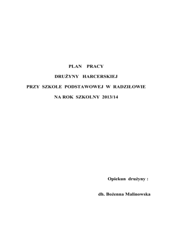 PLAN PRACY DRUŻYNY HARCERSKIEJ PRZY SZKOLE PODSTAWOWEJ W RADZIŁOWIE NA ROK SZKOLNY 2013/14 Opiekun drużyny : dh. Bożenna Malinowska CELE : Propagowanie aktywnych form spędzania wolnego czasu poprzez organizowanie rajdów rowerowych, biegów patrolowych, pieszych wycieczek, kuligów, ognisk. Kształtowanie postaw proekologicznych poprzez udział w akcji „Sprzątanie Świata”. Kształtowanie postaw patriotycznych poprzez udział w świętach i uroczystościach np.: 11 listopada, 3 Maja. Pogłębianie poszanowania tradycji lokalnych. Budzenie wrażliwości na krzywdę i niedolę innych ludzi, poprzez udział w akcjach charytatywnych. Rozwijanie umiejętności planowania i organizowania pracy w zastępie, drużynie. Kształtowanie poczucia odpowiedzialności za wykonanie zleconych zadań indywidualnie i zespołowo. Rozwijanie zainteresowań piosenką harcerską poprzez wspólny śpiew przy ognisku, organizację konkursu piosenki harcerskiej. Kształtowanie poczucia więzi ze środowiskiem lokalnym. METODY I FORMY PRACY Praca w zespołach zadaniowych, Praca indywidualna na rzecz drużyny lub zastępu, Czynny udział w zbiórkach drużyny i zastępów. Organizowanie i udział w rajdach rowerowych i pieszych wycieczkach, Organizowanie i udział w biegach patrolowych , Organizowanie zajęć sportowych, mecz piłki nożnej itp, Porządkowanie grobów przed świętem zmarłych, Udział w akcjach charytatywnych, Zdobywanie sprawności harcerskich, Zaangażowanie w działalność szkoły i środowiska lokalnego, Współpraca z instytucjami lokalnymi np.: OSP , Posterunkiem Policji, Współpraca z Komendą Hufca w Grajewie, TEMATYKA I HARMONOGRAM DZIAŁAŃ DRUŻYNY HARCERSKIEJ NA ROK SZK. 2012/13 Lp. REALIZOWANE ZADANIA Zbiórka organizacyjna. 1. TERMIN Przyjmowanie nowych członków do drużyny. Zapoznanie z krótką historią harcerstwa i jego założycielami. Udział w biwaku harcerskim „JESIENIOWISKO” Udział w akcji „Sprzątanie Świata”. Ognisko integracyjne. 2. Nauka piosenek i pląsów. Wyjazd na basen . Porządkowanie opuszczonych grobów na cmentarzu. Rajd rowerowy do na terenie gminy Radziłów. X 2013r. 3. Udział w lokalnych obchodach Święta Niepodległości. Bieg patrolowy na terenie Radziłowa. Przygotowanie harcerzy do złożenia przyrzeczenia harcerskiego. 4. Spotkanie opłatkowe- wspólne śpiewanie kolęd, dzielenie się opłatkiem. Udział w przekazaniu BŚP organizowanym przez Komendę Hufca Przekazywanie Betlejemskiego Światła Pokoju na terenie Radziłowa i okolicznych miejscowości. Spotkanie integracyjne, nauka piosenek i pląsów. Zdobywanie sprawności. 5. 6. 8. 9. 10. Zabawy zimowe na śniegu . Wyjazd na lodowisko i do kina do Białegostoku. Udział w obchodach Dnia Myśli Braterskiej Udział w pieszym rajdzie szlakiem miejsc pamięci narodowej na trasie Grajewo – Kosówka. Udział w obchodach rocznicy uchwalenia Konstytucji 3 Maja. Rozgrywki sportowe. Gry i zabawy. Rajd rowerowy do BPN. Ognisko i podsumowanie pracy drużyny. Radziłów 20.09.13r. IX 2013r. XI 2013r. XII 2013r. I 2014r. II 2014r. IV 2014r. V 2014r. VI 2014r. Plan opracowała: dh. B. Malinowska we współpracy z zastępowymi
