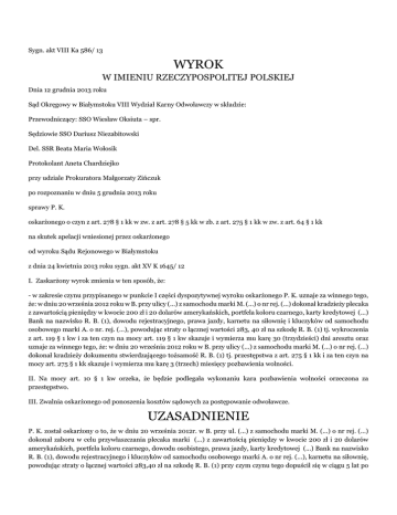 Sygn. akt VIII Ka 586/ 13 WYROK W IMIENIU RZECZYPOSPOLITEJ POLSKIEJ Dnia 12 grudnia 2013 roku Sąd Okręgowy w Białymstoku VIII Wydział Karny Odwoławczy w składzie: Przewodniczący: SSO Wiesław Oksiuta – spr. Sędziowie SSO Dariusz Niezabitowski Del. SSR Beata Maria Wołosik Protokolant Aneta Chardziejko przy udziale Prokuratora Małgorzaty Zińczuk po rozpoznaniu w dniu 5 grudnia 2013 roku sprawy P. K. oskarżonego o czyn z art. 278 § 1 kk w zw. z art. 278 § 5 kk w zb. z art. 275 § 1 kk w zw. z art. 64 § 1 kk na skutek apelacji wniesionej przez oskarżonego od wyroku Sądu Rejonowego w Białymstoku z dnia 24 kwietnia 2013 roku sygn. akt XV K 1645/ 12 I. Zaskarżony wyrok zmienia w ten sposób, że: - w zakresie czynu przypisanego w punkcie I części dyspozytywnej wyroku oskarżonego P. K. uznaje za winnego tego, że: w dniu 20 września 2012 roku w B. przy ulicy (...) z samochodu marki M. (...) o nr rej. (...) dokonał kradzieży plecaka z zawartością pieniędzy w kwocie 200 zł i 20 dolarów amerykańskich, portfela koloru czarnego, karty kredytowej (...) Bank na nazwisko R. B. (1), dowodu rejestracyjnego, prawa jazdy, karnetu na siłownię i kluczyków od samochodu osobowego marki A. o nr. rej. (...), powodując straty o łącznej wartości 283, 40 zł na szkodę R. B. (1) tj. wykroczenia z art. 119 § 1 kw i za ten czyn na mocy art. 119 § 1 kw skazuje i wymierza mu karę 30 (trzydzieści) dni aresztu oraz uznaje za winnego tego, że: w dniu 20 września 2012 roku w B. przy ulicy (...) z samochodu marki M. (...) o nr rej. (...) dokonał kradzieży dokumentu stwierdzającego tożsamość R. B. (1) tj. przestępstwa z art. 275 § 1 kk i za ten czyn na mocy art. 275 § 1 kk skazuje i wymierza mu karę 3 (trzech) miesięcy pozbawienia wolności. II. Na mocy art. 10 § 1 kw orzeka, że będzie podlegała wykonaniu kara pozbawienia wolności orzeczona za przestępstwo. III. Zwalnia oskarżonego od ponoszenia kosztów sądowych za postępowanie odwoławcze. UZASADNIENIE P. K. został oskarżony o to, że w dniu 20 września 2012r. w B. przy ul. (...) z samochodu marki M. (...) o nr rej. (...) dokonał zaboru w celu przywłaszczania plecaka marki (...) z zawartością pieniędzy w kwocie 200 zł i 20 dolarów amerykańskich, portfela koloru czarnego, dowodu osobistego, prawa jazdy, karty kredytowej (...) Bank na nazwisko R. B. (1), dowodu rejestracyjnego i kluczyków od samochodu osobowego marki A. o nr rej. (...), karnetu na siłownię, powodując straty o łącznej wartości 283,40 zł na szkodę R. B. (1) przy czym czynu tego dopuścił się w ciągu 5 lat po odbyciu co najmniej 6 miesięcy kary pozbawienia wolności za podobne przestępstwo umyślne, tj. o czyn z art. 278 § 1 kk w zb. z art.278 § 5 kk w zb. z art.275 § 1 kk w zb. z art.64 § 1 kk Sąd Rejonowy w Białymstoku wyrokiem z dnia 24 kwietnia 2013 r. w sprawie o sygn. akt XV K 1645/12 oskarżonego P. K. uznał za winnego popełnienia zarzuconego mu czynu, z tym, że czyn zakwalifikował z art. 278 § 1 kk w zw. z art.278 § 5 kk w zb. z art.275 § 1 kk w zw. z art.64 § 1 kk i za to na mocy art. 278 § 1 kk w zw. z art.278 § 5 kk w zb. z art.275 § 1 kk w zw. z art.64 § 1 kk i w zw. z art.11 § 2 kk skazał go zaś na mocy art. 278 § 1 kk w zw. z art.11 § 3 kk wymierzył mu karę 7 (siedmiu) miesięcy pozbawienia wolności. Zwolnił oskarżonego od ponoszenia kosztów procesu i obciążył nimi Skarb Państwa. Powyższy wyrok, na podstawie art. 444 k.p.k. i art. 425 § 1-3 k.p.k., co do kary, zaskarżył oskarżony P. K.. Na zasadzie art. 438 pkt 4 k.p.k. zaskarżonemu wyrokowi zarzucił rażącą niewspółmierność kary wymierzonej oskarżonemu w stosunku do stopnia zawinienia oraz właściwości osobistych P. K., który podczas pierwszego przesłuchania przyznał się do popełnienia zarzucanego mu czynu, a także wyraził skruchę z powodu jego popełnienia. Wskazując na powyższe, na podstawie art. 427§1 k.p.k. i art. 437§2 k.p.k. wniósł o zmianę zaskarżonego wyroku, poprzez wymierzenie oskarżonemu kary pozbawienia wolności z warunkowym zawieszeniem jej wykonania. Sąd Okręgowy zważył, co następuje: Apelacja okazała się zasadna jedynie o tyle, o ile umożliwiła na etapie postępowania odwoławczego zmianę zaskarżonego wyroku w kierunku korzystnym dla oskarżonego, aczkolwiek podstawą tej decyzji stało się: po pierwsze dostrzeżenie przez Sąd Okręgowy z urzędu uchybienia Sądu Rejonowego polegającego na wadliwej ocenie prawnej przypisanego P. K. zachowania polegającego na kradzieży karty kredytowej, po drugie zaś „przekwalifikowanie” przez ustawodawcę, już po wydaniu zaskarżonego wyroku, przestępstwa zaboru w celu przywłaszczenia rzeczy o wartości poniżej ¼ do kategorii wykroczeń. Na wstępie wskazać należy, że w świetle zebranego materiału dowodowego, wina oskarżonego P. K. i okoliczności popełnienia zarzuconego mu zachowania nie budzą wątpliwości Sądu Okręgowego. Świadczą o nich wprost zeznania R. B. (1), R. B. (2), M. K. oraz J. G., którzy wskazali na oskarżonego jako tego, który w dniu 20 września 2012 roku przechodząc wraz z dziewczyną obok zaparkowanego i nie zamkniętego samochodu pokrzywdzonego otworzył drzwi, zabrał z niego plecak i zaczął uciekać. Plecak należał do R. B. (1), a znajdowały się w nim: pieniądze w kwocie 200 zł. i 20 dolarów amerykańskich, portfel, dowód osobisty, prawo jazdy, karta kredytowa, dowód rejestracyjny, karnet na siłownię i kluczyki do samochodu marki a. o łącznej wartości 283,40 zł. Ostatecznie wobec interwencji zaalarmowanego pokrzywdzonego, która zakończyła się zatrzymaniem dziewczyny oskarżonego, wyrzucił on plecak, zaniechał kontynuowania ucieczki i wrócił do niej. Także sam oskarżony przyznał się do zarzuconego mu zachowania, a w treści apelacji nie kwestionował ustaleń faktycznych poczynionych przez Sąd I instancji. Dlatego też, niecelowym jest szersze odnoszeni