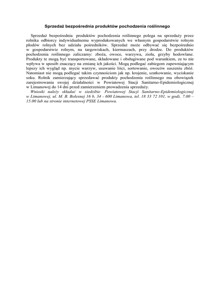Sprzedaż bezpośrednia produktów pochodzenia roślinnego Sprzedaż bezpośrednia produktów pochodzenia roślinnego polega na sprzedaży przez rolnika odbiorcy indywidualnemu wyprodukowanych we własnym gospodarstwie rolnym płodów rolnych bez udziału pośredników. Sprzedaż może odbywać się bezpośrednio w gospodarstwie rolnym, na targowiskach, kiermaszach, przy drodze. Do produktów pochodzenia roślinnego zaliczamy: zboża, owoce, warzywa, zioła, grzyby hodowlane. Produkty te mogą być transportowane, składowane i obsługiwane pod warunkiem, ze to nie wpływa w sposób znaczący na zmianę ich jakości. Mogą podlegać zabiegom zapewniającym lepszy ich wygląd np. mycie warzyw, usuwanie liści, sortowanie, owoców suszeniu zbóż. Natomiast nie mogą podlegać takim czynnościom jak np. krojenie, szatkowanie, wyciskanie soku. Rolnik zamierzający sprzedawać produkty pochodzenia roślinnego ma obowiązek zarejestrowania swojej działalności w Powiatowej Stacji Sanitarno-Epidemiologicznej w Limanowej do 14 dni przed zamierzeniem prowadzenia sprzedaży. Wnioski należy składać w siedzibie Powiatowej Stacji Sanitarno-Epidemiologicznej w Limanowej, ul. M. B. Bolesnej 16 b, 34 - 600 Limanowa, tel. 18 33 72 101, w godz. 7.00 – 15.00 lub na stronie internetowej PSSE Limanowa.