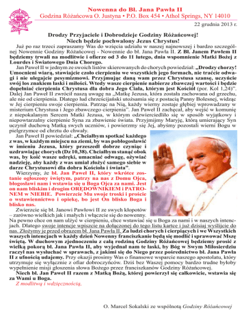 Nowenna do Bł. Jana Pawła II Godzina Różańcowa O. Justyna • P.O. Box 454 • Athol Springs, NY 14010 22 grudnia 2013 r. Drodzy Przyjaciele i Dobrodzieje Godziny Różańcowej! Niech będzie pochwalony Jezus Chrystus! Już po raz trzeci zapraszamy Was do wzięcia udziału w naszej najnowszej i bardzo szczególnej Nowennie Godziny Różańcowej - Nowennie do bł. Jana Pawła II. Z Bł. Janem Pawłem II będziemy trwali na modlitwie i ofierze od 3 do 11 lutego, dnia wspomnienie Matki Bożej z Lourdes i Światowego Dnia Chorego. Jan Paweł II w jednym ze swoich listów skierowanych do chorych powiedział: „Drodzy chorzy! Umocnieni wiarą, stawiajcie czoło cierpieniu we wszystkich jego formach, nie traćcie odwagi i nie ulegajcie pesymizmowi. Przyjmując daną wam przez Chrystusa szansę, uczyńcie swój los znakiem łaski i miłości. Wtedy wasze cierpienie nabierze zbawczej wartości i będzie dopełniać cierpienia Chrystusa dla dobra Jego Ciała, którym jest Kościół (por. Kol 1,24)”. Dalej Jan Paweł II zwrócił naszą uwagę na „Matkę Jezusa, która została zachowana od grzechu, ale nie od cierpienia. Dlatego lud chrześcijański utożsamia się z postacią Panny Bolesnej, widząc w Jej cierpieniu swoje cierpienia. Patrząc na Nią, każdy wierny zostaje głębiej wprowadzany w misterium Chrystusa i Jego zbawczego cierpienia”. Jan Paweł II zachęcał, aby wejść w komunię z niepokalanym Sercem Matki Jezusa, w którym odzwierciedliło się w sposób wyjątkowy i niepowtarzalny cierpienie Syna za zbawienie świata. Przyjmijmy Maryję, którą umierający Syn uczynił duchową Matką swych uczniów, i powierzmy się Jej, abyśmy pozostali wierni Bogu w pielgrzymce od chrztu do chwały. Jan Paweł II powiedział: „Chciałbym spotkać każdego z was, w każdym miejscu na ziemi, by was pobłogosławić w imieniu Jezusa, który przeszedł dobrze czyniąc i uzdrawiając chorych (Dz 10,38). Chciałbym stanąć obok was, by koić wasze udręki, umacniać odwagę, ożywiać nadzieję, aby każdy z was umiał złożyć samego siebie w darze Chrystusowi dla dobra Kościoła i świata”. Wierzymy, że bł. Jan Paweł II, który wkrótce zostanie ogłoszony świętym, patrzy na nas z Domu Ojca, błogosławi nam i wstawia się u Boga Ojca za nami. Jest on nam bliskim i drogim ORĘDOWNIKIEM i PATRONEM w NIEBIE. Powierzcie Mu swoje troski i proście o wstawiennictwo i opiekę, bo jest On blisko Boga i blisko nas. Zwierzcie się bł. Janowi Pawłowi II ze swych kłopotów – zarówno wielkich jak i małych i włączcie się do nowenny. Na pewno chce on nam ulżyć w cierpieniu, chce wstawiać się u Boga za nami i w naszych intencjach. Dlatego swoje intencje wpiszcie na dołączonej do tego listu kartce i już dzisiaj wyślijcie do nas. Złożymy je przed obrazem bł. Jana Pawła II. Za ludzi chorych i cierpiących i we Wszystkich waszych intencjach w każdy dzień Nowenny franciszkanie będą się modlić i sprawować Mszę świętą. W duchowym zjednoczeniu z całą rodziną Godziny Różańcowej będziemy prosić z wielką pokorą bł. Jana Pawła II, aby wyjednał nam te łaski, by Bóg w Swym Miłosierdziu raczył nas wysłuchać w sprawach, z jakimi się do Niego przez pośrednictwo bł. Jana Pawła II z ufnością udajemy. Przy okazji prosimy Was o finansowe wsparcie naszego apostolatu, który utrzymuje się wyłącznie z ofiar dobroczyńców. Dziś bez Waszej pomocy bardzo trudne byłoby wypełnienie misji głoszenia słowa Bożego przez franciszkanów Godziny Różańcowej. Niech bł. Jan Paweł II razem z Matką Bożą, której powierzył się całkowicie, wstawia się za Wami u Boga. Z modlitwą i wdzięcznością, O. Marcel Sokalski ze wspólnotą Godziny Różańcowej