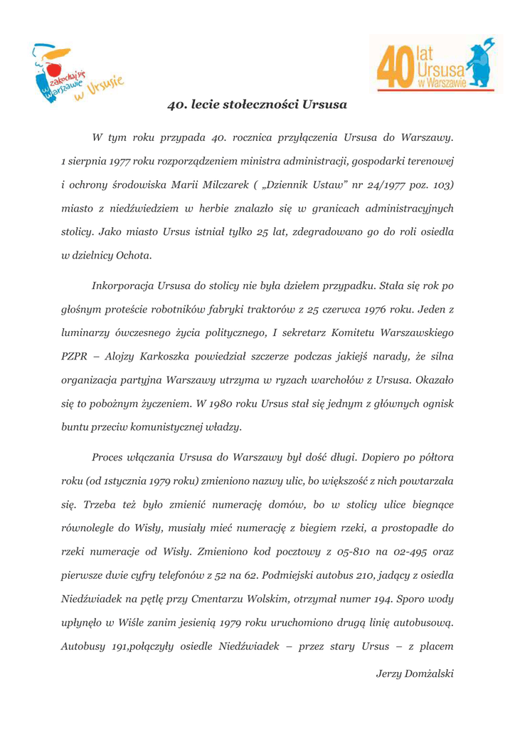 40. lecie stołeczności Ursusa W tym roku przypada 40. rocznica przyłączenia Ursusa do Warszawy. 1 sierpnia 1977 roku rozporządzeniem ministra administracji, gospodarki terenowej i ochrony środowiska Marii Milczarek ( „Dziennik Ustaw” nr 24/1977 poz. 103) miasto z niedźwiedziem w herbie znalazło się w granicach administracyjnych stolicy. Jako miasto Ursus istniał tylko 25 lat, zdegradowano go do roli osiedla w dzielnicy Ochota. Inkorporacja Ursusa do stolicy nie była dziełem przypadku. Stała się rok po głośnym proteście robotników fabryki traktorów z 25 czerwca 1976 roku. Jeden z luminarzy ówczesnego życia politycznego, I sekretarz Komitetu Warszawskiego PZPR – Alojzy Karkoszka powiedział szczerze podczas jakiejś narady, że silna organizacja partyjna Warszawy utrzyma w ryzach warchołów z Ursusa. Okazało się to pobożnym życzeniem. W 1980 roku Ursus stał się jednym z głównych ognisk buntu przeciw komunistycznej władzy. Proces włączania Ursusa do Warszawy był dość długi. Dopiero po półtora roku (od 1stycznia 1979 roku) zmieniono nazwy ulic, bo większość z nich powtarzała się. Trzeba też było zmienić numerację domów, bo w stolicy ulice biegnące równolegle do Wisły, musiały mieć numerację z biegiem rzeki, a prostopadłe do rzeki numeracje od Wisły. Zmieniono kod pocztowy z 05-810 na 02-495 oraz pierwsze dwie cyfry telefonów z 52 na 62. Podmiejski autobus 210, jadący z osiedla Niedźwiadek na pętlę przy Cmentarzu Wolskim, otrzymał numer 194. Sporo wody upłynęło w Wiśle zanim jesienią 1979 roku uruchomiono drugą linię autobusową. Autobusy 191,połączyły osiedle Niedźwiadek – przez stary Ursus – z placem Jerzy Domżalski Narutowicza, umożliwiając wreszcie łatwiejszy dojazd do Urzędu Dzielnicy przy ul. Grójeckiej. W Ursusie była filia tego urzędu przy ulicy Rynkowej. Jesienią 1979 roku przedłużono też nocną linię autobusową 605 do Ursusa. I to wszystko. Włączenie Ursusa do Warszawy nie spowodowało jego rozwoju, a degradację. Nie tylko był peryferiami stolicy, ale coraz wyraźniej było widać, że staje się odległymi przedmieściami samej Ochoty. W sierpniu 1979 roku – w drugą rocznicę włączenia Ursusa do Warszawy – ówczesny naczelnik dzielnicy Ochota Zbigniew Lippe powiedział w wywiadzie udzielonym dziennikarzowi „Głosu Ursusa”: „Kiedy oglądamy Ursus poprzez osiedle Kolorowa, czy okolice dawnego placu 1000-lecia to wydaje się on bardzo nowoczesnym i wielkomiejskim. Ale Ursus to również ulica Regulska oraz dawna Sosnowa i wiele im podobnych. Jeśli więc spojrzymy na Ursus od tych zaniedbanych uliczek, dopiero wtedy widzimy jak wiele pozostało do zrobienia”. Niestety, lata osiemdziesiąte nie sprzyjały rozwojowi osiedla. Ursus dostarczał 25 proc. dochodu do budżetu Ochoty, a do niego wracało tylko 10 proc. Dopiero początek lat dziewięćdziesiątych XX wieku zmienił radykalnie sytuację. 1 stycznia 1993 roku, decyzją rządu Hanny Suchockiej, Ursus został wyłączony z Ochoty jako 8 dzielnica-gmina warszawska. Usamodzielnienie się Ursusa zbiegło się ze 100. leciem istnienia fabryki Ursus, która przez lata odgrywała decydującą rolę w przekształceniu okolicznych wiosek: Czechowic, Gołąbek, Skoroszy i Szamot w jedno miasto. Dla Ursusa powiał lepszy wiatr. Jego dynamiczny rozwój na przełomie tysiącleci to już inna historia. Jerzy Domżalski