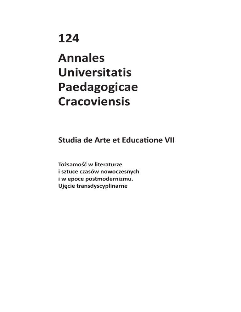 124 Annales Universitatis Paedagogicae Cracoviensis Studia de Arte et Educatione VII Tożsamość w literaturze i sztuce czasów nowoczesnych i w epoce postmodernizmu. Ujęcie transdyscyplinarne Rada Naukowa Adam Brincken, Tadeusz Budrewicz, Franciszek Chmielowski, Bogusław Krasnowolski, Richard Noyce, Romuald Oramus, Lucjan Orzech, Stanisław Rodziński, Xenophon Sachinis, Milan Sokol, Seweryna Wysłouch Redakcja Naukowa Monika Nęcka, Stanisław Sobolewski, Rafał Solewski (redaktor naczelny), Bernadeta Stano (sekretarz redakcji) Redaktor naukowy tomu dr hab. Rafał Solewski, prof. UP Lista recenzentów Studia de Arte et Educatione dr hab. Zofia A. Kłakówna, prof. Akademii Jana Długosza w Częstochowie prof. Stanisław Julian Rodziński prof. dr hab. Grzegorz Sztabiński prof. Stanisław Tabisz dr hab. Feliks Tomaszewski, prof. Uniwersytetu Gdańskiego prof. Jacek Waltoś prof. dr hab. Seweryna Maria Wysłouch © Copyright by Wydawnictwo Naukowe UP, Kraków 2012 Wersją pierwotną tomu jest plik dostępny na stronie internetowej: http://wydzialsztuki.up.krakow.pl/wp-content/uploads/2013/06/Folia-124.pdf ISSN 2081–3325 Wydawnictwo Naukowe UP Redakcja/Dział Promocji 30–084 Kraków, ul. Podchorążych 2 tel./fax 12 662–63–83, tel. 12 662–67–56 e-mail: [email protected] Zapraszamy na stronę internetową: http://www.wydawnictwoup.pl druk i oprawa Zespół Poligraficzny UP, zam. 83/12 Wstęp Zbiór prezentuje artykuły przygotowane w związku z badaniami nad tożsamością w różnych dziedzinach kultury, szczególnie w czasach najnowszych, ale także w wybranych przykładach twórczości dawniejszej. Zawiera proste obserwacje, pogłębione analizy wybranych przykładów z różnych dziedzin, zestawienia oraz próby szerszych interpretacji. Teksty dotyczą literatury i języka, sztuk wizualnych, reklamy, zagadnień edukacyjnych, wreszcie, niejako autotelicznie, problemu poruszania się pomiędzy różnymi dziedzinami. Pytania o możliwość definiowania reklamy jako dzieła sztuki, zachowywania istoty wypowiedzi mimo jej przeformułowania, hermeneutyczne próby dotyczące Diane Arbus albo Sophie Calle sąsiadują z refleksjami wywołanymi lekturą dzieł nie tylko Olgi Tokarczuk, Zbigniewa Herberta czy Mariana Pankowskiego, ale i Adama Mickiewicza. Dzieła i analityczno-interpretacyjne rozważania dotyczą postaw związanych z czasami nowoczesnymi, często jednak również kontrowersyjnych sytuacji właściwych epoce postmodernizmu. Szczególną wartością zbioru jest z jednej strony zestawianie poczucia kryzysu, głoszenia tożsamości płynnej oraz ironii w odniesieniu do biologicznego i kulturowego dziedzictwa, a z drugiej strony postawy poszukiwania fundamentów osobowości jednolitej. Odnajdywanej w myśleniu, pamiętaniu i dialogu z innym, kultywowaniu tradycji antycznej, czy w uniesieniu wywołanym nie tylko fantastycznym wizjonerstwem, ale i wrażliwością na transcendencję. Kryteria czasu, miejsca i dyscypliny twórczej nie są najważniejsze. Nabierają znaczenia tylko w kontekście aspektów poruszanych w danym artykule. Teksty traktują o pojęciu tożsamości w odniesieniu do dzieła sztuki i problemu jego definicji. Częściej jednak dotyczą człowieka oraz poczucia tożsamości osobowej i zbiorowej. Niekiedy zbliżają się do filozoficznych rozważań o tożsamości w ogóle. Płaszczyzny przenikają się niekiedy, co może stanowić wyzwanie dla konsekwentnego dyskursu, ale zarazem pokazuje, że kwestie jednolitości, uzasadnienia reguł, wolności, zróżnicowania, zmiany i płynności obecne są nie tylko w najczęstszych treściach dotyczących stałości osobowej, „wierności sobie”, myślenia i cielesności, Innego, wspólnoty, historyczności i pamięci, narodu. W rozważaniach obecne są poglądy tradycyjne i nowoczesne oraz postmodernistyczne. Osobną wartością zbioru jest zestawienie specyficznych ujęć właściwych różnym dziedzinom sztuki. Priorytetem jest transdyscyplinarność, tzn. nie tyle poruszanie się pomiędzy dziedzinami („inter-”), ile obserwacja tego, jak tożsamość dzieła, rzeczy, osoby, czy zbiorowości, postrzegana na oryginalne sposoby, pojawia się w różnych dyscyplinach, przenika je („trans-”), korzysta z inspiracji innymi doświadczeniami, [4] Wstęp mobilizuje różnorodny wysiłek twórczy, wywołuje wielorakie skojarzenia. Niektóre z nich powtarzają się lub są sobie bliskie. Przyjęty został zatem problemowy podział materiału. Za radą profesora Grzegorza Sztabińskiego są to części Tożsamość i tradycje; Tożsamość a inni; Poszukiwanie tożsamości a gry z tożsamością oraz wyodrębniony artykuł szczególnie skupiony na problemach edukacji. Jednocześnie wskazówki recenzentów, szczególnie kategoryczne uwagi prof. Feliksa Tomaszewskiego, pozwoliły na lepszą selekcję i poprawę artykułów. Choć nie zawsze udało się pogodzić krytykę i zamysł autorów albo połączyć opinie obydwu recenzentów. Być może kontrowersyjne obserwowanie przewodniego problemu z bardzo różnych perspektyw stanie się punktem wyjścia do kontynuacji badań o podobnym charakterze, rozumianych nie tylko jako inter- albo trandyscyplinarność, ale bardziej jako próby osiągania poziomu meta, wykraczającego ponad rozgraniczenia dyscyplinarne. Niewykluczone, że metadyscyplinarność, łącząca i szczegółowe analizy w obrębie różnych dziedzin, i ogólną refleksję natury filozoficznej, jest dopiero właściwą, potencjalnie odkrywczą metodą refleksji o tak istotnym współcześnie problemie tożsamości i jego obecności w przestrzeni szeroko rozumianej kultury. Tym bardziej, że odpowiedzi na wiele pytań wydają się możliwe do odnalezienia dopiero w obszarze metafizyki, a więc tego, co wykracza poza możliwości analiz tradycyjnie naukowych. FOLIA 124 Annales Universitatis Paedagogicae Cracoviensis Studia de Arte et Educatione VII (2012) KONTEKST PEDAGOGICZNY Jadwiga Mikulić Edukacj