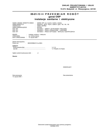 ZAKŁAD PROJEKTOWANIA I USŁUG INWESTYCYJNYCH 15-274 Białystok ul. Waszyngtona 24/145 09-01-13 <> P R Z E D M I A R R O B Ó T garaŜ OSP instalacje sanitarne i elektryczne NAZWA ZADANIA INWESTYCYJNEGO ADRES INWESTYCJI ZAMAWIAJĄCY ADRES ZAMAWIAJĄCEGO KOD CPV KOD CPV KOD CPV BRANśA OPRACOWAŁ DATA OPRACOWANIA Stawka roboczogodziny : Poziom cen : : : : : : : : : : : GARAś OSP przy budynku świetlicy wiejskiej KRUSZYN, gmina Krypno, działka nr. geod. 183; 184; 185 GMINA KRYPNO KRYPNO 45215500-2 - OBIEKTY UśYTECZNOŚCI PUBLICZNEJ 45330000-9 - PRACE HYDRAULICZNE I SANITARNE 45310000-0 - PRACE DOTYCZĄCE INSTALACJI ELEKTRYCZNYCH instalacje sanitarne i elektyczne inŜ Andrzej Kicman 15 styczeń 2009 r SEKOCENBUD IV kw 2008 r NARZUTY Koszty pośrednie [Kp] ................................................................. Zysk [Z] ........................................................................................ Ogółem wartość kosztorysowa robót : % R, S % R+Kp(R), M, S+Kp(S) zł Słownie: ZAMAWIAJĄCY: Data opracowania 15 styczeń 2009 r Data zatwierdzenia Dokument został opracowany przy pomocy programu NORMA STD 09-01-13 P1 KRUSZYN garaŜ instalacje.kst DZIAŁY KOSZTORYSU Lp. Nazwa działu GARAZ OSP przy budynku świetlicy wiejskiej - instalacje sanitarne i elektryczne 1 INSTALACJE SANITARNE 2 INSTALACJE ELEKTRYCZNE -2- Norma STD Wersja 4.21 Licencja: 6844 dla utwb Od 1 11 Do 10 13 09-01-13 P1 KRUSZYN garaŜ instalacje.kst PRZEDMIAR Lp. Podst Opis i wyliczenia GARAZ OSP przy budynku świetlicy wiejskiej - instalacje sanitarne i elektryczne 1 INSTALACJE SANITARNE 1 KNNR 4 0411- Zawory przelotowe kulowe o połączeniach gwintowanych o śr. nominalnej 20 mm d.1 02 2 j.m. szt. m 3 KNNR 4 0428- Rury przyłączne o śr. 15 mm do grzejników stalowych płytowych bez zaworów powrotnych d.1 01 2 kpl. 4 KNNR 4 0418- Grzejniki stalowe jak wyzej dwupłytowe [ g ] V-22-900-1000 d.1 07 1 szt. 5 KNNR 4 0418- Grzejniki stalowe jak wyzej dwupłytowe [ g ] V-22-600-600 d.1 07 1 szt. 6 d.1 kalk. własna Płyn niezamarzający EKOBAL w ilości 35% pojemności zładu dm3 1.1*6.0*0.35 dm3 m kpl. szt. szt. 7 KNNR 4 0436- Próby z dokonaniem regulacji instalacji centralnego ogrzewania (na gorąco) d.1 01 2 urz. 8 KNNR 4 0112- Rurociągi z tworzyw sztucznych PE, w instalacji wododociągowej podpodłogowej o połaczeniech d.1 01 zgrzewanych lub na łaczniki zaciskowe DN 18/2 wraz z osłoną ciepłochronną grub 5,0 mm w buanalogia dynkach niemieszkalnych 4.2 m 9 KNNR 4 0116- Dodatki za podejścia dopływowe w rurociągach z tworzyw sztucznych do baterrri pisuarowej zaworów d.1 01 czerpalnych podgrzewacy przepływowych o połączeniu sztywnym o śr. zewnętrznej 20 mm 1 szt. 10 KNNR 4 0135- Zawory czerpalne mosięŜne o śr. nominalnej 15 mm d.1 01 1 szt. 12 SEKOCENd.2 BUD BCO 2532-2 analogia 13 SEKOCENd.2 BUD BCO 2532-3 analogia urz. m szt. szt. INSTALACJE ELEKTRYCZNE Wewnętrzna instalacja elektryczna w garaŜowej części budynku o powierzchni 51,5 m2 - tablice rozdzielcze m2 51.5 m2 Wewnętrzna instalacja elektryczna budynku świetlicy - instalacja oświetleniowa wypust 4 wypust Wewnętrzna instalacja elektryczna budynku świetlicy - instalacja gniazd wtykowych wypust 3 wypust -3- Norma STD Wersja 4.21 Licencja: 6844 dla utwb Razem szt. 2 KNNR 4 0404- Rurociągi podpodłogowe w instalacjach c.o. z tworzyw sztucznych PE 18/2 mm o połączeniach zgrzed.1 01 wanych lub na kształtki zaciskowe - przewody podpodłogowe w osłonie izolacyjnej ciepłochronnej analogia 2*6.0 2 11 SEKOCENd.2 BUD BCO 2632-1 analogia Poszcz 2.00 RAZEM 2.00 12.00 RAZEM 12.00 2.00 RAZEM 2.00 1.00 RAZEM 1.00 1.00 RAZEM 1.00 2.31 RAZEM 2.31 2.00 RAZEM 2.00 4.20 RAZEM 4.20 1.00 RAZEM 1.00 1.00 RAZEM 1.00 51.50 RAZEM 51.50 4.00 RAZEM 4.00 3.00 RAZEM 3.00