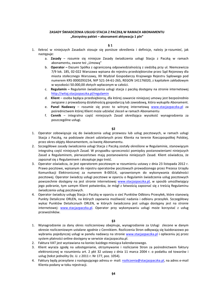 1. 1. 2. 3. 4. 1. 2. 3. 4. ZASADY ŚWIADCZENIA USŁUGI STACJA Z PACZKĄ W RAMACH ABONAMENTU „Korzystny pakiet – abonament aktywacja 1 pln” § 1 Ilekroć w niniejszych Zasadach stosuje się poniższe określenia i definicje, należy je rozumieć, jak następuje: a. Zasady – rozumie się niniejsze Zasady świadczenia usługi Stacja z Paczką w ramach abonamentu, zwane też „Umową” b. Operator – Dazumi Spółka z ograniczoną odpowiedzialnością z siedzibą przy ul. Niemcewicza 7/9 lok. 185, 02-‐022 Warszawa wpisana do rejestru przedsiębiorców przez Sąd Rejonowy dla miasta stołecznego Warszawy, XII Wydział Gospodarczy Krajowego Rejestru Sądowego pod numerem KRS 0000293234, NIP 521-‐34-‐61-‐265, REGON 141176020, z kapitałem zakładowym w wysokości 50.000,00 złotych wpłaconym w całości. c. Regulamin – Regulamin świadczenia usługi stacja z paczką dostępny na stronie internetowej http://witaj.stacjazpaczka.pl/regulamin d. Klient – osoba będąca przedsiębiorcą, dla której zawarcie niniejszej umowy jest bezpośrednio związane z prowadzoną działalnością gospodarczą lub zawodową, która wykupiła Abonament. e. Panel Nadawcy – rozumie się przez to witrynę internetową www.stacjazpaczka.pl za pośrednictwem której Klient może udzielać zleceń w ramach Abonamentu f. Cennik – integralna część niniejszych Zasad określająca wysokość wynagrodzenia za poszczególne usługi. §2 Operator zobowiązuje się do świadczenia usług przewozu lub usług pocztowych, w ramach usługi Stacja z Paczką, na podstawie zleceń udzielanych przez Klienta na terenie Rzeczpospolitej Polskiej, przez okres objęty Abonamentem, za kwotę Abonamentu. Szczegółowe zasady świadczenia usługi Stacja z Paczką zostały określone w Regulaminie, stanowiącym integralną część niniejszych Zasad. W przypadku sprzeczności pomiędzy postanowieniami niniejszych Zasad a Regulaminem, pierwszeństwo mają postanowienia niniejszych Zasad. Klient oświadcza, że zapoznał się z Regulaminem i akceptuje jego treść. Operator oświadcza, że jest operatorem pocztowym w rozumieniu ustawy z dnia 23 listopada 2012 r. Prawo pocztowe, wpisanym do rejestru operatorów pocztowych prowadzonego przez Prezesa Urzędu Komunikacji Elektronicznej za numerem B-‐00514, uprawnionym do wykonywania działalności pocztowej. Operator świadczy usługi pocztowe w oparciu o Regulamin świadczenia usług pocztowych powszechnie dostępny na jest stronie internetowej www.stacjazpaczka.pl, w sposób umożliwiający jego pobranie, tym samym Klient potwierdza, że mógł z łatwością zapoznać się z treścią Regulaminu świadczenia usług pocztowych. Operator świadczy usługę Stacja z Paczką w oparciu o sieć Punktów Odbioru Przesyłek, które stanowią Punkty Detaliczne ORLEN, na których zapewnia możliwość nadania i odbioru przesyłek. Szczegółowy wykaz Punktów Detalicznych ORLEN, w których świadczona jest usługa dostępny jest na stronie internetowej: www.stacjazpaczka.pl. Operator przy wykonywaniu usługi może korzystać z usług przewoźników. §3 Wynagrodzenie za dany okres rozliczeniowy obejmuje, wynagrodzenie za Usługi zlecone w danym okresie rozliczeniowym ustalane zgodnie z Cennikiem. Rozliczenia Stron odbywają się każdorazowo po wybraniu pojedynczej usługi w panelu nadawcy na stronie www.stacjazpaczka.pl i opłaceniu jej przez system płatności online dostępny w serwisie stacjazpaczka.pl. Faktura VAT jest wystawiana na koniec każdego miesiąca kalendarzowego. Klient wyraża zgodę na udostępnianie, otrzymywanie i rozliczanie Stron za pośrednictwem faktury elektronicznej w rozumieniu art. 2 pkt 32 ustawy z dnia 11 marca 2004 r. o podatku od towarów i usług (tekst jednolity Dz. U. z 2011 r. Nr 177, poz. 1054). Faktury będą przesyłane z następującego adresu e-‐ mail: [email protected], na adres e-‐mail Klienta podany w toku rejestracji. §4 1. Klient zleca Usługę wyłącznie za pośrednictwem Panelu Nadawcy, po utworzeniu bezpłatnego Konta i po zalogowaniu podając unikalny login i hasło. Szczegółowe zasady korzystania a Panelu Nadawcy oraz zlecenia usług za jego pośrednictwem zostały opisane w Regulaminie. 2. Warunkiem aktywowania Panelu Nadawcy – uruchomienia możliwości dokonywania zleceń, o których mowa w ust. 1, jest prawidłowa wpłata przez Klienta kwoty aktywacji w wysokości 1 pln (jeden złotych), przy czym za prawidłową wpłatę uważa się wyłącznie wpłatę dokonaną przelewem na rachunek Dazumi w PKO BP S.A. o numerze 79 1020 1169 0000 8502 0188 9914, nadaną z rachunku bankowego Klienta tj. rachunku do którego przyporządkowane są te same dane, co podane przy tworzeniu bezpłatnego Konta, o którym mowa w ust. 1. Wpłatę uważa się za dokonaną z chwila uznania rachunku bankowego Dazumi. 3. Klient uprawniony jest do korzystania z Panelu Nadawcy wyłącznie w celu zlecenia Usług. . §5 1. Umowa zawarta jest na czas nieoznaczony. 2. Dazumi jest uprawnione do rozwiązania niniejszej Umowy w trybie natychmiastowym w przypadku opóźnienia Nadawcy w zapłacie należności trwającego dłużej niż trzydzieści dni od daty płatności. 3. Każda ze stron może rozwiązać niniejszą umowę za 1 miesięcznym okresem wypowiedzenia, ze skutkiem na koniec ostatniego okresu rozliczeniowego. 4. Klient wyraża zgodę na przesyłanie przez Operatora informacji handlowych o produktach i usługach Operatora na adres e-‐mail podany w formularzu rejestracyjnym. 5. Wszelkie spory wynikające z realizacji postanowień niniejszej Umowy strony będą próbowały załatwić na drodze polubownej i będą poddane pod rozstrzygnięcie właściwemu sądowi powszechnemu zgodnie z właściwością dla siedziby Operatora. Cennik usług abonamentowych „Korzystny pakiet – abonament aktywacja 1 pln”* 1.1. Paczka standard 13,99 1.2. Paczka gwarantowana 15,99 1.3. Paczka gwarantowana z dostawą w sobotę 15,99 + 10,00 1.4. Paczka gwar