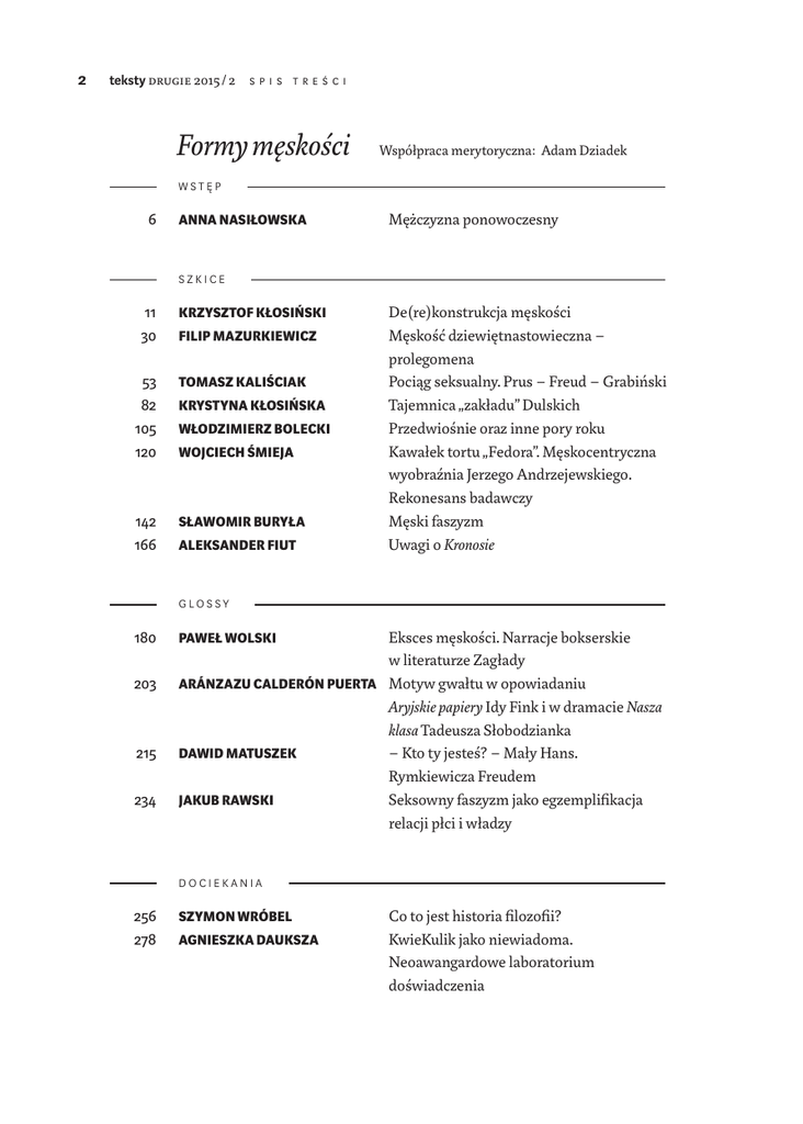 2 teksty drugie 2015 / 2 S P I S T R E Ś C I Formy męskości WSTĘP 6 ANNA NASIŁOWSKA SZKICE KRZYSZTOF KŁOSIŃSKI 53 82 105 120 TOMASZ KALIŚCIAK 142 166 SŁAWOMIR BURYŁA GLOSSY 180 203 215 234 256 278 Mężczyzna ponowoczesny 11 30 Współpraca merytoryczna: Adam Dziadek FILIP MAZURKIEWICZ KRYSTYNA KŁOSIŃSKA WŁODZIMIERZ BOLECKI WOJCIECH ŚMIEJA ALEKSANDER FIUT De(re)konstrukcja męskości Męskość dziewiętnastowieczna – prolegomena Pociąg seksualny. Prus – Freud – Grabiński Tajemnica „zakładu” Dulskich Przedwiośnie oraz inne pory roku Kawałek tortu „Fedora”. Męskocentryczna wyobraźnia Jerzego Andrzejewskiego. Rekonesans badawczy Męski faszyzm Uwagi o Kronosie ksces męskości. Narracje bokserskie E w literaturze Zagłady ARÁNZAZU CALDERÓN PUERTA Motyw gwałtu w opowiadaniu Aryjskie papiery Idy Fink i w dramacie Nasza klasa Tadeusza Słobodzianka DAWID MATUSZEK – Kto ty jesteś? – Mały Hans. Rymkiewicza Freudem JAKUB RAWSKI Seksowny faszyzm jako egzemplifikacja relacji płci i władzy PAWEŁ WOLSKI DOCIEKANIA SZYMON WRÓBEL AGNIESZKA DAUKSZA o to jest historia filozofii? C KwieKulik jako niewiadoma. Neoawangardowe laboratorium doświadczenia 303 MAŁGORZATA FIDELIS 324 ALEKSANDRA NIKČEVIĆ- -BATRIĆEVIĆ 336 AGNIESZKA WRÓBEL P R E Z E N TA C J E zy jesteś nowoczesną dziewczyną? C Młode Polki a kultura konsumpcyjna w latach 60. Zachodnia feministyczna krytyka i literatura w Czarnogórze „Rozhisteryzowany swoją niemocą” – męskość w twórczości Tadeusza Konwickiego (na podstawie Sennika współczesnego) 353 KALLE BERGGREN 381 GUNNAR KARLSSON 408 RAEWYN CONNELL 431 ERIC ANDERSON ROZTRZĄSANIA I ROZBIORY HAYDEN WHITE S ny z Auschwitz Przeł. J. Tabaszewska O potrzebie badań nad męskością Degradacja i rewolucja 445 455 SŁAWOMIR BURYŁA 464 KATARZYNA NADANA- -SOKOŁOWSKA 473 ELŻBIETA KONOŃCZUK 480 WSPOMNIENIA DANUTA ULICKA epka męskość: poststrukturalizm, L fenomenologia i podmiotowość w krytycznych studiach nad męskością Przeł. W. Śmieja Męskość jako projekt: kilka uwag psychoanalitycznych Przeł. F. Mazurkiewicz Margines staje się centrum: studia nad męskością w perspektywie światowej Przeł. A. Dziadek Teoria męskości inkluzywnej Przeł. P. Sobolczyk Czarne kobiety w narracjach biograficznych Księgi i opowieści