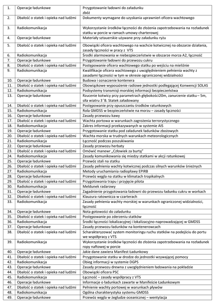 1. Operacje ładunkowe 2. Dbałośd o statek i opieka nad ludźmi 3. Radiokomunikacja 4. Operacje ładunkowe 5. Dbałośd o statek i opieka nad ludźmi 6. 7. 8. 9. Radiokomunikacja Operacje ładunkowe Dbałośd o statek i opieka nad ludźmi Radiokomunikacja 10. 11. 12. 13. Operacje ładunkowe Dbałośd o statek i opieka nad ludźmi Radiokomunikacja Operacje ładunkowe 14. 15. 16. 17. 18. 19. 20. 21. 22. 23. 24. 25. 26. 27. 28. 29. 30. 31. 32. 33. Dbałośd o statek i opieka nad ludźmi Radiokomunikacja Operacje ładunkowe Dbałośd o statek i opieka nad ludźmi Radiokomunikacja Operacje ładunkowe Dbałośd o statek i opieka nad ludźmi Radiokomunikacja Operacje ładunkowe Dbałośd o statek i opieka nad ludźmi Radiokomunikacja Operacje ładunkowe Dbałośd o statek i opieka nad ludźmi Radiokomunikacja Operacje ładunkowe Dbałośd o statek i opieka nad ludźmi Radiokomunikacja Operacje ładunkowe Dbałośd o statek i opieka nad ludźmi Radiokomunikacja 34. 35. 36. 37. 38. Operacje ładunkowe Dbałośd o statek i opieka nad ludźmi Radiokomunikacja Operacje ładunkowe Dbałośd o statek i opieka nad ludźmi 39. Radiokomunikacja 40. 41. 42. 43. 44. 45. 46. 47. 48. 49. Operacje ładunkowe Dbałośd o statek i opieka nad ludźmi Radiokomunikacja Operacje ładunkowe Dbałośd o statek i opieka nad ludźmi Radiokomunikacja Operacje ładunkowe Dbałośd o statek i opieka nad ludźmi Radiokomunikacja Operacje ładunkowe Przygotowanie ładowni do załadunku zbóż Dokumenty wymagane do uzyskania uprawnieo oficera wachtowego Wykorzystanie środków łączności do złożenia zapotrzebowania na rozładunek statku w porcie w ramach umowy charterowej Materiały sztauerskie używane przy załadunku ryżu Obowiązki oficera wachtowego na wachcie kotwicznej na obszarze działania, zasady łączności w pracy z VTS Środki alarmowania w niebezpieczeostwie w obszarze morza A2, łącznośd Przygotowanie ładowni do przewozu cukru Postępowanie oficera wachtowego statku po wejściu na mieliźnie Kwalifikacje oficera wachtowego z uwzględnieniem pełnienia wachty z zasadami łączności w tym w okresie ograniczonej widzialności Budowa i oznaczenie kontenera Obowiązkowe wyposażenie radiowe jednostki podlegającej Konwencji SOLAS Podsystemy transmisji morskiej informacji bezpieczeostwa Rzucenie kotwicy przy parametrach głębokości20m, zanurzenie statku – 5m, siła wiatru 3 B ̊ . Statek załadowany Postępowanie przy opuszczaniu środków ratunkowych Rola GMDSS w bezpieczeostwie na morzu – zasady łączności Zasady przewozu kawy Wachta portowa w warunkach zagrożenia terrorystycznego Zakres informacji przekazywanych w systemie AIS Przygotowanie statku pod załadunek ładunków zbożowych Wachta morska w trudnych warunkach meteorologicznych Łącznośd podczas poszukiwania Zasady przewozu herbaty Omówid manewr „Człowiek za burtą” Zasady komunikowania się miedzy statkami w akcji ratunkowej Przewóz stali na statku Zasady pełnienia wachty kotwicznej podczas silnych warunków śnieżnych Metody uruchamiania radiopławy EPIRB Przewóz węgla na statku w klimatach tropikalnych Przygotowania trapu i przyjęcie pilota Meldunek radarowy Zagadnienie przygotowania ładowni do przewozu ładunku cukru w workach Klauzura ratownicza w czarterach Zasady pełnienia wachty morskiej w warunkach ograniczonej widzialności, łącznośd Nota gotowości do załadunku Postępowanie po zderzeniu statków Środki łączności lokalizacyjnej i lokalizacyjno-naprowadzającej w GMDSS Zasady przewozu ładunków na kontenerowcach Scharakteryzowad system monitoringu ruchu statków na podejściu do portu we współpracy z VTS Wykorzystanie środków łączności do złożenia zapotrzebowania na rozładunek ropy naftowej w porcie Jakie dane zawiera Manifest Ładunkowy Przygotowanie statku w drodze do jednostki wzywającej pomocy Obieg informacji w systemie DGPS Zasady przewozu drewna z uwzględnieniem ładowania na pokładzie Obowiązki oficera PSC Łącznośd – zasady współpracy z VTS Informacje o ładunkach zawarte w Manifeście Ładunkowym Pełnienie wachty portowej w warunkach pływów Ogólna charakterystyka systemu GMDSS Przewóz węgla w żegludze oceanicznej – wentylacja 50. 51. 52. 53. 54. 55. 56. 57. 58. 59. 60. 61. 62. Dbałośd o statek i opieka nad ludźmi Radiokomunikacja Operacje ładunkowe Dbałośd o statek i opieka nad ludźmi Radiokomunikacja Operacje ładunkowe Dbałośd o statek i opieka nad ludźmi Radiokomunikacja Operacje ładunkowe Dbałośd o statek i opieka nad ludźmi Radiokomunikacja Operacje ładunkowe Dbałośd o statek i opieka nad ludźmi 63. 64. 65. 66. Radiokomunikacja Operacje ładunkowe Dbałośd o statek i opieka nad ludźmi Operacje ładunkowe 67. 68. 69. 70. 71. 72. 73. 74. 75. 76. 77. 78. 79. 80. Dbałośd o statek i opieka nad ludźmi Radiokomunikacja Operacje ładunkowe Dbałośd o statek i opieka nad ludźmi Radiokomunikacja Operacje ładunkowe Dbałośd o statek i opieka nad ludźmi Radiokomunikacja Operacje ładunkowe Dbałośd o statek i opieka nad ludźmi Radiokomunikacja Operacje ładunkowe Dbałośd o statek i opieka nad ludźmi Radiokomunikacja 81. Operacje ładunkowe 82. Dbałośd o statek i opieka nad ludźmi 83. 84. 85. 86. 87. 88. 89. Radiokomunikacja Operacje ładunkowe Dbałośd o statek i opieka nad ludźmi Radiokomunikacja Operacje ładunkowe Dbałośd o statek i opieka nad ludźmi Radiokomunikacja Jakimi dokumentami winien się legitymowad marynarz statku handlowego Łącznośd w czasie poszukiwania rozbitka na morzu Zasady wentylacji obieg powietrza w ładowni Zasady pełnienia wachty nawigacyjnej w morzu Zasady łączności z Centrum Ratowniczym Budowa i wyposażenie kontenera Zasady pełnienia wachty w porcie Środki łączności statku handlowego Przygotowanie statku do pobierania paliwa podczas postoju w porcie Zasada pracy urządzeo dźwigowych na statku Medical-radio – zasady łączności Przewóz cytrusów na statku – chłodniowcu Zasady łączn