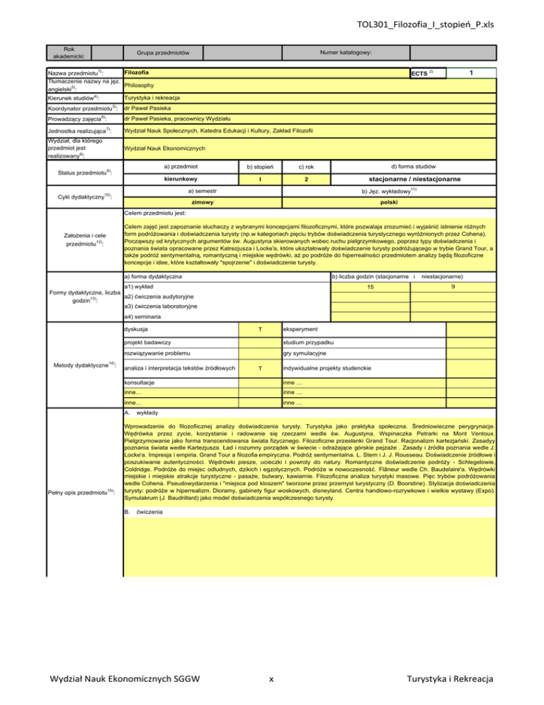 TOL301_Filozofia_I_stopień_P.xls Rok akademicki: Numer katalogowy: Grupa przedmiotów Filozofia Nazwa przedmiotu1): Tłumaczenie nazwy na jęz. Philosophy angielski3): Kierunek studiów4): ECTS 2) 1 Turystyka i rekreacja 5) Koordynator przedmiotu : 6) dr Paweł Pasieka Prowadzący zajęcia : dr Paweł Pasieka, pracownicy Wydziału Jednostka realizująca 7): Wydział Nauk Społecznych, Katedra Edukacji i Kultury, Zakład Filozofii Wydział, dla którego przedmiot jest realizowany8): Wydział Nauk Ekonomicznych Status przedmiotu 9): a) przedmiot b) stopień c) rok kierunkowy I 2 Cykl dydaktyczny10): d) forma studiów stacjonarne / niestacjonarne a) semestr b) Jęz. wykładowy11) zimowy polski Celem przedmiotu jest: Założenia i cele przedmiotu12): Celem zajęć jest zapoznanie słuchaczy z wybranymi koncepcjami filozoficznymi, które pozwalaja zrozumieć i wyjaśnić istnienie różnych form podróżowania i doświadczenia turysty (np.w kategoriach pięciu trybów doświadczenia turystycznego wyróżnionych przez Cohena). Począwszy od krytycznych argumentów św. Augustyna skierowanych wobec ruchu pielgrzymkowego, poprzez typy doświadczenia i poznania świata opracowane przez Katrezjusza i Locke'a, które ukształowały doświadczenie turysty podróżującego w trybie Grand Tour, a także podróż sentymentalną, romantyczną i miejskie wędrówki, aż po podróże do hiperrealności przedmiotem analizy będą filozoficzne koncepcje i idee, które kształtowały "spojrzenie" i doświadczenie turysty. a) forma dydaktyczna b) liczba godzin (stacjonarne i a1) wykład 15 Formy dydaktyczne, liczba a2) ćwiczenia audytoryjne godzin13): a3) ćwiczenia laboratoryjne niestacjonarne) 9 a4) seminaria dyskusja Metody dydaktyczne14): eksperyment T projekt badawczy studium przypadku rozwiązywanie problemu gry symulacyjne analiza i interpretacja tekstów źródłowych indywidualne projekty studenckie T konsultacje inne … inne… inne … A. Pełny opis przedmiotu15): inne … inne… wykłady Wprowadzenie do filozofiicznej analizy doświadczenia turysty. Turystyka jako praktyka społeczna. Średniowieczne perygrynacje. Wędrówka przez zycie, korzystanie i radowanie się rzeczami wedle św. Augustyna. Wspinaczka Petrarki na Mont Ventoux. Pielgrzymowanie jako forma transcendowania świata fizycznego. Filozoficzne przesłanki Grand Tour. Racjonalizm kartezjański. Zasadyy poznania świata wedle Kartezjusza. Ład i rozumny porządek w świecie - odrażające górskie pejzaże . Zasady i źródła poznania wedle J. Locke'a. Impresja i empiria. Grand Tour a filozofia empiryczna. Podróż sentymentalna. L. Stern i J. J. Rousseau. Doświadczenie źródłowe i poszukiwanie autentyczności. Wędrówki piesze, ucieczki i powroty do natury. Romantyczne doświadczenie podróży - Schlegelowie, Coldridge. Podróże do miejsc odludnych, dzikich i egzotycznych. Podróże w nowoczesność. Flâneur wedle Ch. Baudelaire'a. Wędrówki miejskie i miejskie atrakcje turystyczne - pasaże, bulwary, kawiarnie. Filozoficzna analiza turystyki masowe. Pięc trybów podróżowania wedle Cohena. Pseudowydarzenia i "miejsca pod kloszem" tworzone przez przemysł turystyczny (D. Boorstine). Stylizacja doświadczenia turysty: podróże w hiperrealizm. Dioramy, gabinety figur woskowych, disneyland. Centra handlowo-rozrywkowe i wielkie wystawy (Expo). Symulakrum (J. Baudrillard) jako model doświadczenia współczesnego turysty. B. ćwiczenia Wydział Nauk Ekonomicznych SGGW x Turystyka i Rekreacja TOL301_Filozofia_I_stopień_P.xls Wymagania formalne (przedmioty wprowadzające)16): Założenia wstępne17): 01 - Studenci powinni posiąść znajomość wybranych koncepcji filozoficznych, które kształtowały i kształtują praktykę społeczną, jaka jest turystyka 05 - Studenci będą świadomi tego jakie znaczenie mają określone formy spędzania czasu wolnego dla sposobów doświadczania świata oraz jakie jest ich oddziaływanie na stan środowiska przyrodniczego 02 - Studenci powinni poznać podstawowe pojęcia z zakresu typów, form i sposobów doświadczenia świata przez turystę 06 - Efekty kształcenia18): (z kolejnymi numerami, 01, 03 - Studenci będą potrafili zanalizować i ocenić 02, 03 itd.) filozoficzne i kulturowe przesłanki leżące u podstaw określonych form rekreacji i wypoczynku 07 - 04 - Studenci posiądą umiejętność identyfikowania i analizy danych dotyczących form i sposobów spędzania wolnego czasu oraz przedstawią wykonaną analizę kolokwium na zajęciach ćwiczeniowych ocena wykonania zadania projektowego na zdefiniowany temat praca pisemna przygotowywana w ramach pracy własnej studenta ocena wynikająca z obserwacji w trakcie zajęć ocena eksperymentów wykonywanych w Sposób weryfikacji efektów trakcie zajęć 19) kształcenia : ocena wystąpień i prezentacji w trakcie zajęć egzamin pisemny Forma dokumentacji osiągniętych efektów kształcenia 20): przygotowanie zespołowej analizy zdefiniowanego problemu obserwacja w trakcie dyskusji zdefiniowanego problemu (aktywność) 01-05 test komputerowy egzamin ustny inne.. inne… inne.. okresowe prace pisemne imienne karty oceny studenta złożone projekty treść pytań egzaminacyjnych z oceną inne… inne.. inne… inne.. Element oceny Waga w % T Waga w % Element oceny ocena wykonania zadania projektowego na zdefiniowany temat kolokwium na zajęciach ćwiczeniowych Elementy i wagi mające wpływ na ocenę końcową 21): 08 - praca pisemna przygotowywana w ramach pracy własnej studenta ocena wynikająca z obserwacji w trakcie zajęć ocena eksperymentów wykonywanych w trakcie zajęć przygotowanie zespołowej analizy zdefiniowanego problemu ocena wystąpień i prezentacji w trakcie zajęć obserwacja w trakcie dyskusji zdefiniowanego problemu (aktywność) egzamin pisemny test 100% egzamin ustny inne.. inne… inne.. 22) Sala dydaktyczna Miejsce realizacji zajęć : Wydział Nauk Ekonomicznych SGGW x Turystyka i Rekreacja TOL301_Filozo