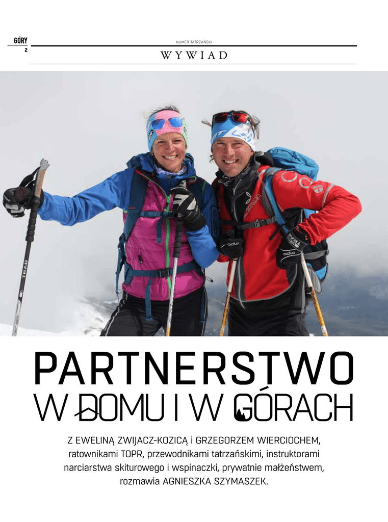 NUMER TATRZAŃSKI 2 WYWIAD PARTNERSTWO W DOMU I W GÓRACH Z EWELINĄ ZWIJACZ-KOZICĄ i GRZEGORZEM WIERCIOCHEM, ratownikami TOPR, przewodnikami tatrzańskimi, instruktorami narciarstwa skiturowego i wspinaczki, prywatnie małżeństwem, rozmawia AGNIESZKA SZYMASZEK. NUMER TATRZAŃSKI 3 KTO U WAS PROWADZI AUTO? Grzesiek: Mamy dwa... . Ewelina: Obydwa prowadzi Grześ. Ja tego nie lubię, więc generalnie z wygodnictwa cieszę się, że przejął inicjatywę... TO TROCHĘ ZAWOALOWANE PYTANIE O DOMINACJĘ W ZWIĄZKU. BO PRZECIEŻ RAZEM PRACUJECIE W GÓRACH, CO WYMAGA PODEJMOWANIA DECYZJI, I TO TRUDNYCH. CZY TO PRZENOSI SIĘ NA ŻYCIE NA DOLE? Ewelina: Jestem bardzo silną kobietą, mam mocną osobowość. Natomiast mój mąż – i to jest jego wielki sukces – odkrył we mnie kobiecość, uświadomił, że mam kilka twarzy. Nie zdawałam sobie z tego sprawy. Pierwsza, gdy działam w górach: skoncentrowana, silna, konkretna. Druga, kiedy wrócę do domu i przestaję być partnerem górskim, a staję się kobietą, żoną, matką, ubieram się w coś eleganckiego, maluję... Grzesiek: Przychodzi wieczór – nie poznaję jej, jest delikatna, da się nawet przytulić . Ewelina: A co! Pewnie! Uwielbiam być kobieca, uwielbiam gotować, dbać o dom i rodzinę. Oczywiście wszystko zależy od tego, w jakiej sferze działam. Co innego być kobietą w domu, a co innego w górach. Na obu tych płaszczyznach ważne jest partnerstwo, niemniej ważne są inne rzeczy. Uzupełniamy się! Grzesiek: Czasami trzeba przekazać „lejce” komuś innemu . Ewelina: Dokładnie tak. Wiem, że mam przy sobie stuprocentowego chłopa, poddałam się temu całkowicie. Dominuję, gdy sytuacja tego wymaga, albo mam lepszy dzień niż Grześ. W prozaicznych sytuacjach życiowych bardzo się cieszę, gdy to on przejmuje inicjatywę. Byłam przyzwyczajona do tego, że wymaga się ode mnie bycia zawsze silną, konkretną, podejmującą każdą, nawet trudną decyzję samodzielnie. Natomiast okazało się, że można trochę przełamać schemat i oddzielić te dwie role. One się ze sobą zupełnie nie muszą łączyć. To jest fajne, bo... fajnie czuć się prawdziwą, docenianą kobietą i żoną. PRZEWODNICKO, INSTRUKTORSKO – DZIAŁACIE RAZEM CZY OSOBNO? Grzesiek: Po pewnym czasie okazało się, że zawodowo świetnie się uzupełniamy. CoZdjęcie po lewej: W raz częściej działamy więc razem. Można powiedzieć, że wszystko zostaje w rodzinie, bo wymieniamy się wycieczkami lub prowadzimy je wspólnie. Wiele zależy też od tego, kto ma jaki dzień i na jakiej płaszczyźnie lepiej się czuje. Ewelina: Każdy z nas ma swoje „działki”. Grześ jest lepszy w etnografii, a ja wolę wyższe partie gór i lepiej znam Tatry Słowackie. Gdy mamy wspólne grupy lub indywidualnych klientów, chętnie zostawiam Grzesiowi opowieści o historii czy legendy, a on mi na przykład topografię Tatr Słowackich czy rejony wspinaczkowe. On fantastycznie jeździ na nartach i świetnie biega. Grzesiek: Natomiast Ewelina, do czego się bez problemu przyznaję, jest dużo lepsza w skałach, lepiej się wspina. NIE MA MIĘDZY WAMI KONKURENCJI? POTRAFICIE ODPUŚCIĆ PRZY KLIENTACH? Grzesiek: Na początku patrzyliśmy na siebie z boku i się obserwowaliśmy – musieliśmy poznać swoje umiejętności, zaufać sobie w górach. To oczywiste, że każdy z nas ma nawyki, przyzwyczajenia. Po pewnym czasie zaczęliśmy się od siebie uczyć. Ona ma zupełnie inne podejście do pewnych spraw jako kobieta. Ewelina: Barierę lęku mamy też na innym poziomie. Ja czasem jestem skłonna bardziej ryzykować, a Grześ bardziej hamuje. Generalnie w ogóle ze sobą nie rywalizujemy. Nie ingeruję w tematy, w których on radzi sobie lepiej. Na przykład kiedy zimą prowadzę szkolenia skiturowe, jemu oddaję tematy dotyczące lawin. Uważam, że świetnie się uzupełniamy, i to jest fajne. Nie można być omnibusem. Jesteśmy dobrym duetem, bo każdy szlifuje dziedziny, w których lepiej się czuje, a także dlatego, że uczymy się od siebie wzajemnie. NIE KŁÓCICIE SIĘ W PRACY? DLACZEGO TUTAJ TAKI WĘZEŁ, ALBO DLACZEGO TĘDY, A NIE TAMTĘDY? Grzesiek: Nie. Czasem Ewelina obiera inną technikę, niż ja bym wybrał. Potem po pracy, w domu albo w drodze powrotnej, omawiamy dane działanie. Wszystko oczywiście jest robione bezpiecznie, ale czasem po prostu wykorzystujemy inne rozwiązania. Ewelina: Jeżeli Grześ podjął decyzję, że lepiej się wycofać, to ja to przyjmuję i nie ma dla mnie problemu, pomimo że czasem uważam, że moglibyśmy napierać. NIE OBRAŻASZ SIĘ, ŻE TWÓJ MĄŻ ZROBIŁ COŚ INACZEJ NIŻ TY? :) Ewelina: Nie, tu chodzi o bezpieczeństwo. Nie odbieram tego tak, że mnie nie posłucha, choć oczywiście nie robię wtedy tak dobrej kolacji . Grzesiek: Jeśli opracowujemy plan działania, to nie przy klientach. Ewelina: Chociaż na początku naszej wspólnej działalności górskiej zdarzyło się, że odeszliśmy na bok, by przedyskutować strategię. Pamiętam, że warunki były wówczas wymagające, a klienci okazali się słabi kondycyjnie. Mieliśmy, delikatnie mówiąc, inne pomysły dotyczące dalszych działań . Wynikało to z faktu, że się jeszcze dobrze nie znaliśmy. Musieliśmy się górsko dotrzeć. Dzisiaj ze sobą nie dyskutujemy, Grześ wie, że w trudnych momentach zawsze podejmuję właściwe decyzje. To działa też oczywiście w drugą stronę. Najfajniejsze jest to, że w razie potrzeby ja studzę jego, a on mnie . Grzesiek: Kluczowa jest tu kwestia zaufania. Wiem, że w sytuacjach podwyższonego ryzyka Ewelina da sobie radę. Ewelina: Oboje jesteśmy ratownikami i wiemy, że zbyt ryzykowne decyzje mogą skończyć się źle. Mamy też już swoje lata, dzieci, obowiązki. W każdej sytuacji kierujemy się przede wszystkim względami bezpieczeństwa. Góry mają nas łączyć i sprawiać frajdę, a nie dzielić i powodować konflikty. Odkąd zaczęliśmy razem pracować, możliwości jest coraz 