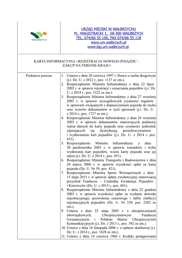 URZĄD MIEJSKI W WAŁBRZYCHU PL. MAGISTRACKI 1, 58-300 WAŁBRZYCH TEL. 074/66 55 100, FAX 074/66 55 118 www.um.walbrzych.pl www.bip.um.walbrzych.pl KARTA INFORMACYJNA <REJESTRACJA NOWEGO POJAZDU – ZAKUP NA TERENIE KRAJU> Podstawa prawna 1. Ustawa z dnia 20 czerwca 1997 r. Prawo o ruchu drogowym (j.t. Dz. U. z 2012 r., poz. 1137 ze zm.). 2. Rozporządzenie Ministra Infrastruktury z dnia 22 lipca 2002 r. w sprawie rejestracji i oznaczania pojazdów (j.t. Dz. U. z 2014 r., poz. 1522 ze zm.). 3. Rozporządzenie Ministra Infrastruktury z dnia 27 września 2003 r. w sprawie szczegółowych czynności organów w sprawach związanych z dopuszczeniem pojazdu do ruchu oraz wzorów dokumentów w tych sprawach (j.t. Dz. U. z 2014 r., poz. 1727 ze zm.). 4. Rozporządzenie Ministra Infrastruktury z dnia 24 września 2003 r. w sprawie dokumentów stanowiących podstawę wpisu danych do karty pojazdu oraz czynności jednostek zajmujących się dystrybucją, przechowywaniem i wydawaniem kart pojazdów (j.t. Dz. U. z 2014 r. poz. 431). 5. Rozporządzenie Ministra Infrastruktury z dnia 20 października 2003 r. w sprawie warunków i trybu wydawania kart pojazdów, wzoru karty pojazdu oraz jej opisu (j.t. Dz. U. z 2014 r., poz. 451). 6. Rozporządzenie Ministra Transportu i Budownictwa z dnia 28 marca 2006 r. w sprawie wysokości opłat za kartę pojazdu (Dz. U. Nr 59, poz. 421). 7. Rozporządzenie Ministra Spraw Wewnętrznych z dnia 15 maja 2015 r. w sprawie opłaty ewidencyjnej stanowiącej przychód Funduszu – Centralna Ewidencja Pojazdów i Kierowców (Dz. U. z 2015 r., poz. 681). 8. Rozporządzenie Ministra Infrastruktury z dnia 22 grudnia 2003 r. w sprawie wysokości opłat za wydanie dowodu rejestracyjnego, pozwolenia czasowego i tablic (tablicy) rejestracyjnych pojazdów (Dz. U. Nr 230, poz. 2302 ze zm.). 9. Ustawa z dnia 22 maja 2003 r. o ubezpieczeniach obowiązkowych, Ubezpieczeniowym Funduszu Gwarancyjnym i Polskim Biurze Ubezpieczycieli Komunikacyjnych (j.t. Dz. z 2013 r., poz. 392 ze zm.). 10. Ustawa z dnia 16 listopada 2006 r. o opłacie skarbowej (j.t. Dz. U. z 2014 r., poz. 1628 ze zm.). 11. Ustawa z dnia 14 czerwca 1960 r. Kodeks postępowania administracyjnego (j.t. Dz. U. z 2013 r., poz. 267 ze zm.). Wymagane dokumenty Do wniosku o rejestrację pojazdu należy dołączyć: 1. oryginał dowodu własności pojazdu (umowa kupnasprzedaży, faktura VAT itp.), 2. wyciąg ze świadectwa homologacji albo odpis decyzji zwalniającej pojazd z homologacji ,jeżeli jest wymagana 3. kartę pojazdu, 4. dokument potwierdzający zapłatę akcyzy na terytorium kraju albo dokument potwierdzający brak obowiązku zapłaty akcyzy na terytorium kraju albo zaświadczenie stwierdzające zwolnienie od akcyzy, w rozumieniu przepisów o podatku akcyzowym,jeżeli samochód osobowy lub pojazd rodzaju"samochodowy inny", podrodzaj"czterokołowiec"(kat. homologacyjna L7e) lub podrodzaj "czterokołowiec lekki" (kat. homologacyjna L6e) został sprowadzony z terytorium państwa członkowskiego UE i jest rejestrowany po raz pierwszy, 5.w przypadku nabycia samochodu osobowego lub pojazd rodzaju "samochodowy inny", porodzaj" czterokołowiec" (kat. homologacyjna L7e) lub podrodzaj "czterokołowiec lekki" (kat. Homologacyjna L6e) od wyspecjalizowanego salonu sprzedaży w rozumieniu przepisów o podatku akcyzowym, dokument potwierdzający zapłatę akcyzy na terytorium kraju może być zastąpiony oświadczeniem wyspecjalizowanego slaonu sprzedaży, że posiada oryginał lub kopię dokumentu potwerdzającego zapłatę akcyzy na terytorium kraju od tego samochodu osobowego lub pojazdu, 6. pełnomocnictwo – w przypadku działania przez pełnomocnika (oryginał lub urzędowo poświadczony odpis pełnomocnictwa art. 33 § 3 Kpa). Jeżeli pojazd stanowi współwłasność – wszelkie sprawy związane z jego rejestracją załatwiają wszyscy współwłaściciele, bądź ich pełnomocnik/pełnomocnicy. Należy przedstawić do wglądu: - dowód osobisty, - aktualny odpis z Krajowego Rejestru Sądowego (KRS) oraz zaświadczenie REGON (dotyczy podmiotów posiadających osobowość prawną), - zaświadczenie o wpisie do ewidencji działalności gospodarczej (wpisy do ewidencji działalności gospodarczej wszystkich wspólników) – dotyczy osób prowadzących działalność gospodarczą, Wzory dokumentów do pobrania Wniosek o rejestrację, czasową rejestrację albo wyrejestrowanie (zał. Nr 1 do rozporządzenia Ministra Infrastruktury z dnia 22 lipca 2002 r. w sprawie rejestracji i oznaczania pojazdów (j.t. Dz. U. z 2014 r., poz. 1522). Komórka odpowiedzialna Biuro Komunikacji za prowadzenie sprawy tel. 74 64 88 577, fax: 74 64 88 585 Miejsce składania dokumentów Biuro Komunikacji jest usytuowane w pobliżu Ratusza – róg ulicy Sienkiewicza i Placu Magistrackiego - ul. Henryka Sienkiewicza 9 – wejście „A”. Biuro Komunikacji przyjmuje klientów: w poniedziałki, środy i czwartki w godzinach od 7.30 do 15.30, we wtorki od 7.30 do 16.30, w piątki od 7.30 do 14.30. Termin załatwienia sprawy Niezwłocznie, nie później niż w ciągu miesiąca, a w przypadku sprawy szczególnie skomplikowanej nie później niż w ciągu dwóch miesięcy. Opłaty - samochód – 80,00 zł (tablice rejestracyjne), - motocykl – 40,00 zł (tablica rejestracyjna), - motorower – 30,00 zł (tablica rejestracyjna), - przyczepa – 40,00 zł, - tablice indywidualne – 1.000,00 zł, - tablice zabytkowe samochodowe – 100,00 zł, - tablice zabytkowe motocyklowe – 50,00 zł, - pozwolenie czasowe – 13,50 zł (wydawane z urzędu – po złożeniu wniosku o rejestrację pojazdu) + 0,50 zł (opłata ewidencyjna), - pozwolenie czasowe – 18,50 zł (wydane na wniosek właściciela pojazdu – w celu umożliwienia: wywozu pojazdu za granicę; przejazdu pojazdu z miejsca jego zakupu lub odbioru na teryt. RP; przejazdu pojazdu związanego z koniecznością dokonania jego badania technicznego lub naprawy) + 0,50 zł (opłata ewidencyjna), - dow