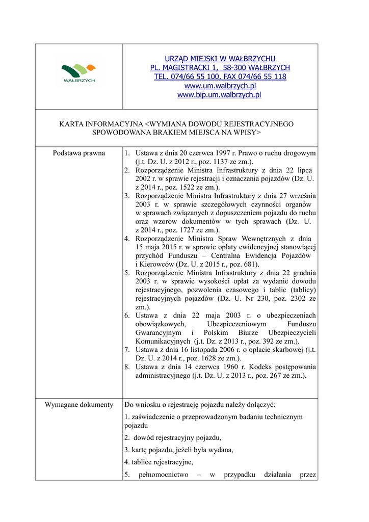 URZĄD MIEJSKI W WAŁBRZYCHU PL. MAGISTRACKI 1, 58-300 WAŁBRZYCH TEL. 074/66 55 100, FAX 074/66 55 118 www.um.walbrzych.pl www.bip.um.walbrzych.pl KARTA INFORMACYJNA <WYMIANA DOWODU REJESTRACYJNEGO SPOWODOWANA BRAKIEM MIEJSCA NA WPISY> Podstawa prawna Wymagane dokumenty 1. Ustawa z dnia 20 czerwca 1997 r. Prawo o ruchu drogowym (j.t. Dz. U. z 2012 r., poz. 1137 ze zm.). 2. Rozporządzenie Ministra Infrastruktury z dnia 22 lipca 2002 r. w sprawie rejestracji i oznaczania pojazdów (Dz. U. z 2014 r., poz. 1522 ze zm.). 3. Rozporządzenie Ministra Infrastruktury z dnia 27 września 2003 r. w sprawie szczegółowych czynności organów w sprawach związanych z dopuszczeniem pojazdu do ruchu oraz wzorów dokumentów w tych sprawach (Dz. U. z 2014 r., poz. 1727 ze zm.). 4. Rozporządzenie Ministra Spraw Wewnętrznych z dnia 15 maja 2015 r. w sprawie opłaty ewidencyjnej stanowiącej przychód Funduszu – Centralna Ewidencja Pojazdów i Kierowców (Dz. U. z 2015 r., poz. 681). 5. Rozporządzenie Ministra Infrastruktury z dnia 22 grudnia 2003 r. w sprawie wysokości opłat za wydanie dowodu rejestracyjnego, pozwolenia czasowego i tablic (tablicy) rejestracyjnych pojazdów (Dz. U. Nr 230, poz. 2302 ze zm.). 6. Ustawa z dnia 22 maja 2003 r. o ubezpieczeniach obowiązkowych, Ubezpieczeniowym Funduszu Gwarancyjnym i Polskim Biurze Ubezpieczycieli Komunikacyjnych (j.t. Dz. z 2013 r., poz. 392 ze zm.). 7. Ustawa z dnia 16 listopada 2006 r. o opłacie skarbowej (j.t. Dz. U. z 2014 r., poz. 1628 ze zm.). 8. Ustawa z dnia 14 czerwca 1960 r. Kodeks postępowania administracyjnego (j.t. Dz. U. z 2013 r., poz. 267 ze zm.). Do wniosku o rejestrację pojazdu należy dołączyć: 1. zaświadczenie o przeprowadzonym badaniu technicznym pojazdu 2. dowód rejestracyjny pojazdu, 3. kartę pojazdu, jeżeli była wydana, 4. tablice rejestracyjne, 5. pełnomocnictwo – w przypadku działania przez pełnomocnika (oryginał lub urzędowo poświadczony odpis pełnomocnictwa art. 33 § 3 Kpa). Jeżeli pojazd stanowi współwłasność – wszelkie sprawy związane z jego rejestracją załatwiają wszyscy współwłaściciele, bądź ich pełnomocnik/pełnomocnicy. Należy przedstawić do wglądu: - dowód osobisty, - aktualny odpis z Krajowego Rejestru Sądowego (KRS) oraz zaświadczenie REGON (dotyczy podmiotów posiadających osobowość prawną), - zaświadczenie o wpisie do ewidencji działalności gospodarczej (wpisy do ewidencji działalności gospodarczej wszystkich wspólników) – dotyczy osób prowadzących działalność gospodarczą, Wzory dokumentów do pobrania Wniosek o rejestrację, czasową rejestrację albo wyrejestrowanie (zał. Nr 1 do rozporządzenia Ministra Infrastruktury z dnia 22 lipca 2002 r. w sprawie rejestracji i oznaczania pojazdów (j.t. Dz. U. z 2014 r., poz. 1522). Komórka odpowiedzialna Biuro Komunikacji za prowadzenie sprawy tel. 74 64 88 577, fax: 74 64 88585 Miejsce składania dokumentów Biuro Komunikacji jest usytuowane w pobliżu Ratusza – róg ulicy Sienkiewicza i Placu Magistrackiego - ul. Henryka Sienkiewicza 9 – wejście „A”. Biuro Komunikacji przyjmuje klientów: w poniedziałki, środy i czwartki w godzinach od 7.30 do 15.30, we wtorki od 7.30 do 16.30, w piątki od 7.30 do 14.30. Termin załatwienia sprawy Niezwłocznie, nie później niż w ciągu miesiąca, a w przypadku sprawy szczególnie skomplikowanej nie później niż w ciągu dwóch miesięcy. Opłaty - samochód – 80,00 zł (tablice rejestracyjne), - motocykl – 40,00 zł (tablica rejestracyjna), - motorower – 30,00 zł (tablica rejestracyjna), - przyczepa – 40,00 zł, - tablice indywidualne – 1.000,00 zł, - tablice zabytkowe samochodowe – 100,00 zł, - tablice zabytkowe motocyklowe – 50,00 zł, - pozwolenie czasowe – 13,00 zł (wydawane z urzędu – po złożeniu wniosku o rejestrację pojazdu + 0,50 zł (opłata ewidencyjna), lub 18,50zł (wydane na wniosek właściciela pojazdu – w celu umożliwienia: wywozu pojazdu za granicę; przejazdu pojazdu z miejsca jego zakupu lub odbioru na teryt. RP; przejazdu pojazdu związanego z koniecznością dokonania jego badania technicznego lub naprawy) + 0,50 zł (opłata ewidencyjna), - dowód rejestracyjny – 54,00 zł + 0,50 zł (opłata ewidencyjna), - komplet znaków legalizacyjnych – 12,50 zł + 0,50 (opłata ewidencyjna), - nalepka kontrolna na szybę – 18,50 zł + 0,50 zł (opłata ewidencyjna), - karta pojazdu – 75,00 zł + 0,50 zł (opłata ewidencyjna). Przykładowa opłata: -samochód osobowy, ciągnik siodłowy, motocykl, quad, przyczepa, ciągnik rolniczy, motorower – 81,00 zł Tryb odwoławczy Odwołanie od decyzji można wnieść w terminie 14 dni od dnia jej otrzymania do Samorządowego Kolegium Odwoławczego w Wałbrzychu za pośrednictwem Prezydenta Miasta Wałbrzycha. Informacje dodatkowe Opłatę za rejestrację pojazdu należy uiścić na konto Urzędu Miejskiego w Wałbrzychu: Bank Handlowy w Warszawie 80 1030 1289 0000 0000 9000 0756. Opłatę skarbową za pełnomocnictwo w wysokości 17,00 zł od każdego stosunku pełnomocnictwa uiszcza się na konto Urzędu Miejskiego w Wałbrzychu: Bank Handlowy w Warszawie 95 1030 1289 0000 0000 9000 0098. Opłaty skarbowej za pełnomocnictwo nie pobiera się jeżeli udzielane jest małżonkowi, wstępnemu, zstępnemu lub rodzeństwu. W Biurze Obsługi Klienta przy ul. H. Sienkiewicza 6-8 znajduje się PUNKT KASOWY, który przyjmuje – bez prowizji – wszelkie opłaty na konto dochodów Gminy Wałbrzych. Punkt Kasowy jest czynny od godz. 7.30 do 16.00 z przerwą od 13.00 do 13.30. Oryginał dowodu wniesionej opłaty należy dołączyć do wniosku o rejestrację. Istnieje możliwość rezerwacji kolejki przez internet pod adresem: http://www.um.walbrzych.pl/rejestracja/ Na życzenie klienta wysyłane jest powiadomienie SMS lub e-mail o możliwości odbioru dowodu rejestracyjnego.
