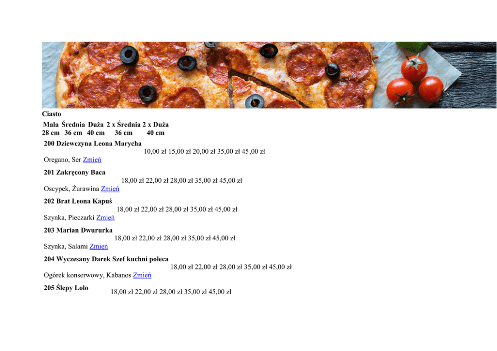 Ciasto Mała Średnia Duża 2 x Średnia 2 x Duża 28 cm 36 cm 40 cm 36 cm 40 cm 200 Dziewczyna Leona Marycha Oregano, Ser Zmień 201 Zakręcony Baca Oscypek, Żurawina Zmień 202 Brat Leona Kapuś Szynka, Pieczarki Zmień 203 Marian Dwururka Szynka, Salami Zmień 10,00 zł 15,00 zł 20,00 zł 35,00 zł 45,00 zł 18,00 zł 22,00 zł 28,00 zł 35,00 zł 45,00 zł 18,00 zł 22,00 zł 28,00 zł 35,00 zł 45,00 zł 18,00 zł 22,00 zł 28,00 zł 35,00 zł 45,00 zł 204 Wyczesany Darek Szef kuchni poleca Ogórek konserwowy, Kabanos Zmień 205 Ślepy Lolo 18,00 zł 22,00 zł 28,00 zł 35,00 zł 45,00 zł 18,00 zł 22,00 zł 28,00 zł 35,00 zł 45,00 zł Oliwki , Salami Zmień 206 Cinkciarz Stefan vel Dolar Ananas, Szynka Zmień 207 Miro Cichacz Cebula, Boczek Zmień 18,00 zł 22,00 zł 28,00 zł 35,00 zł 45,00 zł 18,00 zł 22,00 zł 28,00 zł 35,00 zł 45,00 zł 208 Jan Kurołap Kurczak, Ananas Zmień 209 Florek Marynarz Małże, Krewetki Zmień 18,00 zł 22,00 zł 28,00 zł 35,00 zł 45,00 zł 18,00 zł 22,00 zł 28,00 zł 35,00 zł 45,00 zł 210 Boguś Niewypał 2 dowolne składniki Zmień 18,00 zł 22,00 zł 28,00 zł 35,00 zł 45,00 zł 211 Pół na Pół po dwa składniki na każdej połówce 4 dowolne składniki Zmień 301 Dusigrosz Antek Szynka, Cebula, Boczek Zmień 21,00 zł 25,00 zł 31,00 zł 41,00 zł 51,00 zł 302 Romek donosiciel Pleśniowy, Feta, Oscypek Zmień 303 Kwasigroch Zenek 20,00 zł 24,00 zł 30,00 zł 37,00 zł 47,00 zł 21,00 zł 25,00 zł 31,00 zł 41,00 zł 51,00 zł 21,00 zł 25,00 zł 31,00 zł 41,00 zł 51,00 zł Szynka, Papryka, Pieczarki Zmień 304 Zakręcony Marek Salami, Peperoni, Papryka jalapeno Zmień 305 Słodka Olivia kochanka Leona Oliwki , Salami, Pieczarki Zmień 21,00 zł 25,00 zł 31,00 zł 41,00 zł 51,00 zł 21,00 zł 25,00 zł 31,00 zł 41,00 zł 51,00 zł 306 Wiejski Papaj Boczek, Szpinak, Suszone pomidory Zmień 307 Bodzio Pleśniak Pomidor, Pleśniowy, Kabanos Zmień 308 Marian Sierota Kabanos, Ananas, Oliwki Zmień Tuńczyk, Małże, Krewetki Zmień 3 dowolne składniki Zmień 21,00 zł 25,00 zł 31,00 zł 41,00 zł 51,00 zł 21,00 zł 25,00 zł 31,00 zł 41,00 zł 51,00 zł 309 Mietek Wazelina 310 Komisarz Ciapak 21,00 zł 25,00 zł 31,00 zł 41,00 zł 51,00 zł 21,00 zł 25,00 zł 31,00 zł 41,00 zł 51,00 zł 21,00 zł 25,00 zł 31,00 zł 41,00 zł 51,00 zł 311 Pół na Pół po trzy składniki na każdej połowce Oregano Zmień 401 Łysy Rumcajs 23,00 zł 26,00 zł 34,00 zł 42,00 zł 57,00 zł 24,00 zł 28,00 zł 34,00 zł 47,00 zł 57,00 zł Cebula, Pomidor, Kiełbasa, Ogórek konserwowy Zmień 402 Don Corleone Szynka parmeńska, Rukola, Pomidorki cherry, Parmezan Zmień 403 Tadek Killer Salami, Czosnek, Tabasco, Peperoni Zmień 24,00 zł 28,00 zł 34,00 zł 47,00 zł 57,00 zł 404 Boski Żigolas Suszone pomidory, Rukola, Pleśniowy, Szpinak Zmień 24,00 zł 28,00 zł 34,00 zł 47,00 zł 57,00 zł 405 Sprzedajny Filip Kabanos, Pieczarki, Ogórek konserwowy, Cebula Zmień 406 Alojzy Celnik Pomidor, Kukurydza, Pieczarki, Cebula Zmień 407 Rysio Hycel Kabanos, Boczek, Salami, Szynka Zmień Szynka, Pieczarki, Ananas, Krewetki Zmień Curry, Kurczak, Ananas, Czosnek Zmień 410 Roztrzepany Irek 24,00 zł 28,00 zł 34,00 zł 47,00 zł 57,00 zł 24,00 zł 28,00 zł 34,00 zł 47,00 zł 57,00 zł 24,00 zł 28,00 zł 34,00 zł 47,00 zł 57,00 zł 408 Ksawery Wytrych 409 Lucek Dilerka 24,00 zł 28,00 zł 34,00 zł 47,00 zł 57,00 zł 24,00 zł 28,00 zł 34,00 zł 47,00 zł 57,00 zł 24,00 zł 28,00 zł 34,00 zł 47,00 zł 57,00 zł 24,00 zł 28,00 zł 34,00 zł 47,00 zł 57,00 zł 4 dowolne składniki Zmień 411 Pół na Pół po cztery składniki na każdej połowce Ogórek konserwowy Zmień Pizza Wlentynkowa Oferta specjalna Oregano Zmień 26,00 zł 30,00 zł 36,00 zł 49,00 zł 59,00 zł 25,00 zł Sałatki Cena Grecka sałata lodowa, pomidor, ogórek świeży, oliwki, ser typu feta, papryka, sos vinegrete Nicejska 14,00 zł sałata lodowa, pomidor, papryka, cebula, tuńczyk, rukola, sos vinegrete Królewska 14,00 zł sałata lodowa, kurczak, pomidor, ogórek kons., kukurydza, sos vinegrete 14,00 zł Makarony Lasagne Bolognese Cena 16,00 zł mięso wieprzowo-wołowe, cebula, pieczarka, sos pomidorowy, mozzarella 16,00 Lasagne Szpinakowa zł szpinak, śmietana, sos pomidorowy, mozzarella Spaghetti Bolognese mięso wieprzowo-wołowe, cebula, pieczarka, sos pomidorowy, parmezan Spaghetti Carbonare boczek, śmietana, cebula, parmezan Spaghetti Leona boczek, czosnek, jalapeno, cebula, sos pomidorowy, parmezan Spaghetti Leonk z serem typu feta ser typu feta, suszone pomidory, rucola, oliwa z oliwek, parmezan Przystawki Calzone dwa składniki do wyboru Quesadilla Cena 18,00 zł ser mozzarella, sos meksykański, mała / duża Skrzydełka z kurczaka z sosem barbecue 8 szt, Zapiekanka Leona z pieca Mała / duża 7,00 zł 12,00 zł 4,00 zł Cena 14,00 zł 14,00 zł 14,00 zł 14,00 zł Pieczywo czosnkowe 4 szt, Kulki serowe 8 szt. Krążki cebulowe 10 szt, Nuggetsy 8 szt. Frytki Małe / duże Cena 3,00 zł 10,00 zł 6,00 zł 8,00 zł 4,00 zł Burger Leon Burger Cena do wyboru: 15,00 zł *Zwyczajny Leon sałata lodowa, pomidor, ogórek kons.,cebula, majonez, ketchup *Zakręcony Leon sałata lodowa, pomidor, ogórek kons., cebula, ser emmentaler, majonez, ketchup *Gruby Leon sałata lodowa, pomidor, ogórek kons., cebula,boczek,majonez, ketchup *Leon na Hawajach sałata lodowa, pomidor,ananas, jalapeno, rucola,sos barbecue Zestaw burger Zwyczajny Leon 17,00 zł Zwyczajny Leon + małe grube frytki Napoje Duży 1l Coca Cola Sok Pomarańczowy