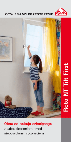 Roto NT Tilt First Okna do pokoju dziecięcego – z zabezpieczeniem przed niepowołanym otwarciem INTELIGENTNE ROZWIĄZANIA Z MYŚLĄ O BEZPIECZEŃSTWIE DZIECI Okna otwierają nasz dom na świat – i tym samym są też dla naszych małych odkrywców, którzy nie mają świadomości istniejących zagrożeń. O nieszczęście jednak nietrudno. Niekiedy wystarczy, że zajęty zabawą w swoim pokoju maluch posłyszy z zewnątrz głos nawołującego go kolegi z piaskownicy. Zaciekawione dziecko podchodzi do okna i nawet jeśli klamka znajduje się poza jego zasięgiem, to podstawia sobie krzesełko. Z taką pomocą każde dziecko potrafi otworzyć okno i wychylić się na zewnątrz. Następstwa takiej zabawy mogą być nader poważne. Nowość: okno do pokoju dziecięcego. Zabezpieczeniom okien montowanych w pokojach dziecięcych poświęca się w dalszym ciągu zbyt mało uwagi. Odnosi się to również do przedszkoli i szkół. Konstruktorzy Roto przeanalizowali ten problem i opracowali nowe rozwiązanie techniczne, dzięki któremu każde okno zabezpieczyć można przed otwarciem przez dzieci. System TiltFirst („uchylanie przed otwieraniem”) po lewej: skrzydło uchylone (klamka w położeniu poziomym), po prawej: skrzydło otwarte (klamka w położeniu pionowym do góry, wyłącznie po przekręceniu klucza) ROTO NT Mechanizm zabezpieczający działa dzięki zastosowaniu opracowanej przez Roto technologii „TiltFirst”. Skrzydło okna po przekręceniu klamki o 90° przechodzi do pozycji uchylenia. Klamka z wkładką cylindryczną nie pozwala na przejście skrzydła z pozycji uchylenia do otwarcia. Dopiero przekręcenie klucza zwalnia blokadę i umożliwia ustawienie klamki w położeniu pionowym (do góry) oraz otwarcie okna. Ponowne przejście do pozycji uchylenia automatycznie uaktywnia blokadę. Wietrzenie bez ryzyka. Bez względu na to, czy okno jest zamknięte, czy też uchylone – otworzyć może je jedynie posiadacz klucza, którego najlepiej nie udostępniać dzieciom. Każdy może bez klucza uchylić okno, ale nie może go otworzyć. Rozwiązanie to gwarantuje dzieciom bezpieczeństwo, a jednocześnie umożliwia wietrzenie pomieszczenia przy uchylonym oknie. Jeżeli pokój dziecięcy ma spełniać nową funkcję – stanie się np. pokojem gościnnym lub gabinetem, wówczas w bardzo prosty sposób można usunąć blokadę otwarcia. Przezbrojeniu poddaje się jedynie okucie bez ingerencji w konstrukcję okna. Dom wygodny i bezpieczny Bezpieczeństwo dziecka: • Technologia TiltFirst: „uchylanie przed otwieraniem” • Blokada w pozycji uchylenia: Bez klucza można jedynie uchylić okno, ale nie można go otworzyć na oścież • Klamka zamykana na klucz: Okno może otworzyć tylko posiadacz klucza do wkładki znajdującej się w klamce Roto – poczucie bezpieczeństwa. Twój specjalista w dziedzinie okien: Roto Frank Okucia Budowlane Sp. z o.o. Wał Miedzeszyński 409 • 03-994 Warszawa tel.: +48 (0-22) 872 16 00 do -04 • faks: +48 (0-22) 872 16 11 [email protected] • www.roto.pl B&N / K Stan: czerwiec 2007. Zastrzega się możliwość zmian. PB 697-0 PL © 2006 Roto Frank AG ® Roto jest zastrzeżonym znakiem handlowym.