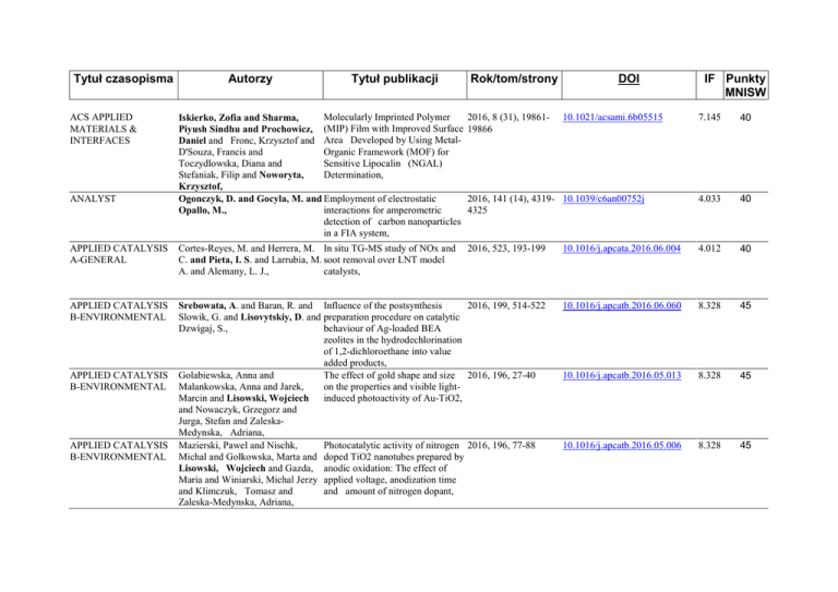 Tytuł czasopisma ACS APPLIED MATERIALS & INTERFACES Autorzy Tytuł publikacji Rok/tom/strony 40 2016, 141 (14), 4319- 10.1039/c6an00752j 4325 4.033 40 2016, 523, 193-199 10.1016/j.apcata.2016.06.004 4.012 40 Srebowata, A. and Baran, R. and Influence of the postsynthesis 2016, 199, 514-522 Slowik, G. and Lisovytskiy, D. and preparation procedure on catalytic Dzwigaj, S., behaviour of Ag-loaded BEA zeolites in the hydrodechlorination of 1,2-dichloroethane into value added products, Golabiewska, Anna and The effect of gold shape and size 2016, 196, 27-40 Malankowska, Anna and Jarek, on the properties and visible lightMarcin and Lisowski, Wojciech induced photoactivity of Au-TiO2, and Nowaczyk, Grzegorz and Jurga, Stefan and ZaleskaMedynska, Adriana, Mazierski, Pawel and Nischk, Photocatalytic activity of nitrogen 2016, 196, 77-88 Michal and Golkowska, Marta and doped TiO2 nanotubes prepared by Lisowski, Wojciech and Gazda, anodic oxidation: The effect of Maria and Winiarski, Michal Jerzy applied voltage, anodization time and amount of nitrogen dopant, and Klimczuk, Tomasz and Zaleska-Medynska, Adriana, 10.1016/j.apcatb.2016.06.060 8.328 45 10.1016/j.apcatb.2016.05.013 8.328 45 10.1016/j.apcatb.2016.05.006 8.328 45 2016, 8 (31), 1986119866 APPLIED CATALYSIS A-GENERAL Cortes-Reyes, M. and Herrera, M. In situ TG-MS study of NOx and C. and Pieta, I. S. and Larrubia, M. soot removal over LNT model A. and Alemany, L. J., catalysts, APPLIED CATALYSIS B-ENVIRONMENTAL APPLIED CATALYSIS B-ENVIRONMENTAL APPLIED CATALYSIS B-ENVIRONMENTAL IF Punkty MNISW 7.145 Molecularly Imprinted Polymer Iskierko, Zofia and Sharma, Piyush Sindhu and Prochowicz, (MIP) Film with Improved Surface Daniel and Fronc, Krzysztof and Area Developed by Using MetalOrganic Framework (MOF) for D'Souza, Francis and Sensitive Lipocalin (NGAL) Toczydlowska, Diana and Determination, Stefaniak, Filip and Noworyta, Krzysztof, Ogonczyk, D. and Gocyla, M. and Employment of electrostatic interactions for amperometric Opallo, M., detection of carbon nanoparticles in a FIA system, ANALYST DOI 10.1021/acsami.6b05515 Catalysts Ilieva, Lyuba and Petrova, Petya Gold Catalysts on Y-Doped Ceria 2016, 6 (7), Art.. No. and Liotta, Leonarda F. and Supports for Complete Benzene 99 Oxidation, Sobczak, Janusz W. and Lisowski, Wojciech and Kaszkur, Zbigniew and Munteanu, Gabriel and Tabakova, Tatyana, CHEMISTRY-A Kotwica, Kamil and Kostyuchenko, Star-Shaped Conjugated Molecules 2016, 22 (33), 11795EUROPEAN JOURNAL Anastasia S. and Data, Przemyslaw with Oxa- or Thiadiazole 11806 and Marszalek, Tomasz and Bithiophene Side Arms, Skorka, Lukasz and Jaroch, Tomasz and Kacka, Sylwia and Zagorska, Malgorzata and Nowakowski, Robert and Monkman, Andrew P. and Fisyuk, Alexander S. and Pisula, Wojciech and Pron, Adam, CHEMISTRY-A Sannicolo, Francesco and Mussini, Inherently Chiral Spider-Like 2016, 22 (31), 10839EUROPEAN JOURNAL Patrizia R. and Benincori, Tiziana Oligothiophenes, 10847 and Martinazzo, Rocco and Arnaboldi, Serena and Appoloni, Giulio and Panigati, Monica and Procopio, Elsa Quartapelle and Marino, Valentina and Cirilli, Roberto and Casolo, Simone and Kutner, Wlodzimierz and Noworyta, Krzysztof and Pietrzyk-Le, Agnieszka and Iskierko, Zofia and Bartold, Katarzyna, CHEMISTRY-A Kotwica, Kamil and Bujak, Piotr Soluble Flavanthrone Derivatives: 2016, 22 (23), 7978EUROPEAN JOURNAL and Data, Przemyslaw and Synthesis, Characterization, and 7986 Krzywiec, Wojciech and Wamil, Application to Organic LightDamian and Gunka, Piotr A. and Emitting Diodes, Skorka, Lukasz and Jaroch, Tomasz and Nowakowski, Robert and Pron, Adam and Monkman, Andrew, 10.3390/catal6070099 2.964 25 10.1002/chem.201600984 5.771 40 10.1002/chem.201504899 5.771 40 10.1002/chem.201600513 5.771 40 CHEMISTRY-A Krupinski, Piotr and Kornowicz, EUROPEAN JOURNAL Arkadiusz and Sokolowski, Kamil and Cieslak, Anna M. and Lewinski, Janusz, 2016, 22 (23), 78177823 10.1002/chem.201600182 5.771 40 CHEMISTRY OF MATERIALS 2016, 28 (15), 53045313 10.1021/acs.chemmater.6b00922 9.407 45 Synthesis, X-ray characterization, 2016, 18 (24), 4587DFT calculations and Hirshfeld 4596 surface analysis of Zn(II) and Cd(II) complexes based on isonicotinoylhydrazone ligand, 10.1039/c6ce00877a 3.849 35 Host-guest complexes of 2016, 18 (26),4905cucurbit[6]uril with the trypanocide 4908 drug diminazene and its degradation product 4aminobenzamidine, 2016, 45, 7240-7243 Wrobel, Zbigniew and Justyniak, Structural diversity of alkylzinc Iwona and Dranka, Izabela and complexes with pyrrole-based N, Lewinski, Janusz, O-ligands: from molecular complexes to coordination polymers, Colmenares, Juan Carlos and Catalytic Dry Reforming for 2016, 4 (8), 881-890 Colmenares Quintero, Ramon Biomass-Based Fuels Processing: Fernando and Pieta, Izabela S., Progress and Future Perspectives, 10.1039/c6ce00257a 3.849 35 10.1039/c6dt00674d 4.177 40 10.1002/ente.201600195 2.557 30 Osselin, F. and Kondratiuk, P. and Microfluidic observation of the Budek, A. and Cybulski, O. and onset of reactive-infitration Garstecki, P. and Szymczak, P., instability in an analog fracture, 10.1002/2016GL069261 4.212 40 CRYSTENGCOMM CRYSTENGCOMM DALTON TRANSACTIONS ENERGY TECHNOLOGY GEOPHYSICAL RESEARCH LETTERS Applying Mechanochemistry for Bottom-Up Synthesis and HostGuest Surface Modification of Semiconducting Nanocrystals: A Case of Water-Soluble betaCyclodextrin-Coated Zinc Oxide, Andryszewski, Tomasz and Iwan, Synthesis of a Free-Standing Monolayer of Covalently Bonded Michalina and Holdynski, Marcin and Fialkowski, Marcin, Gold Nanoparticles, Afkhami, Farhad Akbari and Khandar, Ali Akbar and Mahmoudi, Ghodrat and Maniukiewicz, Waldemar and Lipkowski, Janusz and White, Jonathan M. and Waterman, Rory and Garcia-Granda, Santiago and Zangrando, Ennio and Bauza, Antonio and Frontera, Antonio, Danylyuk, Oksana and Butkiewicz, Helena and Sashuk, Volodymyr, 2016, 43 (13), 69076915 INORGANIC CHEMISTRY JOURNAL OF CHEMICAL PHYSICS JOURNAL OF MICROSCOPY JOURNAL OF NANOPART