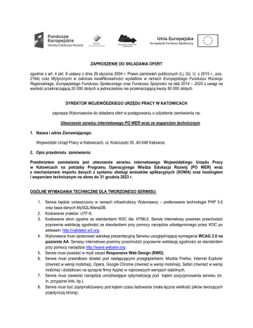 ZAPROSZENIE DO SKŁADANIA OFERT zgodnie z art. 4 pkt. 8 ustawy z dnia 29 stycznia 2004 r. Prawo zamówień publicznych (t.j. Dz. U. z 2015 r., poz. 2164) oraz Wytycznymi w zakresie kwalifikowalności wydatków w ramach Europejskiego Funduszu Rozwoju Regionalnego, Europejskiego Funduszu Społecznego oraz Funduszu Spójności na lata 2014 – 2020 z uwagi na wartość przekraczającą 20 000 złotych a jednocześnie nie przekraczającą kwoty 50 000 złotych DYREKTOR WOJEWÓDZKIEGO URZĘDU PRACY W KATOWICACH zaprasza Wykonawców do składana ofert w postępowaniu o udzielenie zamówienia na: Utworzenie serwisu internetowego PO WER wraz ze wsparciem technicznym 1. Nazwa i adres Zamawiającego: Wojewódzki Urząd Pracy w Katowicach, ul. Kościuszki 30, 40-048 Katowice. 2. Opis przedmiotu zamówienia: Przedmiotem zamówienia jest utworzenie serwisu internetowego Wojewódzkiego Urzędu Pracy w Katowicach na potrzeby Programu Operacyjnego Wiedza Edukacja Rozwój (PO WER) wraz z mechanizmem importu danych z systemu obsługi wniosków aplikacyjnych (SOWA) oraz hostingiem i wsparciem technicznym na okres do 31 grudnia 2023 r. OGÓLNE WYMAGANIA TECHNICZNE DLA TWORZONEGO SERWISU: 1. Serwis będzie umieszczony w ramach infrastruktury Wykonawcy – preferowane technologie PHP 5.5 oraz baza danych MySQL/MariaDB. 2. Kodowanie znaków: UTF-8. 3. Kodowanie stron zgodne ze standardami W3C dla: HTML5. Serwis internetowy powinien przechodzić poprawnie walidację zgodności ze standardami przy pomocy narzędzia udostępnionego przez W3C po adresem: http://validator.w3.org. 4. Wykonawca musi opracować warstwę prezentacyjną Serwisu uwzględniającą wymagania WCAG 2.0 na poziomie AA. Serwisy internetowe powinny przechodzić poprawnie walidację zgodności ze standardem przy pomocy narzędzia http://wave.webaim.org. 5. Serwis musi powstać w myśl zasad Responsive Web Design (RWD). 6. Serwis musi prawidłowo działać pod następującymi przeglądarkami: Mozilla Firefox, Internet Explorer (również w wersji mobilnej), Opera, Google Chrome (również w wersji mobilnej), Safari (również w wersji mobilnej i dodatkowo na sprzęcie firmy Apple) w najnowszych wersjach stabilnych. 7. Serwis musi zawierać narzędzia umożliwiające optymalizację pod kątem pozycjonowania serwisu (m. in. przyjazne linki, itp.). 8. Serwis musi być zoptymalizowany pod kątem czasu ładowania (mała łączna wielkość plików tworzących pojedynczą stronę). 9. Serwis musi zawierać narzędzia umożliwiające tworzenie dynamicznej ścieżki linków od strony głównej do punktu, w którym znajduje się użytkownik, tzw. „okruszki”. 10. Serwis musi zapewniać walidację danych pobieranych z formularzy, danych URL oraz być odporny między innymi na następujące zagrożenia: a) ataki semantyczne na adres URL; b) ataki związane z ładowaniem plików; c) ataki typu cross-site scripting; d) podrabianie zatwierdzenia formularza; e) ujawnienie uwierzytelnień dostępu; f) wstrzykiwanie kodu SQL; g) ujawnienie danych przechowywanych w bazie; h) wstrzykiwanie poleceń systemowych. 11. Zamawiający dokona delegacji subdomeny na wskazane serwery DNS, zarządzane przez Wykonawcę, na których będzie przechowywana strefa obsługująca serwis i za którą Wykonawca będzie w pełni odpowiedzialny. 12. Wykonawca odpowiada za poprawne skonfigurowanie mechanizmu działania serwera pocztowego służącego do masowego wysyłania wiadomości e-mail (newsletter), a w szczególności zadba o poprawny wpis dla rekordu MX dla subdomeny oraz konfigurację rekordu PTR dla hosta. 13. Bezpieczny dostęp do serwisu musi być gwarantowany komercyjnym certyfikatem SSL dla wydelegowanej przez Zamawiającego subdomeny, który przez cały okres umowy dostarczy Wykonawca. 14. Serwis musi zostać wyposażony w narzędzia do analizy statystyk serwisów WWW lub korzystać z ogólnie dostępnych mechanizmów takich jak np. Google Analytics. Wymagania dla systemu zarządzania treścią (CMS) 1. Informacje przechowywane w bazie danych nie mogą być z żaden sposób zakodowane (oprócz informacji zapewniających bezpieczne działanie aplikacji, np. hasła użytkowników). 2. CMS musi zawierać edytor: „What You See Is What You Get” (WYSIWYG) do formatowania treści, tworzenia tabel, linków, wstawiania grafik, itp. 3. Dostęp realizowany z poziomu przeglądarek internetowych, bez konieczności instalowania dodatkowych rozszerzeń. 4. System musi być odporny na próby uzyskania dostępu poprzez znane formy włamań. 5. System musi po zalogowaniu pokazywać czas jaki pozostał do zakończenia sesji . Na minutę przed wygaśnięciem sesji musi pojawić się ostrzeżenie. Po wygaśnięciu sesji musi pojawić się odpowiedni komunikat i automatyczne wylogowanie użytkownika. 6. System musi logować informacje o zdarzeniach typu: logowanie do systemu; zmiana hasła; nieudane próby logowania; utworzenie, modyfikacja, usunięcie informacji; wysłanie wiadomości e-mail (newsletter) z wyszczególnieniem: czasu zdarzenia; użytkownika odpowiadającego za zdarzenie; adresu IP; miejsca w systemie, z którego pochodzi zdarzenie (np. kontroler); adresu docelowego e-mail (wysyłka newslettera); zwięzłego komunikatu. System będzie wyposażony w mechanizm filtrowania i wyszukiwania informacji w logach. 7. W związku z przetwarzaniem danych osobowych system będzie posiadał następujące mechanizmy: badanie siły hasła; wymuszanie zmiany hasła co 30 dni (z kontrolą czy nowe hasło jest różne od poprzedniego); blokowanie konta na określony czas po 3 nieudanych próbach logowania; sesja z automatycznym wylogowaniu po jej upływie; logowanie zdarzeń ze wskazaniem na konkretnego użytkownika systemu. 8. Uprawnienia: system będzie posiadał 3-stopniowy poziom uprawnień użytkowników. Uprawnienia użytkowników: a) Administrator – posiada uprawnienia do wszystkich funkcjonalności, w tym do zarządzania użytkownikami i uprawnieniami; b) Redaktor naczelny – akce