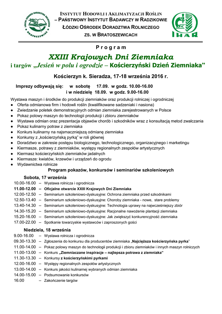 INSTYTUT HODOWLI I AKLIMATYZACJI ROŚLIN – PAŃSTWOWY INSTYTUT BADAWCZY W RADZIKOWIE ŁÓDZKI OŚRODEK DORADZTWA ROLNICZEGO ZS. W BRATOSZEWICACH Program XXIII Krajowych Dni Ziemniaka i targów „Jesień w polu i ogrodzie – Kościerzyński Dzień Ziemniaka” Kościerzyn k. Sieradza, 17-18 września 2016 r. Imprezy odbywają się: w sobotę 17.09. w godz. 10.00-16.00 i w niedzielę 18.09. w godz. 9.00-16.00 Wystawa maszyn i środków do produkcji ziemniaków oraz produkcji rolniczej i ogrodniczej ● Oferta odmianowa firm i hodowli roślin (kwalifikowane sadzeniaki i nasiona) ● Zwiedzanie poletek demonstracyjnych odmian ziemniaka zarejestrowanych w Polsce ● Pokaz polowy maszyn do technologii produkcji i zbioru ziemniaków ● Wystawa odmian oraz prezentacja objawów chorób i szkodników wraz z konsultacją metod zwalczania ● Pokaz kulinarny potraw z ziemniaka ● Konkurs kulinarny na najsmaczniejszą odmianę ziemniaka ● Konkursy z „kościerzyńską pyrką” w roli głównej ● Doradztwo w zakresie postępu biologicznego, technologicznego, organizacyjnego i marketingu ● Kiermasze, potrawy z ziemniaków, występy regionalnych zespołów artystycznych ● Kiermasz kościerzyńskich ziemniaków jadalnych ● Kiermasze: kwiatów, krzewów i urządzeń do ogrodu ● Wydawnictwa rolnicze Program pokazów, konkursów i seminariów szkoleniowych Sobota, 17 września 10.00-16.00 11.00-12.00 12.00-12.50 12.50-13.40 13.40-14.30 14.30-15.20 15.20-16.00 17.00-22.00 – – – – – – – – Wystawa rolnicza i ogrodnicza Oficjalne otwarcie XXIII Krajowych Dni Ziemniaka Seminarium szkoleniowo-dyskusyjne: Ochrona ziemniaka przed szkodnikami Seminarium szkoleniowo-dyskusyjne: Choroby ziemniaka - nowe, stare problemy Seminarium szkoleniowo-dyskusyjne: Technologia uprawy na najwcześniejszy zbiór Seminarium szkoleniowo-dyskusyjne: Racjonalne nawożenie plantacji ziemniaka Seminarium szkoleniowo-dyskusyjne: Jak zwiększyć konkurencyjność ziemniaka Spotkanie towarzyskie wystawców i zaproszonych gości Niedziela, 18 września 9.00-16.00 09.30-13.30 11.00-14.00 11.00-13.00 11.30-13.30 12.00-16.00 13.00-14.00 14.00-15.00 16.00 – – – – – – – – – Wystawa rolnicza i ogrodnicza Zgłoszenia do konkursu dla producentów ziemniaka „Najcięższa kościerzyńska pyrka” Pokaz polowy maszyn do technologii produkcji i zbioru ziemniaków i innych maszyn rolniczych Konkurs „Ziemniaczane inspiracje – najlepsza potrawa z ziemniaka” Konkursy z kościerzyńskimi pyrkami Występy regionalnych zespołów artystycznych Konkurs jakości kulinarnej wybranych odmian ziemniaka Podsumowanie konkursów Zakończenie targów W sprawach organizacyjnych można kontaktować się: Zakład Nasiennictwa i Ochrony Ziemniaka IHAR-PIB w Boninie 76-009 Bonin k. Koszalina tel. centr. 94 342 30 31, kier. Z-du 342 69 97 e-mail: [email protected] Łódzki Ośrodek Doradztwa Rolniczego z s. w Bratoszewicach Oddział Kościerzyn, 98-285 Wróblew tel. 43 821 31 13, e-mail: [email protected]