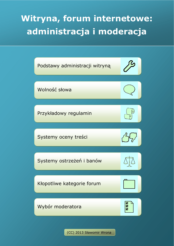 Witryna, forum internetowe: administracja i moderacja Podstawy administracji witryną Wolność słowa Przykładowy regulamin Systemy oceny treści Systemy ostrzeżeń i banów Kłopotliwe kategorie forum Wybór moderatora (CC) Sławomir Wrona (CC) 2013 Sławomir Wrona Wstęp Wstęp ........................................................................................... 6 Streszczenia rozdziałów ................................................................ 7 1. Podstawy administracji witryny i forum ......................... 9 1. Wstęp .............................................................................................. 9 2. Cel, pal ............................................................................................ 9 3. System ogłoszeń jest najważniejszy................................................. 9 4. Nawiązano kontakt z lokalną ludnością .......................................... 12 5. Wykryto oznaki życia ..................................................................... 14 6. Elementy techniczne ...................................................................... 15 2. Wolność złapana w sieci ..................................................... 17 1. Co to jest wolność? ........................................................................ 17 2. Cenzura zagraża Wszechświatowi .................................................. 17 3. Moderator z sowieckiej Rosji .......................................................... 18 4. Ale przecież wszyscy kradną .......................................................... 19 5. Wolność prywatności ..................................................................... 20 6. Konflikt dwóch wolności ................................................................. 21 7. Jak walczyć z wolnością 101 .......................................................... 22 8. Równość i krytyka.......................................................................... 22 9. Klawiatura w areszcie .................................................................... 23 10. Kontrola umysłów .......................................................................... 24 11. Owoce wolności i podsumowanie .................................................... 24 3. Lubię zło – systemy oceny a moderacja ....................... 26 1. Niezrozumienie systemów oceny .................................................... 26 2. Lubię zło ........................................................................................ 26 3. Wciąż skuteczne ............................................................................ 27 2 Wstęp 4. Użyteczność i odczucia użytkowników ............................................ 28 5. Rozdział oceny i moderacji ............................................................. 30 6. Dobry system i podsumowanie ...................................................... 31 4. Dziel i banuj............................................................................. 33 1. Sprawiedliwy wyrok w punktach .................................................... 33 2. Ulgi i zniżki .................................................................................... 35 3. Bezstresowe banowanie ................................................................. 36 4. Jak podać mandat .......................................................................... 37 5. Raportuję cię, Sheppard ................................................................ 39 5. Regulamin ................................................................................ 40 1. Atrakcyjne zasady ......................................................................... 40 2. Ogólne procedury egzekwowania regulaminu ................................. 40 3. Jednoznaczność ............................................................................. 41 4. Zasady gry .................................................................................... 42 5. Punkt pierwszy – spam .................................................................. 42 6. Punkt drugi – poprawność językowa .............................................. 44 7. Punkt trzeci – reklama ................................................................... 44 8. Punkt czwarty – obrażanie innych .................................................. 45 9. Punkt piąty – trollowanie ............................................................... 46 10. Punkt szósty – wielokrotne posty ................................................... 47 11. Punkt siódmy – cytowanie ............................................................. 47 12. Punkt ósmy – prywatność .............................................................. 47 13. Punkt dziewiąty – podszywanie się, zabawa w moderatora ............. 48 14. Punkt dziesiąty – włamania, kradzieże ........................................... 48 15. Punkt jedenasty – dyskusje o moderatorach (i ich działaniach) ...... 49 16. Punkt dwunasty – obchodzenie bana.............................................. 50 3 Wstęp 17. Też spotykane ............................................................................... 50 18. Klasyfikacja punktowa zasad.......................................................... 51 19. Wolność w wolności ....................................................................... 52 20. Anty-zasady .................................................................................. 52 21. Inne anty-zasady ........................................................................... 54 22. Alternatywna zasada...................................................................... 54 23. Moralna odpowiedzialność i dobre wychowanie .............................. 54 24. O co chodzi .................................................................................... 55 6. Kategorie forum ..................................................................... 56 1.