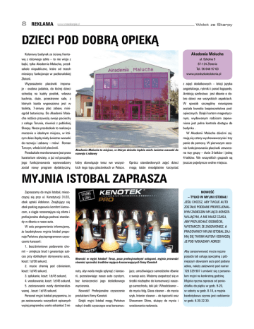 8 reklama www.smnaskarpie.pl Widok ze Skarpy Dzieci pod dobrą opieką Kolorowy budynek ze ścianą frontową z różowego szkła – to nie wizja z bajki, tylko Akademia Malucha, przedszkole niepubliczne, które od trzech miesięcy funkcjonuje w podtoruńskiej Złotorii. Wyposażenie placówki imponuje - osobna jadalnia, do której dzieci schodzą na każdy posiłek, własna kuchnia, duże, przestronne sale, z których każda wyposażona jest w toaletę, 7-arowy plac zabaw, miniogród botaniczny. Do Akademii Malucha rodzice przywożą swoje pociechy z całego Torunia, również z pobliskiej Skarpy. Nasze przedszkole to realizacja marzenia o idealnym miejscu, w którym dzieci będą miały świetne warunki do rozwoju i zabawy – mówi Roman Turczyn, właściciel placówki. Przedszkole monitorowane jest przez kuratorium oświaty, a już od początku jego funkcjonowania wprowadzony został nowy program dydaktyczny, Akademia Malucha ul. Szkolna 5 87-124 Złotoria Tel. 56 648 97 63 www.przedszkolezlotoria.pl Akademia Malucha to miejsce, w którym dziecko będzie miało świetne warunki do rozwoju i zabawy który obowiązuje teraz we wszystkich tego typu placówkach w Polsce. Oprócz standardowych zajęć dzieci mogą także nieodpłatnie korzystać z zajęć dodatkowych – lekcji języka angielskiego, rytmiki i porad logopedy. Ambicją szefostwa jest dbanie o dobro dzieci we wszystkich aspektach. W sposób szczególny rozwiązana została kwestia bezpieczeństwa podopiecznych. Dzięki kartom magnetycznym, wydawanym rodzicom zapewniona jest pełna kontrola dostępu do budynku . W Akademii Malucha dziećmi zajmują się cztery wychowawczynie i trzy panie do pomocy. W pierwszym sezonie funkcjonowania placówki utworzono trzy grupy – dwie 3-latków i jedną 4-latków. We wszystkich grupach są jeszcze pojedyncze wolne miejsca. Myjnia Istobal zaprasza Zapraszamy do myjni Istobal, mieszczącej się przy ul. Konstytucji 31/33, obok apteki Adoloran. Znajdujący się obok parking zapewnia komfort kierowcom, a ciągle rozszerzająca się oferta i profesjonalna obsługa podnosi standardy w dbaniu o nasze auta. W celu przypomnienia informujemy, że bezdotykowa myjnia Istobal proponuje Państwu pięcioprogramowe czyszczenie karoserii: 1. bezciśnieniowe podawanie chemii – zmiękcza brud i gwarantuje sukces przy dokładnym domywaniu auta, koszt: 1zł/30 sekund, 2. mycie chemią pod ciśnieniem, koszt: 1zł/45 sekund, 3. spłukanie, koszt: 1zł/45 sekund, 4. woskowanie, koszt: 1zł/45 sekund, 5. zastosowanie wody demineralizowanej , koszt: 1zł/45 sekund. Personel myjni Istobal przypomina, że po zastosowaniu wszystkich opisanych wyżej programów, warto odczekać 2 mi- NOWOŚĆ – TYLKO W MYJNI ISTOBAL! JEŚLI CHCESZ, ABY TWOJE AUTO ZOSTAŁO PODDANE PROFESJONALNYM ZABIEGOM MYJĄCO-KONSERWUJĄCYM, A NIE MASZ CZASU, ABY PRZYJECHAĆ OSOBIŚCIE, WYSTARCZY, ŻE ZADZWONISZ, A PRACOWNICY MYJNI ISTOBAL ZAJMĄ SIĘ TWOIM AUTEM I ODWIOZĄ JE POD WSKAZANY ADRES! Nowość w myjni Istobal! Teraz, poza profesjonalnymi usługami, myjnia prowadzi również sprzedaż środków myjąco-konserwujących firmy Kenotek nuty, aby woda mogła spłynąć z karoserii, pozostawiając nasze auto czystym, bez konieczności jego dodatkowego wycierania. Nowość! Profesjonalne czyszczenie produktami firmy Kenotek Dzięki myjni Istobal mogą Państwo nabyć środki czyszczące oraz konserwu- jące, umożliwiające samodzielne dbanie o swoje auto. Możemy zaopatrzyć się w środki niezbędne do konserwacji naszego samochodu, taki jak: Wheelcleaner – do mycia felg, Glass cleaner – do mycia szyb, Interior cleaner – do tapicerki oraz Showroom Shine, służący do mycia i woskowania nadwozia. Aby zarezerwować mycie ręczne pojazdu lub usługę specjalną z późniejszym dowozem auta pod podany adres, należy zadzwonić pod numer 728 329 907 i umówić się z personelem myjni na konkretną godzinę. Myjnia ręczna zaprasza od poniedziałku do piątku w godz. 9-20, w soboty w godz. 8-18, a myjnia bezdotykowa czynna jest codziennie w godz. 6.30-22.30.