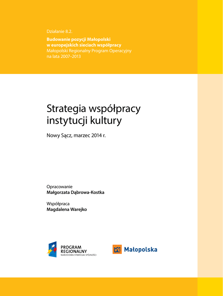 Działanie 8.2. Budowanie pozycji Małopolski w europejskich sieciach współpracy Małopolski Regionalny Program Operacyjny na lata 2007–2013 Strategia współpracy instytucji kultury Nowy Sącz, marzec 2014 r. Opracowanie Małgorzata Dąbrowa-Kostka Współpraca Magdalena Warejko Strategia współpracy instytucji kultury Nowy Sącz, marzec 2014 r. Opracowanie Małgorzata Dąbrowa-Kostka Współpraca Magdalena Warejko Działanie 8.2. Budowanie pozycji Małopolski w europejskich sieciach współpracy Małopolski Regionalny Program Operacyjny na lata 2007–2013 Strategia współpracy instytucji kultury została wydana w ramach projektu Małopolskie instytucje kultury w sieci współpracy OPERA EUROPA. Spis treści 1. S trategia rozwoju kultury w Małopolsce. Dokumenty programowe. Spójność z dokumentami krajowymi i wytycznymi Unii Europejskiej 5 2. D iagnoza stanu kultury w Małopolsce w świetle istniejących badań 21 3. Analiza SWOT w zakresie współpracy małopolskich instytucji kultury 25 4. Obszary współpracy małopolskich instytucji kultury – prezentacja wniosków wynikających z przeprowadzonych w związku z publikacją wywiadów rozszerzonych, ankiet, badań fokusowych 31 5. W spółpraca programowo-merytoryczna 53 6. K ultura a marketing regionalny – obszary współpracy instytucji kultury i samorządów 57 7. Kultura a edukacja – obszary współpracy instytucji kultury, bibliotek i placówek edukacyjnych 59 9. Bibliografia 67 10. Założenia metodyczne przeprowadzonych badań 69 11. Podziękowania 71 Spis treści 8. W spólne projekty jako wyzwanie w nowym okresie programowania. Podsumowanie61 3 P rzemysły kreatywne i przemysły kultury to jedna z najbardziej dynamicznie rozwijających się dziedzin gospodarki w świecie. Ocena ich znaczenia dla rozwoju Europy znalazła swój wyraz w Zielonej Księdze1 w sprawie uwalniania potencjału przedsiębiorstw z branży kultury i branży twórczej, podpisanej przez Komisję Europejską 2010 roku. Jej główne tezy mówią o tym, że podmioty szeroko związane z twórczością dysponują wielkim niewykorzystanym potencjałem tworzenia wzrostu gospodarczego i miejsc pracy. Aby go wykorzystać Europa musi znaleźć nowe źródła inteligentnego, zrównoważonego, obejmującego wszystkich wzrostu i zainwestować w nie, aby zapewnić ich trwanie. W zrównoważonym rozwoju przemysłów kreatywnych upatruje się stymulatora innowacyjności całej gospodarki, a także podstaw rozwoju Komisja Europejska [2010], Zielona księga w sprawie uwalniania potencjału przedsiębiorstw z branży kultury i branży twórczej, http://ec.europa.eu/culture/ documents/greenpaper_creative_industries_pl.pdf (dostęp: 5.11.2013). 1 społecznego. Bardzo wysoko ocenia się potencjał ekonomiczny przemysłów kultury. Tworzą one jeden z najbardziej dynamicznych sektorów wytwarzający około 2,6% PKB Europy, charakteryzujący się wysokim potencjałem wzrostu i zapewniający dobre miejsca pracy dla około 5 mln ludzi w całej UE. Aby przemysły kreatywne i branża twórcza mogły w pełni wykorzystać możliwości, jakie niosą ze sobą różnorodność kulturowa, globalizacja i digitalizacja, które w największym stopniu przyczyniają się do rozwoju tych przedsiębiorstw, konieczne jest: – zapewnienie odpowiednich warunków, takich jak zwiększenie możliwości eksperymentowania, wprowadzania innowacji i osiągania sukcesu przez przedsiębiorców oraz zapewnianie łatwiejszego dostępu do finansowania i odpowiedniego zestawu umiejętności; 1. Strategia rozwoju kultury w Małopolsce. Dokumenty programowe. Spójność z dokumentami krajowymi i wytycznymi Unii Europejskiej 1 Strategia rozwoju kultury w Małopolsce. Dokumenty programowe Spójność z dokumentami krajowymi i wytycznymi Unii Europejskiej 5 1. Strategia rozwoju kultury w Małopolsce. Dokumenty programowe. Spójność z dokumentami krajowymi i wytycznymi Unii Europejskiej 6 6 – wspieranie rozwoju przemysłów kreatywnych i branży twórczej w środowisku lokalnym i regionalnym, co stanowi punkt wyjścia do silniejszej obecności na arenie światowej, także poprzez zintensyfikowaną wymianę i mobilność; – przejście do gospodarki kreatywnej poprzez stymulowanie wpływu przemysłów kreatywnych na różnorodne aspekty gospodarki i życia społecznego. W środowisku przemysłów kreatywnych i kultury funkcjonują bardzo zróżnicowane formy organizacyjne, od indywidualnych twórców, przez przedsiębiorstwa prywatne, instytucje samorządowe i publiczne oraz NGO’s. Skuteczny rozwój wymaga podjęcia działań zmierzających do wzajemnego przenikania się i współpracy różnych form organizacyjnych, tylko wówczas możliwe jest osiągnięcie pełnej synergii twórczej i ekonomicznej. Nowe technologie i nowe formy komunikacji spowodowały pojawienie się nowych form uczestnictwa w kulturze, ich zaabsorbowanie przez dotychczas funkcjonujące formy organizacyjne jest łatwą do przewidzenia koleją rzeczy. Potrzebny jest szerszy zakres współpracy między twórcami indywidualnymi a różnorodnymi formami instytucjonalnymi kultury. Ważne jest poszerzenie pola interakcji przemysłów kreatywnych i innych dyscyplin, które dzięki temu mogłyby w większym stopniu stać się innowacyjne. Niezbędne staje się wzmocnienie relacji twórców i edukacji artystycznej, a także umożliwienie rozpoczęcia działalności artystycznej oraz tworzenie inkubatorów przedsiębiorczości i innych form typu start-up. Kreatywność i innowacyjność mają szczególny wymiar regionalny. Ich udziałem jest budowanie spójności i tożsamości regionalnej, jak również szczególny wkład w promocję i marketing regionu i pomnażanie jego walorów w zakresie atrakcyjności turystycznej. Jednym ze sposobów jest zmaksymalizowanie związków pomiędzy kulturą i edukacją, co promować będzie kreatywność w perspektywie całego życia. Zakłada się przy tym, że kreatywność nie jest jedynie cechą w