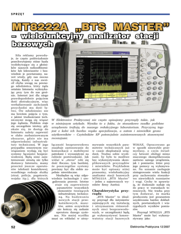 SPRZĘT MT8222A „BTS MASTER” – wielofunkcyjny analizator stacji bazowych Siła reklamy powoduje, że często podświadomie przechwytujemy różne hasła wydobywające się z głośników naszych radioodbiorników lub telewizorów i bezwiednie je powtarzamy, nawet wtedy, gdy nas mocno irytują. Każdy z nas zwrócił chyba uwagę na pewnego młodzieńca, który żąda ostatnio Internetu wykrzykując przy tym do nas groźnie. Internet jest dla niego prawdopodobnie pojęciem dość abstrakcyjnym, więc werbalizowanie zachcianek przychodzi mu dość łatwo. Ów młodzieniec nie ma bowiem pojęcia o tym, z jakimi trudnościami technicznymi mogą się wiązać jego żądania, Problem staje się szczególnie istotny, gdy okaże się, że dostęp do Internetu należy zapewnić w słabo zurbanizowanym obszarze, gdzie nie ma odpowiedniej infrastruktury technicznej. W jego przypadku sensownym rozwiązaniem wydają się być systemy łączności bezprzewodowej. Będą nimi zainteresowani zresztą nie tylko dostawcy Internetu, mamy przecież jeszcze operatorów telefonii komórkowej, wszelkiego rodzaju służby (straż, policja, pogotowie, wojsko itp.), dla których 52 W Elektronice Praktycznej nie często opisujemy przyrządy takie, jak w niniejszym artykule. Wynika to z faktu, że stosunkowo rzadko podobne urządzenia trafiają do naszego redakcyjnego laboratorium. Przyczyną tego jest z kolei ich bardzo wąska specjalizacja, a zatem i niewielkie grono użytkowników – Czytelników EP potencjalnie zainteresowanych stosownymi recenzjami. łączność bezprzewodowa znajduje zastosowanie do komunikacji z mobilnymi patrolami i wysuniętymi na rubieże posterunkami. Jak widać w „eterze” robi się dość tłoczno, tym bardziej, że poszczególne systemy powinny być dla siebie zupełnie niewidoczne. Niezbędne są więc odpowiednie technologie i uregulowania prawne. Istotne staje się zapewnienie parametrów wszystkich elementów tworzących infrastrukturę techniczną. Na budowaniu nowych stacji przekaźnikowych, masztów, anten oczywiście nie kończy się zadanie operatora danego systemu. Nie mniej wysiłku musi on wkładać w utrzy- mywanie wszystkich parametrów technicznych już w czasie eksploatacji urządzeń. Trudno sobie wyobrazić, by było to możliwe bez wykorzystywania skomplikowanych przyrządów i mierników. Przykładem może być opisany niżej przenośny, wielofunkcyjny analizator stacji bazowych MT8222A „BTS Master” – jeden z najnowszych wyrobów firmy Anritsu Charakterystyka przyrządu „BTS Master” to idealny przyrząd dla inżynierów zajmujących się instalacją i utrzymaniem różnorodnych sieci bezprzewodowych, w szczególności będą go wykorzystywać konserwatorzy stacji bazowych WiMAX. Opracowano go w sposób niezwykle przemyślany, o czym świadczy łatwość obsługi mimo znacznego skomplikowania zarówno samego urządzenia, jak i pomiarów, które przy jego pomocy są wykonywane. Na uznanie zasługuje zintegrowanie wielu funkcji przy zachowaniu stosunkowo niewielkich rozmiarów i wagi. Cechy te sprawiają, że doskonale nadaje się do pracy w warunkach terenowych. Nie trzeba przy tym dodawać, że marka producenta jest gwarantem uzyskiwania bardzo dokładnych, powtarzalnych i wiarygodnych wyników pomiarów. Przyrząd MT8222A „BTS Master” może być wykorzystywany jako: Elektronika Praktyczna 12/2007 SPRZĘT – analizator widma pracujący w paśmie od 100 kHz do 7,1 GHz, – analizator kabli i anten (10 MHz do 4 GHz z możliwością rozszerzenia do 6 GHz), – selektywny miernik mocy w paśmie od 10 MHz do 7,1 GHz, – analizator nadajników Wi M a x , W – C D M A / H S D PA , G S M / G P R S / EDGE, cdmaOne, CDMA 2000, CDMA2000 1xEV– DO, – analizator interferencji (100 kHz do 7,1 GHz), – skaner kanałowy (100 kHz do 7,1 GHz), – szerokopasmowy monitor mocy (100 kHz do 50 GHz), – bardzo dokładny miernik mocy (50 MHz do 6 GHz), – analizator T1/FT1, – analizator T3/T1/FT1, – analizator stopy błędów E1, – generator fali ciągłej. „BTS Master” posiada wbudowaną opcję Bias Tee (12 V–24 V), jest też wyposażony w odbiornik GPS z dołączaną anteną zewnętrzną będącą na wyposażeniu standardowym. Dane pomiarowe mogą być łatwo archiwizowane przez oprogramowanie „Master Softwa- Elektronika Praktyczna 12/2007 re Tools”, które również jest dostarczane standardowo. Oprogramowanie to umożliwia ponadto łatwą analizę i ocenę pracy mierzonych systemów. Przyrząd posiada wewnętrzną pamięć Flash służącą do przechowywania wyników pomiarów oraz nastaw, jednak możliwości te są zdecydowanie większe, gdy zostanie użyta karta Compact Flash, dla której gniazdo znajduje się w tylnej części obudowy. Karta taka umożliwia ponadto dość wygodne przenoszenie danych, ale czynność ta jest również możliwa poprzez sieć ethernetową 10/100 Base–T, a także interfejs USB 2.0. Do przełączania trybów pracy, wprowadzania danych, wyboru nastaw itp. służy wygodna klawiatura „kalkulatorowa” rozszerzona o pokrętło obrotowe i klawisze przesuwu kursorów. Większość klawiszy oprócz typowych funkcji numerycznych ma „podpięte” również funkcje dodatkowe. Jest też grupa czterech „twardych” klawiszy wykorzystywanych do szybkiego wchodzenia w najczęściej powtarzane opcje. W trakcie pomiarów można korzystać z sześciu markerów, które ułatwiają wykonywanie obliczeń. Dużym udogodnieniem podczas archiwizacji wyników jest automatyczne dodawanie znacznika czasowego (daty i godziny). W wewnętrznej pamięci można zarejestrować ponad 1000 ścieżek i tyle samo nastaw przyrządu. Wyniki są prezentowane na dużym, czytelnym wyświetlaczu LCD. Mogą mieć formę wykresów, histogramów, tabel, a nawet w postaci analogowego miernika wskazówkowego. Analizator „BTS Master” pozwala też definiować ograniczenia mierzonych sygnałów, dzięki którym możliwe jest prowadzenie testów