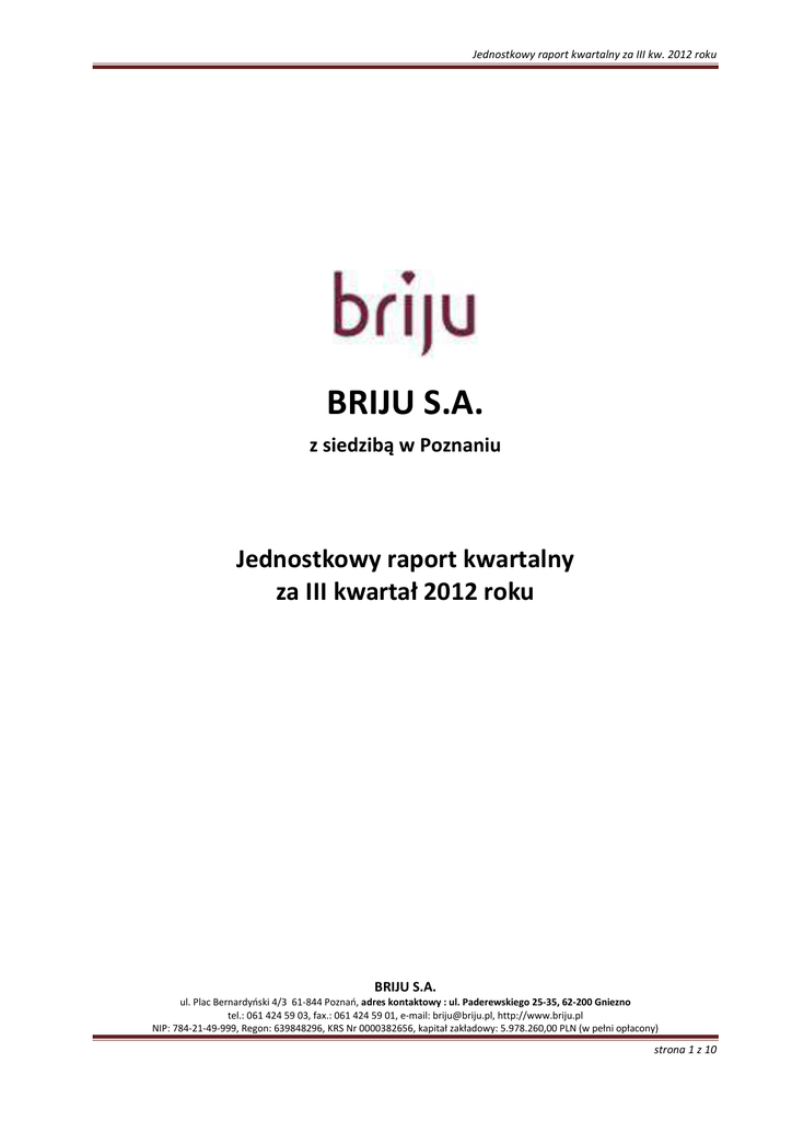 Jednostkowy raport kwartalny za III kw. 2012 roku BRIJU S.A. z siedzibą w Poznaniu Jednostkowy raport kwartalny za III kwartał 2012 roku BRIJU S.A. ul. Plac Bernardyński 4/3 61-844 Poznań, adres kontaktowy : ul. Paderewskiego 25-35, 62-200 Gniezno tel.: 061 424 59 03, fax.: 061 424 59 01, e-mail: [email protected], http://www.briju.pl NIP: 784-21-49-999, Regon: 639848296, KRS Nr 0000382656, kapitał zakładowy: 5.978.260,00 PLN (w pełni opłacony) strona 1 z 10 Jednostkowy raport kwartalny za III kw. 2012 roku Spis treści 1. PODSTAWOWE INFORMACJE O SPÓŁCE ...................................................................................... 3 2. WYBRANE DANE FINANSOWE..................................................................................................... 5 3. STRATEGIA W OBSZARZE ROZWOJU DZIAŁALNOŚCI .................................................................... 7 4. ISTOTNE CZYNNIKI ORAZ ZDARZENIA, KTÓRE MIAŁY WPŁYW NA OSIĄGNIĘTE WYNIKI FINANSOWE ORAZ INFORMACJA ZARZĄDU NA TEMAT AKTYWNOŚCI, JAKĄ PODEJMOWAŁ W OBSZARZE ROZWOJU PROWADZONEJ DZIAŁALNOŚCI ............................................................. 7 5. RYZYKA I ZAGROŻENIA DZIAŁALNOŚCI ........................................................................................ 9 6. OŚWIADCZENIE ZARZĄDU ........................................................................................................ 10 BRIJU S.A. ul. Plac Bernardyński 4/3 61-844 Poznań, adres kontaktowy : ul. Paderewskiego 25-35, 62-200 Gniezno tel.: 061 424 59 03, fax.: 061 424 59 01, e-mail: [email protected], http://www.briju.pl NIP: 784-21-49-999, Regon: 639848296, KRS Nr 0000382656, kapitał zakładowy: 5.978.260,00 PLN (w pełni opłacony) strona 2 z 10 Jednostkowy raport kwartalny za III kw. 2012 roku 1. PODSTAWOWE INFORMACJE O SPÓŁCE Dane rejestrowe Nazwa (firma): Kraj: Siedziba: Adres: Adres korespondencyjny: Numer KRS: Oznaczenie Sądu: REGON: NIP: Telefon: Fax: Poczta e-mail: Strona www: BRIJU Spółka Akcyjna Polska Poznań Plac Bernardyński 4/3, 61-844 Poznań ul. Paderewskiego 25-35, 62-200Gniezno 0000382656 Sąd Rejonowy- Nowe Miasto i Wilda w Poznaniu, VIII Wydział Gosp. KRSgGGGGospodarczy KRS 639848296 784-21-49-999 +48 61 424 59 03 +48 61 424 59 01 [email protected] www.briju.pl Tradycja jubilerska założycieli BRIJU sięga już 1912 roku, kiedy powstała pierwsza rodzinna firma jubilerska, założona i prowadzona przez dziadka braci Piotrowskich. Pierwotnie od 1990 roku, bracia – obecni akcjonariusze działali pod nazwą Firma Jubilerska Piotrowscy. Następnie 18 lipca 2000 roku została zawiązana Futurat Sp. z o. o., poprzednik prawny BRIJU, która uzyskała osobowość prawną wraz z wpisem do Rejestru Handlowego dnia 13 grudnia 2000 roku. Dnia 15 marca 2011 roku uchwałą Zgromadzenia Wspólników Futurat Sp. z o. o. została przekształcona ze spółki z ograniczoną odpowiedzialnością w spółkę akcyjną Futurat S.A. Przekształcona spółka została wpisana z dniem 1 kwietnia do Rejestru Przedsiębiorstw, prowadzonego przez Sąd Rejonowy Poznań Nowe Miasto i Wilda w Poznaniu, VIII Wydział Gospodarczy KRS. Dnia 22 czerwca 2011 roku Nadzwyczajne Walne Zgromadzenie BRIJU podjęło uchwałę w sprawie zmiany firmy Spółki z dotychczasowej Futurat S.A. na obecną BRIJU S.A. Zmiana firmy Spółki została zarejestrowana w KRS dnia 27 czerwca 2011 roku. Zmiana firmy Spółki wynikała z realizacji jej strategii marketingowej. Opis działalności Podstawowym obszarem działalności BRIJU jest projektowanie, wytwarzanie i dystrybucja wysokiej jakości wyrobów jubilerskich ze złota oraz z kamieni szlachetnych (brylanty, rubiny, szafiry, szmaragdy) i syntetycznych (np. cyrkonie). Do produkcji biżuterii wykorzystywane jest białe, czerwone i żółte złoto w dowolnej próbie. Asortyment Spółki obejmuje takie wyroby jak: pierścionki, obrączki, kolczyki, zawieszki, broszki, sygnety, brylanty, litery, czy znaki zodiaku. Spółka sprzedaje swoje wyroby zarówno odbiorcom hurtowym (w Polsce i zagranicą), jak detalicznym. Drugim istotnym obszarem działalności Spółki jest handel kruszcami złota i srebra (surowcami), gdzie wykorzystywane są liczne branżowe kontakty na rynku krajowym i zagranicznym. Prowadzona obecnie przez BRIJU S.A. działalność w branży jubilerskiej jest naturalną kontynuacją tradycji rodzinnych. BRIJU S.A. ul. Plac Bernardyński 4/3 61-844 Poznań, adres kontaktowy : ul. Paderewskiego 25-35, 62-200 Gniezno tel.: 061 424 59 03, fax.: 061 424 59 01, e-mail: [email protected], http://www.briju.pl NIP: 784-21-49-999, Regon: 639848296, KRS Nr 0000382656, kapitał zakładowy: 5.978.260,00 PLN (w pełni opłacony) strona 3 z 10 Jednostkowy raport kwartalny za III kw. 2012 roku Obecnie BRIJU S.A. zatrudnia około 50 pracowników, stanowiących zespół wysoko wykwalifikowanych specjalistów, w tym znakomitych projektantów i rzemieślników złotników. Spółka nie tylko wykorzystuje doświadczenia trzech pokoleń złotników, ale również wprowadziła nowoczesne technologie w procesach produkcji i sprzedaży biżuterii, które w istotny sposób przyczyniły się do zwiększenia zdolności produkcyjnych, poszerzenia asortymentu oraz efektywniejszej sprzedaży. Na przestrzeni lat, Spółka stała się jednym z dominujących producentów biżuterii w Polsce, obecnie konsekwentnie rozszerza dystrybucję swoich wyrobów poza granice Polski. BRIJU S.A. dysponuje własnym działem projektowania, w którym projektowana jest oryginalna, światowej jakości i poszukiwana przez klientów biżuteria. Poprzez uczestniczenie w prestiżowych targach biżuterii oraz dzięki licznym kontaktom handlowymi w wielu krajach Emitent eksportuje swoje wyroby do innych krajów, między innymi do Niemiec, Belgii, Włoch, Czech, Słowacji i na Węgry. Doświadczenie i nowoczesność produkcji oraz wzornictwo produkowanej biżuterii spowodowały, że dzisiaj Spółka jest jednym z naj