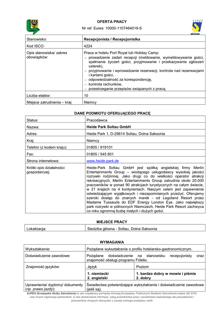 OFERTA PRACY Nr ref. Eures: 10000-1107464019-S Stanowisko: Recepcjonista / Recepcjonistka Kod ISCO: 4224 Opis stanowiska/ zakres obowiązków: Praca w hotelu Port Royal lub Holiday Camp: prowadzenie zadań recepcji (meldowanie, wymeldowywanie gości, spełnianie życzeń gości, przyjmowanie i przekazywanie zgłoszeń usterek), przyjmowanie i wprowadzanie rezerwacji, kontrola nad rezerwacjami i kartami gości, odpowiedzialność za korespondencję, kontrola rachunków, przestrzeganie przepisów związanych z pracą. Liczba etatów: 10 Miejsce zatrudnienia – kraj: Niemcy DANE PODMIOTU OFERUJĄCEGO PRACĘ Status: Pracodawca Nazwa: Heide Park Soltau GmbH Adres: Heide Park 1, D-29614 Soltau, Dolna Saksonia Kraj: Niemcy Telefon (z kodem kraju): 01805 / 919101 Fax: 01805 / 545 801 Strona internetowa: www.heide-park.de Krótki opis działalności gospodarczej: Heide-Park Soltau GmbH jest spółką angielskiej firmy Merlin Entertainments Group – wiodącego usługodawcy wysokiej jakości rozrywki rodzinnej. Jako drugi co do wielkości operator atrakcji rekreacyjnych, Merlin Entertainments Group zatrudnia około 20.000 pracowników w ponad 90 atrakcjach turystycznych na całym świecie, w 21 krajach na 4 kontynentach. Naszym celem jest zapewnienie odwiedzającym wyjątkowych i niezapomnianych przeżyć. Oferujemy szeroki dostęp do znanych marek - od Legoland Resort przez Madame Tussauds do EDF Energy London Eye. Jako największy park rozrywki w północnych Niemczech, Heide Park Resort zachwyca co roku ogromną liczbę małych i dużych gości. MIEJSCE PRACY Lokalizacja: Siedziba główna - Soltau, Dolna Saksonia WYMAGANIA Wykształcenie: Pożądane wykształcenie o profilu hotelarsko-gastronomicznym. Doświadczenie zawodowe: Pożądane doświadczenie na stanowisku znajomość obsługi programu Fidelio. Znajomość języków: Język Poziom 1. niemiecki 2. angielski 1. bardzo dobry w mowie i piśmie 2. dobry Uprawnienia/ dyplomy/ dokumenty (np. prawo jazdy): recepcjonisty oraz Świadectwa potwierdzające wykształcenie i doświadczenie zawodowe (jeśli są). EURES (Europejskie Służby Zatrudnienia) to sieć współpracy pomiędzy Komisją Europejską, Publicznymi Służbami Zatrudnienia krajów UE/ EOG oraz innych organizacji partnerskich, w celu dostarczania informacji, usług pośrednictwa pracy i poradnictwa zawodowego dla pracodawców i pracowników chcących skorzystać z zasady wolnego przepływu osób Zorientowanie na obsługę gości, przyjazny stosunek do klientów, radość z pracy zespołowej ,odporność na stres, mobilność, gotowość do pracy w weekendy, dni wolne i święta. Inne istotne wymagania: WYNAGRODZENIE I WARUNKI ZATRUDNIENIA Wysokość pensji brutto: 9,33 € Wysokość pensji netto: W zależności od klasy podatkowej Waluta, w jakiej wypłacana jest pensja: Euro Rodzaj stawki wynagrodzenia: Godzinowa Dodatkowe świadczenia: Zapewnione zakwaterowanie płatne przez pracownika (€ 110 / m-c). Ponadto pracodawca zapewnia przyjazne środowisko pracy, obszerne wprowadzenie do firmy, zmotywowany zespół, otwartość na pomysły i propozycje, program nagród/wyróżnień pracowniczych, liczne ulgi/rabaty dla pracowników. Nazwa firmy, z którą zostanie podpisana umowa: Heide Park Soltau GmbH Rodzaj umowy: Umowa na czas określony Wymiar czasu pracy Pełen etat Czas trwania umowy: 29.03 – 09.11.2014 r. (praca również na sezon wakacyjny) Zmiany i praca w dni wolne: Praca w weekendy i święta Data rozpoczęcia: Marzec 2014 r. SPOSÓB SKŁADANIA WNIOSKU Wymagane dokumenty: Kompletne CV oraz własnoręcznie podpisany formularz Bewerberbogen dokumenty (należy wypełnić w j. niemieckim). Wzory dokumentów dostępne są na stronie www.eures.dwup.pl, zakładka „Dla poszukujących pracy” > „Wzory CV” oraz „Formularze aplikacyjne”. Język, w którym muszą być sporządzone przedkładane dokumenty: Niemiecki Do kogo należy wysłać dokumenty: Do Dolnośląskiego Wojewódzkiego Urzędu Pracy Gdzie należy wysłać dokumenty: Na adres e-mail: [email protected] W tytule e-maila proszę podać nazwę stanowiska „Recepcjonista / Recepcjonistka – Heide Park”. Dane teleadresowe doradcy EURES lub przedstawiciela pracodawcy: Marta Grochowska, Dolnośląski Wojewódzki Urząd Pracy, Filia w Legnicy, Plac Słowiański 1, 59-220 Legnica DODATKOWE INFORMACJE Rozmowy kwalifikacyjne zostaną przeprowadzone drogą telefoniczną (w j. niemieckim). Pracodawca skontaktuje się z wybranymi kandydatami. WAŻNOŚĆ Data publikacji: 27.02.2014 r. Termin przedkładania podań o pracę / zakończenia ważności oferty: 14.03.2014 r. EURES (Europejskie Służby Zatrudnienia) to sieć współpracy pomiędzy Komisją Europejską, Publicznymi Służbami Zatrudnienia krajów UE/ EOG oraz innych organizacji partnerskich, w celu dostarczania informacji, usług pośrednictwa pracy i poradnictwa zawodowego dla pracodawców i pracowników chcących skorzystać z zasady wolnego przepływu osób Uprzejmie informujemy, że skontaktujemy się wyłącznie z wybranymi kandydatami. UWAGA: 1. Umowa z zagranicznym pracodawcą zostanie zawarta zgodnie z prawem kraju zatrudnienia. Oznacza to, że wszystkie roszczenia odnośnie do warunków, które obejmuje umowa, można kierować wyłącznie do odpowiedniego sądu w kraju zatrudnienia. Publiczne służby zatrudnienia (EURES) nie mogą pośredniczyć ani reprezentować pracownika w sądzie kraju zatrudnienia w przypadku sporu z pracodawcą. 2. Publiczne służby zatrudnienia (EURES) dokładają wszelkich starań, aby zapewnić rzetelność i wiarygodność ofert pracy zgłoszonych w lokalnym urzędzie pracy. Należy wyjaśnić, że oferta pracy została zgłoszona przez stronę trzecią i EURES nie odpowiada za ewentualne rozbieżności między warunkami pracy określonymi w ofercie pracy i warunkami oferowanymi przez potencjalnego pracodawcę. 3. Publiczne służby zatrudnienia (EURES) informują, że będą zbierać, przetwarzać i przekazywać pote