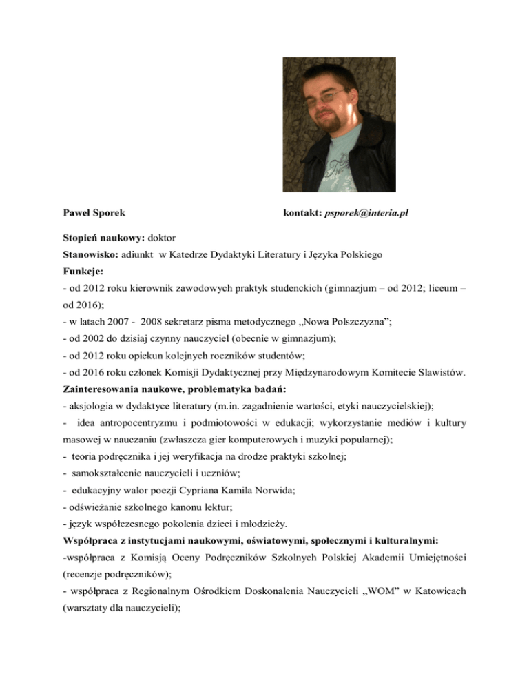 Paweł Sporek kontakt: [email protected] Stopień naukowy: doktor Stanowisko: adiunkt w Katedrze Dydaktyki Literatury i Języka Polskiego Funkcje: - od 2012 roku kierownik zawodowych praktyk studenckich (gimnazjum – od 2012; liceum – od 2016); - w latach 2007 - 2008 sekretarz pisma metodycznego „Nowa Polszczyzna”; - od 2002 do dzisiaj czynny nauczyciel (obecnie w gimnazjum); - od 2012 roku opiekun kolejnych roczników studentów; - od 2016 roku członek Komisji Dydaktycznej przy Międzynarodowym Komitecie Slawistów. Zainteresowania naukowe, problematyka badań: - aksjologia w dydaktyce literatury (m.in. zagadnienie wartości, etyki nauczycielskiej); - idea antropocentryzmu i podmiotowości w edukacji; wykorzystanie mediów i kultury masowej w nauczaniu (zwłaszcza gier komputerowych i muzyki popularnej); - teoria podręcznika i jej weryfikacja na drodze praktyki szkolnej; - samokształcenie nauczycieli i uczniów; - edukacyjny walor poezji Cypriana Kamila Norwida; - odświeżanie szkolnego kanonu lektur; - język współczesnego pokolenia dzieci i młodzieży. Współpraca z instytucjami naukowymi, oświatowymi, społecznymi i kulturalnymi: -współpraca z Komisją Oceny Podręczników Szkolnych Polskiej Akademii Umiejętności (recenzje podręczników); - współpraca z Regionalnym Ośrodkiem Doskonalenia Nauczycieli „WOM” w Katowicach (warsztaty dla nauczycieli); - w latach 2007 – 2008 praca na stanowisku sekretarza w piśmie metodycznym „Nowa Polszczyzna”; współpraca z miesięcznikiem „Polonistyka”; - wieloletnia praca na stanowisku nauczyciela w szkołach na różnych etapach kształcenia (szkoła podstawowa, gimnazjum, liceum, kształcenie dorosłych); obecnie praca w Prywatnym Gimnazjum Akademickim nr 6 w Krakowie (m.in. koordynator Zespołu Nauczycieli Języka Polskiego, autor innowacji dydaktycznych, opiekun finalistów Małopolskich Konkursów Języka Polskiego); - udział w pracach komisji w ramach Małopolskiego Konkursu Języka Polskiego dla uczniów szkół gimnazjalnych; - współpraca z licznymi szkołami Krakowa w ramach organizacji zawodowych praktyk studenckich; - współpraca z Akademią Sztuki Wojennej w Warszawie (warsztaty dla doktorantów; współpraca redakcyjna). Publikacje Monografie: Przestrzeń aksjologiczna w wybranych podręcznikach gimnazjalnych do kształcenia literackokulturowego (1999-2005), Kraków 2016. Rozdziały w monografiach wieloautorskich 1. Formuła edytorska ikonografii we współczesnych podręcznikach gimnazjalnych [w:] Podręczniki do kształcenia polonistycznego w zreformowanej szkole – koncepcje, funkcje, język, pod red. H. Synowiec, Kraków 2007. 2. Wartości estetyczne we współczesnych podręcznikach gimnazjalnych [w:] Problemy wartości i wartościowania dzieła literackiego w szkole, pod red. T. Świętosławskiej, Łódź 2007. 3. Nowoczesne TI w procesie samokształcenia polonistycznego [w:] e – polonistyka, pod red. A. Dziak i S. J. Żurka, Lublin 2009. 4. Gry komputerowe w szkole. Edukacyjne walory cRPG [w:] S. Bortnowski, Jak zmieniać polonistykę szkolną?, Warszawa 2009. 5. Koncepcja kulturoznawcza – jej transformacje oraz żywotność we współczesnej szkole [w:] Edukacja Humanistyczna, pod red. M. Sinicy i L. Jazownika, Zielona Góra 2010. 6. Lektura Norwida we współczesnych podręcznikach gimnazjalnych [w:] Annales Universitatis Pedagogice Cracoviensis. Studia At Didacticum Litterarum Polonarum et Linguae Polonie Pertinentia I, pod red. M. Jędrychowskiej, M. Sienko i J. Waligóry, Kraków 2010. 7. Mit w szkole podstawowej. Potomkowie Heraklesa – bohaterowie masowej wyobraźni na lekcjach polskiego [w:] Edukacja Humanistyczna. Rocznik naukowo – dydaktyczny, t. 8, Zielona Góra 2011. 8. Problemy z autorytetem nauczyciela we współczesnej szkole [w:] Etyka nauczyciela, pod red. S. Żurka, M. Bajan, Lublin 2011. 9. Obraz we współczesnych podręcznikach szkolnych do języka polskiego. Refleksja nad książkami szkolnymi do literatury i kultury w gimnazjum [w:] Annales Universitatis Paedagogicae Cracoviensis. Studia de Arte et Educatione, t. VI, pod red. M. Nęckiej, Kraków 2011. 10. Co, dlaczego i jak czytać z młodzieżą? Refleksje nad lekturą „Mojego drzewka pomarańczowego” J. M. de Vasconcelosa i „Zabić drozda” H. Lee [w:] Współczesne problemy badań nad recepcją i oddziaływaniem utworów literackich, pod red. L. Jazownika, Zielona Góra 2013. 11. Metodyka niesprzyjająca rozwojowi, czyli o tym, jak „czyta się” poezję współczesną w podręcznikach do literatury i kultury na poziomie szkoły podstawowej – rozpoznanie problemu [w:] Annales Universitatis Paedagogicae Cracoviensis. Studia ad Didacticam Litterarum Polonarum et Linguae Polonae Pertinentia IV, pod red. M. Szymańskiej, Kraków 2013. 12. Doświadczenie jako kategoria wyznaczająca podstawy edukacyjnego dialogu. Zarys koncepcji kształcenia wyrastającej z myśli filozoficznej Józefa Tischnera [w:] Podstawy edukacji. Sfera wartości i zasad. Konstruowanie podmiotu, t. VI, pod red. A. Gofrona i K. Motyla, Kraków 2013. 13. Uczeń jako Inny, nauczyciel jako Inny. Edukacyjny dialog w przestrzeni wspólnych oraz odmiennych doświadczeń osobistych i kulturowych na tle filozoficznej koncepcji człowieka Józefa Tischnera [w:] Podstawy edukacji. Trendy cywilizacyjne, pod red. M. Piaseckiej i A. Irasiak, Kraków 2014. 14. Treści aksjologiczne w programach nauczania języka polskiego na poziomie szkoły gimnazjalnej – diagnoza i refleksja krytyczna [w:] Polonistyka dziś – kształcenie dla jutra, pod red. K. Biedrzyckiego, W. Bobińskiego, A. Janus – Sitarz, Kraków 2014. 15. „Miałeś chamie złoty róg”. O chorobie szkolnictwa w Rzeczypospolitej i szlachetnego dorobku Komisji Edukacji Narodowej roztrwonieniu [w:] Annales Universitatis Paedagogicae Cracoviensis. Studia ad Didacticam Litterarum Polonarum et Linguae Polonae Pertinentia V. Miejsca wspólne I odmienne. Dydaktyka literatury i jęz