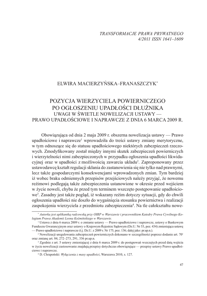 Transformacje Prawa Prywatnego 4/2011 ISSN 1641–1609 Elwira Macierzyńska–Franaszczyk* Pozycja wierzyciela powierniczego po ogłoszeniu upadłości dłużnika Uwagi w świetle nowelizacji ustawy — Prawo upadłościowe i naprawcze z dnia 6 marca 2009 r. Obowiązująca od dnia 2 maja 2009 r. obszerna nowelizacja ustawy — Prawo upadłościowe i naprawcze wprowadziła do treści ustawy zmiany merytoryczne, w tym odnoszące się do statusu upadłościowego niektórych zabezpieczeń rzeczowych. Zmodyfikowany został między innymi skutek zabezpieczeń powierniczych i wierzytelności nimi zabezpieczonych w przypadku ogłoszenia upadłości likwidacyjnej oraz w upadłości z możliwością zawarcia układu. Zaproponowany przez ustawodawcę kształt regulacji skłania do zastanowienia się nie tylko nad prawnymi, lecz także gospodarczymi konsekwencjami wprowadzonych zmian. Tym bardziej iż wobec braku odmiennych przepisów przejściowych należy przyjąć, że nowemu reżimowi podlegają także zabezpieczenia ustanowione w okresie przed wejściem w życie noweli, chyba że przed tym terminem wszczęto postępowanie upadłościowe. Zasadny jest także pogląd, iż wskazany reżim dotyczy sytuacji, gdy do chwili ogłoszenia upadłości nie doszło do wygaśnięcia stosunku powiernictwa i realizacji zaspokojenia wierzyciela z przedmiotu zabezpieczenia. Na tle całokształtu nowe* Autorka jest aplikantką radcowską przy OIRP w Warszawie i pracownikiem Katedry Prawa Cywilnego Kolegium Prawa Akademii Leona Koźmińskiego w Warszawie. Ustawa z dnia 6 marca 2009 r. o zmianie ustawy — Prawo upadłościowe i naprawcze, ustawy o Bankowym Funduszu Gwarancyjnym oraz ustawy o Krajowym Rejestrze Sądowym (Dz.U. Nr 53, poz. 434) zmieniająca ustawę — Prawo upadłościowe i naprawcze (t.j. Dz.U. z 2009 r. Nr 175, poz. 136; dalej jako: pr.up.n.). Nowelizacji uregulowania zabezpieczeń powierniczych dokonano w szczególności poprzez dodanie art. 701 oraz zmianę art. 84, 272–273, 291, 336 pr.up.n. Zgodnie z art. 5 ustawy zmieniającej z dnia 6 marca 2009 r. do postępowań wszczętych przed datą wejścia w życie nowelizacji zastosowanie znajdują przepisy dotychczas obowiązujące — przepisy ustawy Prawo upadłościowe i naprawcze. D. Chrapoński: Wyłączenia z masy upadłości, Warszawa 2010, s. 127. 47 Transformacje Prawa Prywatnego 4/2011 lizacji w niniejszym artykule poddano w szczególności analizie niejednolitość skutków nowelizacji, ale także sens odesłania do odpowiedniego zastosowania do przewłaszczenia i zabezpieczonych nim wierzytelności przepisów o zastawie rękodajnym i wierzytelnościach zabezpieczonych tym zastawem w upadłości likwidacyjnej (art. 701, art. 336 ust. 2 pr.up.n.). Funkcjonalność zabezpieczeń rzeczowych wymaga, aby prawo zabezpieczające wierzytelność było pewne, stabilne i ograniczające ryzyko wierzyciela. Z perspektywy gospodarczej ustanowienie prawnego zabezpieczenia wierzytelności służy zapewnieniu szczególnej, a co najmniej wzmocnieniu standardowej, ochrony interesów wierzycieli rzeczowych. Postulat ten pozostaje aktualny także w przypadku ogłoszenia upadłości dłużnika. Słusznie wskazuje się, iż efektywność i bezpieczeństwo instytucji zabezpieczeń wierzytelności odgrywa nieporównanie istotniejszą rolę dla współczesnej ekonomii niż procedury upadłościowe, których zasadniczy wymiar praktyczny realizuje się w zmniejszaniu ryzyka, a nie zaspokajaniu roszczeń wierzycieli. Niemniej przeciwstawienie temu postulatowi zasady równości wierzycieli upadłościowych pozwala uzasadnić pewien zakres modyfikacji pierwotnego statusu wierzycieli zabezpieczonych rzeczowo pod kątem ochrony interesów ogółu wierzycieli upadłego dłużnika. Dobro ogółu wierzycieli upadłościowych nakazuje związać węzłem upadłościowym wszystkie składniki majątkowe upadłego, z uwzględnieniem składników będących w jego faktycznym posiadaniu, z zastrzeżeniem wyłączeń przewidzianych w art. 63–67 pr.up.n. Masą upadłościową objęte zostają także składniki majątkowe, względem których mogą powstać wątpliwości co do podstaw prawnych ich włączenia do masy. Wspomniane wątpliwości w praktyce dotykały właśnie rzeczy przeniesionych na wierzyciela w celu zabezpieczenia wierzytelności, które zgodnie z istotą przewłaszczenia pozostawały najczęściej w faktycznym posiadaniu dłużnika. W świetle regulacji prawa upadłościowego i naprawczego obowiązującej przed 2 maja 2009 r. objęcie przedmiotu przewłaszczenia masą upadłości nie niweczyło możliwości późniejszego wyłączenia go spod reżimu postępowania upadłościowego w trybie roszczeń wierzyciela powierniczego opartych na art. 70 i n. pr.up.n. Przedmiot A. Gregorowicz: Wybrane problemy zabezpieczenia hipotecznego kredytów bankowych — konkluzje z ogólnopolskiej konferencji z udziałem przedstawicieli banków i sędziów wieczysto–księgowych, Prawo Bankowe 2004, nr 7–8, s. 115. Procedury upadłościowe wydłużające czas realizacji zabezpieczeń lub modyfikujące ich treść wymienia się wśród czynników najczęściej obniżających skuteczność zabezpieczeń rzeczowych; por. P.R. Wood: Comparative Law of Security Interests and Title Finance, London 2007, s. 17 oraz s. 262 i n. Za zaliczeniem składnika majątkowego do masy upadłości przemawiało domniemanie własności rzeczy znajdujących się w posiadaniu upadłego w dniu ogłoszenia upadłości (art. 69 ust. 3 pr.up.n.). Jakkolwiek zarówno na gruncie doktryny, jak i orzecznictwa istniały poglądy wskazujące na konflikt konstrukcji przewłaszczenia na zabezpieczenie zakładającej zaspokojenie bezpośrednio z przedmiotu zabezpieczenia z art. 312 k.c. i art. 75 ustawy o księgach wieczystych i hipotece (Dz.U. z 2001 r. Nr 124, poz. 1361). Por. G. Tracz, F. Zoll: Przewłaszczenie na zabezpieczenie. Praktyka. Konstrukcja. Dopuszczalność. Przedmiot, Kraków 1996, s. 111–115; w