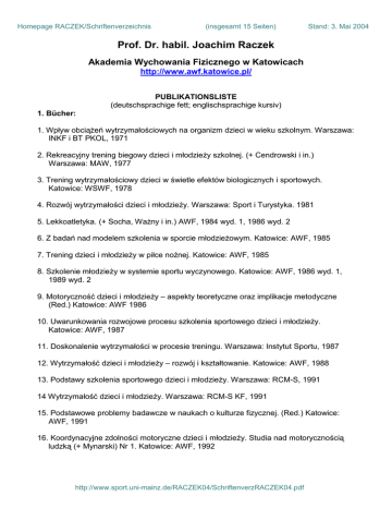 Homepage RACZEK/Schriftenverzeichnis (insgesamt 15 Seiten) Stand: 3. Mai 2004 Prof. Dr. habil. Joachim Raczek Akademia Wychowania Fizicznego w Katowicach http://www.awf.katowice.pl/ PUBLIKATIONSLISTE (deutschsprachige fett; englischsprachige kursiv) 1. Bücher: 1. Wpływ obciążeń wytrzymałościowych na organizm dzieci w wieku szkolnym. Warszawa: INKF i BT PKOL, 1971 2. Rekreacyjny trening biegowy dzieci i młodzieży szkolnej. (+ Cendrowski i in.) Warszawa: MAW, 1977 3. Trening wytrzymałościowy dzieci w świetle efektów biologicznych i sportowych. Katowice: WSWF, 1978 4. Rozwój wytrzymałości dzieci i młodzieży. Warszawa: Sport i Turystyka. 1981 5. Lekkoatletyka. (+ Socha, Ważny i in.) AWF, 1984 wyd. 1, 1986 wyd. 2 6. Z badań nad modelem szkolenia w sporcie młodzieżowym. Katowice: AWF, 1985 7. Trening dzieci i młodzieży w piłce nożnej. Katowice: AWF, 1985 8. Szkolenie młodzieży w systemie sportu wyczynowego. Katowice: AWF, 1986 wyd. 1, 1989 wyd. 2 9. Motoryczność dzieci i młodzieży – aspekty teoretyczne oraz implikacje metodyczne (Red.) Katowice: AWF 1986 10. Uwarunkowania rozwojowe procesu szkolenia sportowego dzieci i młodzieży. Katowice: AWF, 1987 11. Doskonalenie wytrzymałości w procesie treningu. Warszawa: Instytut Sportu, 1987 12. Wytrzymałość dzieci i młodzieży – rozwój i kształtowanie. Katowice: AWF, 1988 13. Podstawy szkolenia sportowego dzieci i młodzieży. Warszawa: RCM-S, 1991 14 Wytrzymałość dzieci i młodzieży. Warszawa: RCM-S KF, 1991 15. Podstawowe problemy badawcze w naukach o kulturze fizycznej. (Red.) Katowice: AWF, 1991 16. Koordynacyjne zdolności motoryczne dzieci i młodzieży. Studia nad motorycznością ludzką (+ Mynarski) Nr 1. Katowice: AWF, 1992 http://www.sport.uni-mainz.de/RACZEK04/SchriftenverzRACZEK04.pdf 2 17. W poszukiwaniu przesłanek do optymalizacji obciążeń treningowych w biegach lekkoatletycznych (+ Prus). Katowice: AWF, 1993 18. Teoretyczno-empiryczne podstawy kształtowania i diagnozowania koordynacyjnych zdolności motorycznych. Studia nad motorycznością ludzką. Nr 3 (+ Mynarski, Ljach). Katowice: AWF, 1998 19. Motor performance of Candidates to Uniwersity Study of Physical Education in Olomouc, Katowice, Bratislawa, Lubliana and Innsbruck a comparative Study (+ Mekota, Zhanel ed. al.. Olomouc: Palacky University, 1999 20. Current Research in Motor Control. (+ Juras, Waśkiewicz) Katowice: Interactiv SC, 2000 21. Kształtowanie i diagnozowanie koordynacyjnych zdolności motorycznych (+ Mynarski, Ljach). Katowice: AWF, 2002; II wyd. AWF, 2003 2. Zeitschriftenaufsätze und Buchbeiträge: 1. Wytrzymałość u dzieci w wieku 10-14 lat. Sport Wyczynowy, 1968, 8, 32-35 2. Reakcje układu krążenia u dzieci w wieku od 10 do 14 lat w zależności od zastosowanego obciążenia. Sport Wyczynowy, 1969, 1, 30-35 3. Ocena stopnia wytrzymałości ogólnej dzieci w wieku 10-14 lat na podstawie step-testu. Sport Wyczynowy, 1969, 6, 36-39 4. Obserwacje nad wpływem obciążeń wytrzymałościowych na organizm dzieci w wieku szkolnym. Sport Wyczynowy, 1970, 1, 44-46 5. Charakterystyka treningu zaawansowanych juniorów średniodystansowców. Lekkoatletyka 1972,, 9, 1-2; 10, 4-6 6. Ocena wytrzymałości ogólnej u dzieci w wieku szkolnym (+ B. Raczek). Sport Wyczynowy, 1972, 1, 26-29 7. Problemy treningu wytrzymałościowego dzieci. Lekkoatletyka, 1972, 7, 1-2 8. Specyfika treningu wytrzymałościowego dzieci. Lekkoatletyka. 1972, 8, 1-2 9. Badania nad wytrzymałością dzieci. W: Problemy treningu lekkoatletycznego. Warszawa: AWF – Instytut Sportu, 1973 10. Uwagi w sprawie organizacji i metodyki szkolenia w biegach średnich. Lekkoatletyka. 1973, 3, 5-6 11. Kształtowanie u ucznia 10-letniej szkoły ogólnokształcącej wytrzymałości, jako jednej z cech motorycznych. Warszawa: Instytut Programów Szkolnych MOiW 1974, 4-50 3 12. Rozwój specjalistyczny – biegi na średnie i długie dystanse (+ Orywał). Program dla szkół o profilu sportowym. Warszawa: Instytut Programów Szkolnych MOiW, 1974, 5274 13. Organizacja i program podstawowego przygotowania biegowego dzieci. Lekkoatletyka. 1974, 7, 2-7 14. Obciążenia oraz środki treningu w ramach podstawowego przygotowania biegowego dzieci. Lekkoatletyka. 1974, 8, 5-7 15. Intensywność treningu młodocianych biegaczy. Lekkoatletyka. 1975, 6, 6-7 16. Problematyka wytrzymałości u dzieci w wieku szkolnym. Kultura Fizyczna. 1976, 12, 548-551 17. Wybrane zagadnienia selekcji dzieci i młodzieży do konkurencji wytrzymałościowych w lekkiej atletyce. Wychowanie Fizyczne i Sport. 1976, 4, 19-44 18. Wybrane zagadnienia selekcji dzieci do biegów wytrzymałościowych w lekkoatletyce. W: Problemy selekcji i treningu młodych biegaczy na średnie i długie dystanse. Poznań: AWF, 1977, Monografie nr 99, 6-22 19. Badania nad skutecznością metod i środków treningu wytrzymałościowego dzieci. W: Problemy selekcji i treningu ... . Poznań: AWF, 1977, Monografie nr 99, 27-38 20. Częstość tętna jako wskaźnik kontroli i oceny intensywności obciążeń wysiłkowych w treningu początkujących biegaczy. W: Problemy selekcji i treningu.... . Poznań: AWF, 1977, Monografie nr 99, 49-58 21. Wpływ zróżnicowanych programów treningowych na progresję wyników sportowych w biegach średnich z dziećmi. Poznań: AWF, 1977, Monografie nr 100, 269-279 22. Zmiany adaptacyjne w organizmie dzieci pod wpływem treningu wytrzymałościowego. Sport Wyczynowy. 1977, 8, 47-58 23. Wytrzymałość a zdrowie. Lekkoatletyka. 1977, 11, 1-3 24. Eksperymentalny model doboru dzieci do szkół sportowych o profilu LA. Wychowanie Fizyczne i Higiena Szkolna. 1978, 1, 13-15 25.Rekreacyjny trening biegowy dzieci i młodzieży szkolnej. (+ Cendrowski). Wychowanie Fizyczne i Higiena Szkolna. 1978, 3, 9-16 26. O selekcji dzieci do biegów średnich i długich. W: Badania nad metodami selekcji dzieci i młodzieży do działalności sportowej. Warszawa: awf, 1978, 287-299 27. Stan biologiczny wsp