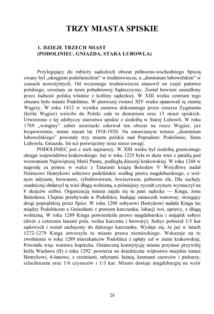 TRZY MIASTA SPISKIE 1. DZIEJE TRZECH MIAST (PODOLINIEC, GNIAZDA, STARA LUBOWLA) Przylegający do rubieży sądeckich obszar północno-wschodniego Spiszą zwany był „okręgiem podolinieckim” w średniowieczu, a „dominium lubowelskim” w czasach nowożytnych. Od wczesnego średniowiecza stanowił on część państwa polskiego, uważany za teren południowej Sądecczyzny. Został bowiem zasiedlony przez ludność polską właśnie z kotliny sądeckiej. W XIII wieku centrum tego obszaru było miasto Podoliniec. W pierwszej ćwierci XIV wieku opanowali tę ziemię Węgrzy. W roku 1412 w wyniku zastawu dokonanego przez cesarza Zygmunta (króla Węgier) wróciło do Polski całe to dominium oraz 13 miast spiskich. Utworzono z tej zdobyczy starostwo spiskie z siedzibą w Starej Lubowli. W roku 1769 „wstępny” zabór austriacki oderwał ten obszar na rzecz Węgier, już bezpowrotnie, mimo starań lat 1918-1920. Na omawianym terenie „dominium lubowelskiego” powstały trzy miasta polskie nad Popradem: Podoliniec, Stara Lubowla, Gniazda. Im też poświęcimy teraz nieco uwagi. PODOLINIEC jest z nich najstarszy. W XIII wieku był siedzibą granicznego okręgu województwa krakowskiego. Już w roku 1235 była to duża wieś z parafią pod wezwaniem Najświętszej Marii Panny, podległą diecezji krakowskiej. W roku 1244 w nagrodę za pomoc w walce z Tatarami książę Bolesław V Wstydliwy nadał Niemcowi Henrykowi sołectwo podolińskie według prawa magdeburskiego, z wolnym młynem, browarem, rybołówstwem, łowiectwem, poborem cła. Dla zachęty osadniczej obdarzył tę wieś długą wolnizną, a późniejszy ryczałt czynszu wyznaczył na 8 skojców srebra. Organizacją miasta zajęła się tu pani sądecka — Kinga, żona Bolesława. Chętnie przebywała w Podolińcu, budując zameczek warowny, strzegący drogi popradzkiej przez Spisz. W roku 1288 sołtysowi Henrykowi nadała Kinga las między Podolińcem a Gniazdami z prawem karczunku, lokacji wsi, uprawy, z długą wolnizną. W roku 1289 Kinga potwierdziła prawo magdeburskie i majątek sołtysi (dwór z czterema łanami pola, wolna karczma i browary). Sołtys pobierał 1/3 kar sądowych i został zachęcony do dalszego karczunku. Wydaje się, że już w latach 1272-1279 Kinga utworzyła tu miasto prawa niemieckiego. Wskazuje na to zwolnienie w roku 1289 mieszkańców Podolińca z opłaty ceł w ziemi krakowskiej. Powstała więc warstwa kupiecka. Ostateczną konstytycję miasta przynosi przywilej króla Wacława (II) z roku 1292: powierza on dziedziczne wójtostwo miejskie temuż Henrykowi, 6-łanowe, z rzeźniami, młynami, łaźnią, kramami szewców i piekarzy, szlachtuzem oraz 1/6 czynszów i 1/3 kar. Miasto dostaje magdeburgię na wzór 28 Krakowa. Płaci roczny czynsz po 8 skojców z lana. Mieszczanie mogą łowić ryby, dostają też prawo składu. Mieszkańcy sąsiednich jeszcze wsi Gniazd i Lubowli muszą pracować przy fortyfikacjach miejskich Podolińca. Powstaje więc potężne miasto kupiecko-rzemieślnicze na wielkiej drodze handlowej: Kraków — Nowy Sącz — Kieżmark — Lewocza. Od tej pory większość tego mieszczaństwa stanowią Polacy, mniejszość — Niemcy, ulegający zresztą stałej polonizacji. Wraz z okupacją węgierską od l ćwierci XIV wieku następuje przerwanie więzi kościelnej z Polską: parafię obejmuje arcybiskupstwo ostrzyhomskie. Rozwój miasta trwa: w roku 1343 król Ludwik I nadaje mu przywilej ,,wolnego miasta królewskiego” (podległego tylko królowi), a w roku 1345 — przywilej wolnego sądu rajców i burmistrza. W XIV wieku następuje spadkowy rozdział dziedzicznego wójtostwa; korzysta na tym miasto. W roku 1361 1/4 wójtostwa leguje się farze miejskiej z nadzorem mieszczan, 1/4 wykupuje miasto wraz z prawem do młyna i handlu mięsem, a w 1423 wykupuje resztę wójtostwa. Odtąd władzą miasta są rajcy i ława. Gotycka fara Mariacka wznoszona była od roku 1298 na rynku. Jest to kościół 1-nawowy z odrębnym prezbiterium. Dodajmy od razu, że w roku 1479 polski starosta spiski Piotr Kmita (1478-1505) odnowił ją i uposażył. Skarbem tej świątyni jest odkryta na ścianach prezbiterium XIV-wieczna polichromia. Trzeba powiedzieć o jeszcze jednej, choć legendarnej pamiątce średniowiecznego Podolińca: podmiejskim kościółku św. Anny. W początkach XI wieku w gęstej puszczy miał tu grasować zbój imieniem Krudyhop: mordował i łupił. Kiedyś doznał snu proroczego: ukazała mu się wizja piekła, jeśli nie dokona pokuty. Spotkał mnicha — benedyktyna: wyjednał spowiedź i zaczął pokutować. Wbijając maczugę w ziemię, poprosił Boga o miłosierdzie: z maczugi zakwitła lipa. Krudyhop osiadł obok w pustelniczej chatce, budując mały kościółek. W starości, po przyjęciu komunii, poprosił o świecki sąd za swe zbrodnie: ścięto mu głowę, a z cieknących łez wytrysnęło cudowne źródełko. Przetrwał kościółek, lipa i źródełko. Legenda jak zwykle ma elementy prawdy: pierwsze misje benedyktyńskie na Spiszu, groza górskich rozbójników. Wyprzedzając chronologię, stwierdźmy, że na odpust św. Anny (26 lipca) do tego kościółka ciągnęli polscy górale z całego Spiszą północnego i środkowego. W roku 1613 bernardyni warszawscy założyli tu bardzo popularne bractwo św. Anny. W roku 1412 Polska odzyskała Podoliniec jako część starostwa spiskiego w województwie krakowskim. Parafia wróciła do diecezji krakowskiej dopiero od roku 1604, która utworzyła tu, w ramach archidiakonatu sądeckiego, osobny dekanat spiski. Nastąpiła rozbudowa zamku podolinieckiego: najpierw za starosty Mikołaja Maciejowskiego (1564-1574), potem Sebastiana Lubomirskiego (15921613) w roku 1593. Stacjonowała tu 30-osobowa załoga dowodzona przez podstarościego i burgrabiego. W połowie XIX wieku zamek ten rozebrano, zachowały się tylko resztki murów miejskich. Od roku 1442 dzięki przywilejowi Władysława III Warneńczyka miasto d