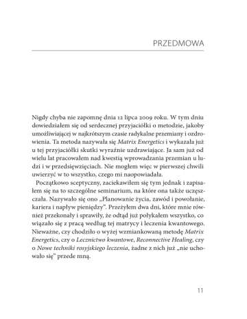 PRZEDMOWA Nigdy chyba nie zapomnę dnia 12 lipca 2009 roku. W tym dniu dowiedziałem się od serdecznej przyjaciółki o metodzie, jakoby umożliwiającej w najkrótszym czasie radykalne przemiany i ozdrowienia. Ta metoda nazywała się Matrix Energetics i wykazała już u tej przyjaciółki skutki wyraźnie uzdrawiające. Ja sam już od wielu lat pracowałem nad kwestią wprowadzania przemian u ludzi i w przedsięwzięciach. Nie mogłem więc w pierwszej chwili uwierzyć w to wszystko, czego mi naopowiadała. Początkowo sceptyczny, zaciekawiłem się tym jednak i zapisałem się na to szczególne seminarium, na które ona także uczęszczała. Nazywało się ono „Planowanie życia, zawód i powołanie, kariera i napływ pieniędzy”. Przeżyłem dwa dni, które mnie również przekonały i sprawiły, że odtąd już połykałem wszystko, co wiązało się z pracą według tej matrycy i leczenia kwantowego. Nieważne, czy chodziło o wyżej wzmiankowaną metodę Matrix Energetics, czy o Lecznictwo kwantowe, Reconnective Healing, czy o Nowe techniki rosyjskiego leczenia, żadne z nich już „nie uchowało się” przede mną. 11 Nieco później sam zorganizowałem seminarium w przedmiocie „Uzdrawiania na płaszczyźnie kwantowej” i zdumiewało mnie, co się wyczynia z moimi słuchaczami. Bez względu na to, w jakich dziedzinach życia pracowałem z nimi, zawsze coś ulegało zmianom na lepsze. Kiedy następnie zająłem się też Nowymi Dziedzinami Wiedzy, potwierdzającymi te metody, uświadomiłem sobie, że i ja muszę przyłożyć ręki do roznoszenia tej wiedzy po świecie. Każdy powinien się dowiedzieć o tej niewiarygodnej metodzie. Rozwinąłem swoją własną metodę, której nadałem nazwę Quantum Energy. W międzyczasie przeszło już po kraju półtora roku. Na świecie zaś już chyba setki tysięcy ludzi przerabiały na seminariach te nowe osiągnięcia wiedzy leczniczej i zdążyło powstać wiele książek na temat „lecznictwa kwantowego”. Otóż niniejszą książeczką chciałbym udostępnić im wgląd we wszystko, co tu możliwe. A zdumiewające jest, że na końcu tej książki wy sami znajdziecie się w pozycji umożliwiającej wam stosowanie leczenia kwantowego: ażeby dzięki temu dopełnić szczęśliwego, zdrowego życia w dobrobycie. Życzę wam wiele radości przy tej lekturze, i szczególnie przy stosowaniu opisanej tu metody. Pozdrawiam serdecznie Siranus Sven von Staden 12 CO TO JEST LECZENIE KWANTOWE? uzdrowienie na płaszczyźnie kwantowej jest zazwyczaj szybkie i przy tym proste Ten pierwszy rozdział ma być „pożywieniem” dla waszego rozumu, żebyście mogli pojąć, dlaczego leczenie kwantowe tak dobrze funkcjonuje i zarazem tak prosto. Nigdy jeszcze zmiany i uzdrowienia nie były łatwiejsze do osiągnięcia niż od czasu pojawienia się tych nowych metod leczenia. Poprzednio tylko nielicznym z uzdrawiaczy dane było dokonywać prawdziwych cudów. Dzisiaj potrafi to niby każdy; również i wy, przynajmniej po przeczytaniu tej książki. WSZYSTKO WE WSZECHŚWIECIE MA SWÓJ PORZĄDEK Fizyka kwantowa stwierdza, że wszystko we wszechświecie składa się z tej samej „substancji”, mianowicie z energii albo, ściślej mówiąc, z wibracji elektromagnetycznych. Czy to góra, czy stół, czy ludzkie ciało, składają się z zagęszczonej energii. Są więc materialne i tym samym uchwytne. Energia z delikatnej materii, taka jak powietrze, nasze myśli albo rojenia senne, jest nieuchwytna. Jednak wszystko to stanowi jedność. Wszystko jest wibracją elektromagnetyczną. Kiedy wszystko to jest „w porządku”, wszystko wibruje w naturalnym porządku. Ta harmonia pozostaje więc w naturalnym stanie, w naturalnym porządku. Jednak wydarzenia mogą prowadzić do tego, że wibracje stają się nieharmonijne. Może więc w naturze np. podwyższony wzrost ciśnienia we wnętrzu Ziemi prowadzić do eksplozji wulkanu. Także i każda populacja zwierzęca ma taki skład, że jej przyrost jest „harmonijny”. 16 Ale jeśli np. człowiek zakłóci tę harmonię, może się wydarzyć, że któryś gatunek zwierzęcy wymiera, albo że się nadmiernie rozrasta wskutek braku naturalnych nieprzyjaciół. Podobnie dzieje się z człowiekiem. Kiedy jego wahania są naturalne, jest on zdrów i zadowolony. To jego przyrodzony porządek. Tak człowiek się rodzi; nie licząc pewnych wyjątków. Szczególne okoliczności przyczyniają się do zachwiania tej harmonii. Można ją przywrócić w drodze leczenia kwantowego. Jeżeli np. na podstawie jakiegoś doświadczenia człowiek odczuwa przed czymś lęk, wówczas jego naturalny porządek zostaje naruszony. Jeżeli odczuwa ból albo choruje, wówczas coś spowodowało, że jego wibracje popadły w nieporządek. Normalnie samo ciało, za pomocą swych sił samouzdrawiających, troszczy się o uzdrowienie, tak np. zadraśnięcie na ręku samo się uzdrawia. My jednak rzadko mu pozostawiamy szanse na samouzdrowienie się, ponieważ mu nie dajemy potrzebnego na to spokoju, raczej sięgając od razu po aspirynę lub coś podobnego. Leczenie kwantowe stara się o to, żeby nasze uśpione siły samouzdrawiające na powrót rozbudzały się i mogły się zatroszczyć o porządek w „systemie”. WSZYSTKO MA SWÓJ POWÓD Nic we wszechświecie nie dzieje się bez powodu. Nauki powtarzają to nam już od bardzo dawna. Znamy to jako przyczynową zasadę działania. Więc i te sprawy, które nam doskwierają, mają swój powód. Każda obawa, niechęć albo przypływ paniki ma 17 swój powód. Każdy ból czy każda choroba mają swój powód. Jeżeli „ciągle jestem przegrany”, to ma swój powód. Również i rzekomo ciągle „niewłaściwy” partner w waszym życiu ma swój powód, dokładnie tak samo jak wściekły szef. Nic się nie dzieje bez powodu. Ważne jest, abyście uznali ten fakt. CIAŁO DOSKONALE SYGNALIZUJE Chciałbym przedstawić wam przykład. Hojnie opłacany menadżer, pan Franken, pracuje 