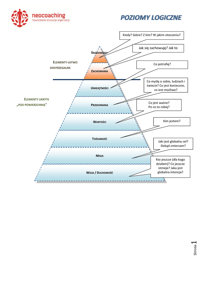 POZIOMY LOGICZNE Kiedy? Gdzie? Z kim? W jakim otoczeniu? ŚRODOWISKO ELEMENTY ŁATWO Jak się zachowuję? Jak to robię? Co potrafię? DOSTRZEGALNE ZACHOWANIA UMIEJĘTNOŚCI PRZEKONANIA WARTOŚCI TOŻSAMOŚĆ Co jest ważne? Po co to robię? Kim jestem? Jaki jest globalny cel? Dokąd zmierzam? MISJA 1 WIZJA / DUCHOWOŚĆ Kto jeszcze (dla kogo działam)? Co jeszcze istnieje? Jaka jest globalna intencja? Strona ELEMENTY UKRYTE „POD POWIERZCHNIĄ” Co myślę o sobie, ludziach i świecie? Co jest konieczne, co jest możliwe? POZIOMY LOGICZNE Ćwiczenie I. Środowisko Wybierz rolę społeczną, którą chcesz rozważyć (szefa, pracownika, ojca, matki, ucznia etc.). Opisz dokładnie warunki, w których funkcjonujesz (czyli pełnisz daną rolę). Uwzględnij otoczenie (naturalne i sztuczne), przedmioty, ale też ludzi, których na co dzień widzisz i spotykasz, swoich i obcych. .................................................................................................................................................................... .................................................................................................................................................................... .................................................................................................................................................................... .................................................................................................................................................................... .................................................................................................................................................................... .................................................................................................................................................................... .................................................................................................................................................................... .................................................................................................................................................................... .................................................................................................................................................................... .................................................................................................................................................................... II. Zachowania Opisz w jaki sposób się zachowujesz w różnych sytuacjach związanych z daną rolą: uwzględnij zarówno szczegóły (np. dojeżdżasz do szkoły / pracy autobusem czy rowerem?, pracujesz sama czy z kimś?), jak i uogólnione sposoby działania i nawyki: działasz zazwyczaj szybko czy powoli (z rozmysłem)? Odnosisz się do innych, swoich / obcych od razu przyjaźnie czy z dystansem? Etc., etc. .................................................................................................................................................................... .................................................................................................................................................................... .................................................................................................................................................................... .................................................................................................................................................................... .................................................................................................................................................................... .................................................................................................................................................................... .................................................................................................................................................................... .................................................................................................................................................................... .................................................................................................................................................................... .................................................................................................................................................................... Strona .................................................................................................................................................................... 2 .................................................................................................................................................................... POZIOMY LOGICZNE III. Umiejętności Co potrafisz, jakie talenty angażujesz w opisane powyżej zachowania? Większość z umiejętności pozostaje w ukryciu, ponieważ działania, w których jesteśmy naprawdę sprawni, szybko stają są dobrymi nawykami, przebiegają automatycznie. Jeśli poddasz je refleksji a najlepiej skrupulatnie wypiszesz – w sytuacjach trudniejszych, niestandardowych będziesz mógł się odwołać do tych zasobów, zamiast w nie wątpić! IV. 1. 2. 3. 4. 5. 6. 7. 8. 9. 10. 11. 12. 13. 14. 15. 16. 17. 18. 19. 20. Przekonania („software” osobowości) Strona Nie ma lepszych lub gorszych przekonań; wszystkie powstały na skutek wychowania, edukacji, przypadku, presji otoczenia, pierwszych doświadczeń. Wszystkie czemuś służą, coś chronią. Są jednak w tym systemie przekonań elementy WSPIERAJĄCE (np. „potrafię ugotować smaczny obiad”, „przy odrobinie treningu będę w stanie zapanować nad emocjami i stresem”) i OGRANICZAJĄCE („nawet wodę jestem w stanie przypalić…”). Te drugie są ja