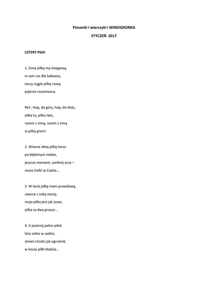 Piosenki i wierszyki i WINOGRONKA STYCZEŃ 2017 CZTERY PIŁKI 1. Zima piłkę ma śniegową, w sam raz dla bałwana, toczy ciągle piłkę nową pięknie roześmiana. Ref.: Hop, do góry, hop, do dołu, piłka tu, piłka tam, razem z zimą, razem z zimą w piłkę gram! 2. Wiosna złotą piłkę toczy po błękitnym niebie, jeszcze moment, zamknij oczy – może trafić w Ciebie... 3. W lecie piłkę mam prawdziwą, zawsze z sobą noszę, moja piłka jest jak żywa, piłka za dwa grosze... 4. A jesienią pełno piłek leży sobie w sadzie, Jesień chodzi jak ogrodnik, w kosze piłki kładzie... JAWOR Jawor, jawor jaworowi ludzie, co wy tu robicie? Budujemy mosty, dla pana starosty, tysiąc koni przepuszczamy, A jednego zatrzymamy! Piosenki i wierszyki na uroczystość dnia Babci i Dziadka Dla Babci i Dziadka 1. Wyczaruję dla babuni suknię z kropel rosy, szal z obłoczków, wstążkę z tęczy wplotę jej we włosy. ref: Babciu, droga babciu, to wszystko dla Ciebie. Babciu, droga babciu, bardzo kocham Ciebie. x 2 2. Namaluję dziadziusiowi rybek pełną rzekę, koszyk grzybów, działkę z domkiem, pieska na pociechę. ref: Dziadku, drogi dziadku, to wszystko dla Ciebie. Dziadku, drogi dziadku, bardzo kocham Ciebie. x 2
