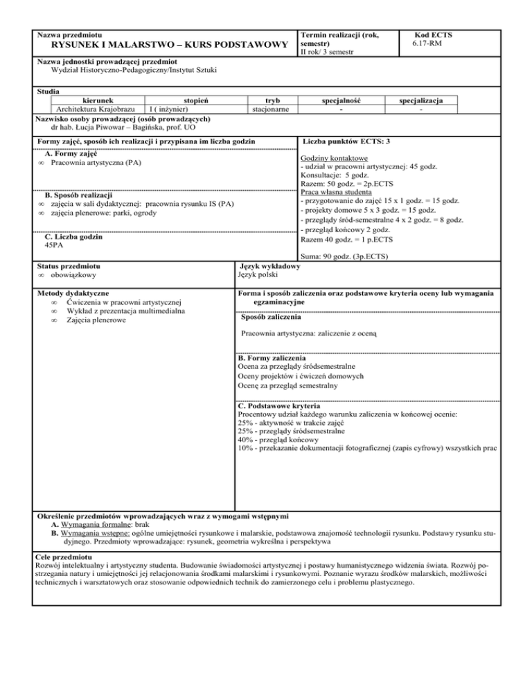 Nazwa przedmiotu RYSUNEK I MALARSTWO – KURS PODSTAWOWY Termin realizacji (rok, semestr) II rok/ 3 semestr Kod ECTS 6.17-RM Nazwa jednostki prowadzącej przedmiot Wydział Historyczno-Pedagogiczny/Instytut Sztuki Studia kierunek stopień Architektura Krajobrazu I ( inżynier) Nazwisko osoby prowadzącej (osób prowadzących) dr hab. Łucja Piwowar – Bagińska, prof. UO tryb stacjonarne specjalność - Formy zajęć, sposób ich realizacji i przypisana im liczba godzin • A. Formy zajęć Pracownia artystyczna (PA) • • B. Sposób realizacji zajęcia w sali dydaktycznej: pracownia rysunku IS (PA) zajęcia plenerowe: parki, ogrody specjalizacja - Liczba punktów ECTS: 3 Godziny kontaktowe - udział w pracowni artystycznej: 45 godz. Konsultacje: 5 godz. Razem: 50 godz. = 2p.ECTS Praca własna studenta - przygotowanie do zajęć 15 x 1 godz. = 15 godz. - projekty domowe 5 x 3 godz. = 15 godz. - przeglądy śród-semestralne 4 x 2 godz. = 8 godz. - przegląd końcowy 2 godz. Razem 40 godz. = 1 p.ECTS C. Liczba godzin 45PA Suma: 90 godz. (3p.ECTS) Status przedmiotu • obowiązkowy Język wykładowy Język polski Metody dydaktyczne • Ćwiczenia w pracowni artystycznej • Wykład z prezentacja multimedialna • Zajęcia plenerowe Forma i sposób zaliczenia oraz podstawowe kryteria oceny lub wymagania egzaminacyjne Sposób zaliczenia Pracownia artystyczna: zaliczenie z oceną B. Formy zaliczenia Ocena za przeglądy śródsemestralne Oceny projektów i ćwiczeń domowych Ocenę za przegląd semestralny C. Podstawowe kryteria Procentowy udział każdego warunku zaliczenia w końcowej ocenie: 25% - aktywność w trakcie zajęć 25% - przeglądy śródsemestralne 40% - przegląd końcowy 10% - przekazanie dokumentacji fotograficznej (zapis cyfrowy) wszystkich prac Określenie przedmiotów wprowadzających wraz z wymogami wstępnymi A. Wymagania formalne: brak B. Wymagania wstępne: ogólne umiejętności rysunkowe i malarskie, podstawowa znajomość technologii rysunku. Podstawy rysunku studyjnego. Przedmioty wprowadzające: rysunek, geometria wykreślna i perspektywa Cele przedmiotu Rozwój intelektualny i artystyczny studenta. Budowanie świadomości artystycznej i postawy humanistycznego widzenia świata. Rozwój postrzegania natury i umiejętności jej relacjonowania środkami malarskimi i rysunkowymi. Poznanie wyrazu środków malarskich, możliwości technicznych i warsztatowych oraz stosowanie odpowiednich technik do zamierzonego celu i problemu plastycznego. Treści programowe A. Problematyka wykładu - prezentacja i omówienie przykładów utworów realizowanych w technikach malarskich - omówienie i prezentacja różnorodnych rozwiązań formalnych w technice akwareli, akrylu, pasteli B. Problematyka ćwiczeń w pracowni artystycznej - rysunek i malarstwo z natury i wyobraźni – szkice i studia brył i płaszczyzn, szkice i studia krajobrazowe. - techniki narzędzia i materiały malarskie – malarstwo rysunek jako obszar poszukiwań formalnych - harmonijne łączenie technik rysunku, malarstwa i grafiki - zagadnienia kompozycji płaszczyzny obrazu - określenie kompozycji kolorystycznej / gamy kolorystycznej - rola kontrastu i akcentu malarskiego - kierunki płaszczyzn i form - zagadnienie rytmu i harmonii - związki kolorystyczne, forma, walor, światło i cień - proces eliminacji / odejmowania - zróżnicowań materii, wyrażanie kolorem faktury i materii C. Problematyka zajęć plenerowych - szkice i studia z uwzględnieniem aksonometrii i pespektywy - rysunek i malarstwo w przestrzeni – land art Wykaz literatury A. Literatura wymagana do ostatecznego zaliczenia zajęć (zdania egzaminu): A.1. wykorzystywana podczas zajęć Max Doerner, Materiały malarskie A.2. studiowana samodzielnie przez studenta Jon Gage, Kolor i kultura Rudolf Arnhem, Sztuka a percepcja wzrokowa Słownik terminologiczny sztuk pięknych B. Literatura uzupełniająca Maria Rzepińska, Historia koloru David Hockney, Wiedza tajemna. Sekrety technik malarskich dawnych mistrzów Ernst Gombrich, Sztuka i złudzenie Czasopisma polskie i zagraniczne na temat projektowania krajobrazu, sztuki współczesnej, katalogi, czasopisma, filmy, strony internetowe Odniesienie do Efekty kształcenia efektów kształ- Po ukończeniu studiów student/studentka: cenia dla kierunku P1A_W20 P1A_W20 P1A_W20 P1A_W20 P1A_W20 K1A_U08 K1A_U12 K1A_U18 Wiedza - posiada podstawową wiedzę o technikach malarskich - rozumie związki między wyborem poznanego narzędzia, a użytecznością i wyrazem estetycznym przekazu zakładanej koncepcji - posiada podstawową wiedzę z zakresu percepcji widzenia wartości barwnych i zasadach budowania obrazu kolorem. - rozwija wiedzę z zakresu kompozycji, perspektywy na płaszczyźnie układów malarskich - poznaje specjalistyczny język z zakresu sztuk pięknych Umiejętności - potrafi w praktyce wykorzystać wiedzę o poznanych technikach malarskich i rysunkowych K1A_U13 K1A_U13 - potrafi wypowiadać się i prezentować swoje pomysły - kształci umiejętność efektywnego posługiwania się wiedzą, wyobraźnią, intuicją, emocjonalnością, zdolnością twórczego, elastycznego myślenia i twórczej pracy K1A_U17 K1A_U18 - potrafi posłużyć się szkicem koncepcyjnym K1A_U05 - posługuje się językiem i nazewnictwem z zakresu sztuk pięknych Kompetencje społeczne (postawy) - rozumie potrzebę dialogu, rolę dyskusji i wymiany doświadczeń w procesie kreacji artystycznej. - wykazuje otwartą i twórczą postawą w sytuacjach wymagających poszukiwania rozwiązań nowych i niekonwencjonalnych K1A_U01 K1A_U11 Kontakt [email protected]