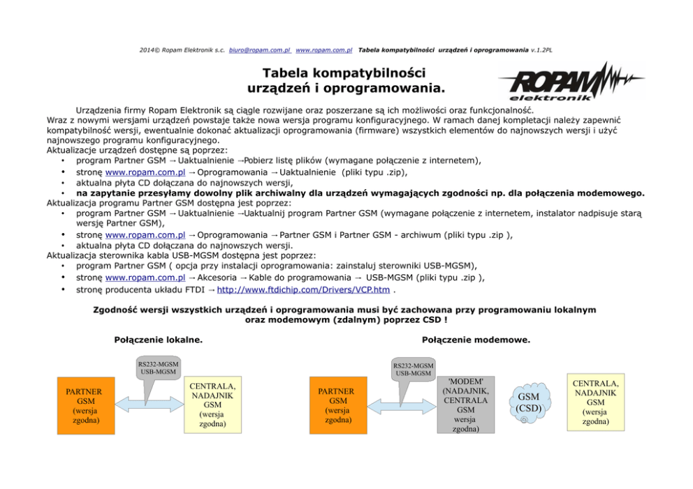 2014© Ropam Elektronik s.c. [email protected] www.ropam.com.pl Tabela kompatybilności urządzeń i oprogramowania v.1.2PL Tabela kompatybilności urządzeń i oprogramowania. Urządzenia firmy Ropam Elektronik są ciągle rozwijane oraz poszerzane są ich możliwości oraz funkcjonalność. Wraz z nowymi wersjami urządzeń powstaje także nowa wersja programu konfiguracyjnego. W ramach danej kompletacji należy zapewnić kompatybilność wersji, ewentualnie dokonać aktualizacji oprogramowania (firmware) wszystkich elementów do najnowszych wersji i użyć najnowszego programu konfiguracyjnego. Aktualizacje urządzeń dostępne są poprzez: • program Partner GSM → Uaktualnienie →Pobierz listę plików (wymagane połączenie z internetem), • stronę www.ropam.com.pl → Oprogramowania → Uaktualnienie (pliki typu .zip), • aktualna płyta CD dołączana do najnowszych wersji, • na zapytanie przesyłamy dowolny plik archiwalny dla urządzeń wymagających zgodności np. dla połączenia modemowego. Aktualizacja programu Partner GSM dostępna jest poprzez: • program Partner GSM → Uaktualnienie →Uaktualnij program Partner GSM (wymagane połączenie z internetem, instalator nadpisuje starą wersję Partner GSM), • stronę www.ropam.com.pl → Oprogramowania → Partner GSM i Partner GSM - archiwum (pliki typu .zip ), • aktualna płyta CD dołączana do najnowszych wersji. Aktualizacja sterownika kabla USB-MGSM dostępna jest poprzez: • program Partner GSM ( opcja przy instalacji oprogramowania: zainstaluj sterowniki USB-MGSM), • stronę www.ropam.com.pl → Akcesoria → Kable do programowania → USB-MGSM (pliki typu .zip ), • stronę producenta układu FTDI → http://www.ftdichip.com/Drivers/VCP.htm . Zgodność wersji wszystkich urządzeń i oprogramowania musi być zachowana przy programowaniu lokalnym oraz modemowym (zdalnym) poprzez CSD ! Połączenie lokalne. Połączenie modemowe. RS232-MGSM USB-MGSM PARTNER GSM (wersja zgodna) RS232-MGSM USB-MGSM CENTRALA, NADAJNIK GSM (wersja zgodna) PARTNER GSM (wersja zgodna) 'MODEM' (NADAJNIK, CENTRALA GSM wersja zgodna) GSM (CSD) CENTRALA, NADAJNIK GSM (wersja zgodna) 2014© Ropam Elektronik s.c. [email protected] www.ropam.com.pl MODEL Tabela kompatybilności urządzeń i oprogramowania v.1.2PL PARTNER GSM v 3.6 v 3.71 v 3.8 v 3.81 v 3.9 v 3.91 v 3.92 v 4.0 v 4.1 v 4.2 v 4.3 NEO -- -- -- v 1.0 v 1.2 v 1.3 v 1.5 v 1.7 v 1.8 v 2.0-2.1 -- MGSM 3.5 v 1.1-1.7 v 1.1-1.7 v 2.0 v 2.0 v 2.0 v 2.0 v 2.0 v 2.1 v 2.1 v 2.1 v 2.1 MGSM 4.0+ v 1.9-2.3 v 3.0-3.1 v 3.3-3.5 v 3.3-3.5 v 3.5-3.7 v 3.5-3.7 v 3.5-3.7 -- -- -- -- MGSM 4.0-GATE v 1.3-1.7 v 1.3-1.7 v 1.3-1.7 v 1.3-1.7 v 1.3-1.7 v 1.3-1.7 v 1.3-1.7 v 1.3-1.7 v 1.3-1.7 -- -- MGSM 5.0 v 1.1-1.7 v 1.1-1.7 v 1.1-1.7 v 1.1-1.7 v 1.1-1.7 v 1.1-1.7 v 1.1-1.7 v 1.1-1.7 v 1.1-1.7 v 1.1-1.7 v 1.1-1.7 BasicGSM -- -- -- -- -- -- -- -- v 1.0-1.4 v 1.5-1.7 v 1.5-1.7 MultiGSM -- -- -- -- -- -- -- -- v 1.0-1.4 v 1.5-1.6 NeoGSM v 2.0 v 1.0-1.1 Urządzenia dodatkowe współpracujące w ramach danego systemu. TPR-1x NEO -- -- -- -- v 1.0-1.1 NEO v 1.3-1.4 NEO v 1.3-1.4 NEO v 1.5 NEO v 1.5 NEO v 1.5-1.6 NEO v 1.7 NEO TPR-2x NEO -- -- -- -- v 1.0-1.1 NEO v 1.3-1.4 NEO v 1.3-1.4 NEO v 1.5 NEO v 1.5 NEO v 1.5-1.6 NEO v 1.7 NEO TPR-1x MGSM 4.0+ -- v 1.0-1.1 MGSM 4.0+ v 1.2 MGSM 4.0+ V 1.2 MGSM 4.0+ v 1.5 MGSM 4.0+ v 1.5 MGSM 4.0+ v 1.5 MGSM 4.0+ -- -- -- -- TPR-2x MGSM 4.0+ -- v 1.0-1.1 MGSM 4.0+ v 1.2 MGSM 4.0+ V 1.2 MGSM 4.0+ v 1.5 MGSM 4.0+ v 1.5 MGSM 4.0+ v 1.5 MGSM 4.0+ -- -- -- -- PSR-ECO-5012-RS PSR-ECO-5012-RN -- -- -- -- -- -- -- -- v 1.0 v 1.0 v 1.0 PSR PSR-RF v 1.3 v 1.3 v 1.3 v 1.3 v 1.3 v 1.3 v 1.3 v 1.3 v 1.3 v 1.3 v 1.3 FGR-4 v 1.0-1.1 v 1.2 v 1.2 v 1.2 v 1.2 v 1.2 v 1.2 v 1.2 v 1.2 v 1.2 v 1.2 VAR-1 -- v 1.0 v 1.0 v 1.0 v 1.0 v 1.0 v 1.0 v 1.0 v 1.0 v 1.0 v 1.0 EXP-I8 -- -- -- -- v 1.0 v 1.0 v 1.0 v 1.0 v 1.0 v 1.0 v 1.0 RF-4-x -- -- -- -- -- -- -- -- -- v1.0 v 1.0-1.1 VAR-1 -- -- -- -- -- -- -- -- -- v1.0 v1.0 Produkt archiwalny (kolor czerwony)