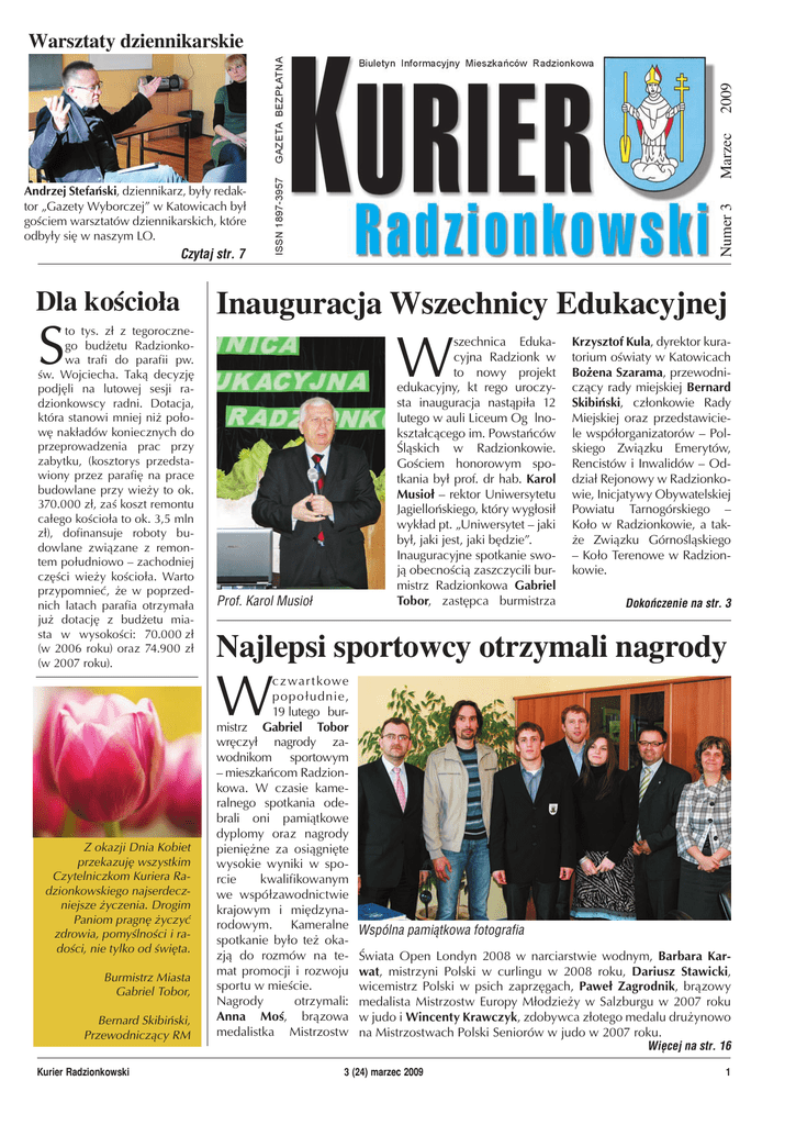 Marzec 2009 Warsztaty dziennikarskie Numer 3 Andrzej Stefański, dziennikarz, były redaktor „Gazety Wyborczej” w Katowicach był gościem warsztatów dziennikarskich, które odbyły się w naszym LO. Czytaj str. 7 Dla kościoła S to tys. zł z tegorocznego budżetu Radzionkowa trafi do parafii pw. św. Wojciecha. Taką decyzję podjęli na lutowej sesji radzionkowscy radni. Dotacja, która stanowi mniej niż połowę nakładów koniecznych do przeprowadzenia prac przy zabytku, (kosztorys przedstawiony przez parafię na prace budowlane przy wieży to ok. 370.000 zł, zaś koszt remontu całego kościoła to ok. 3,5 mln zł), dofinansuje roboty budowlane związane z remontem południowo – zachodniej części wieży kościoła. Warto przypomnieć, że w poprzednich latach parafia otrzymała już dotację z budżetu miasta w wysokości: 70.000 zł (w 2006 roku) oraz 74.900 zł (w 2007 roku). Z okazji Dnia Kobiet przekazuję wszystkim Czytelniczkom Kuriera Radzionkowskiego najserdeczniejsze życzenia. Drogim Paniom pragnę życzyć zdrowia, pomyślności i radości, nie tylko od święta. Burmistrz Miasta Gabriel Tobor, Bernard Skibiński, Przewodniczący RM Kurier Radzionkowski Inauguracja Wszechnicy Edukacyjnej W szechnica Edukacyjna Radzionków to nowy projekt edukacyjny, którego uroczysta inauguracja nastąpiła 12 lutego w auli Liceum Ogólnokształcącego im. Powstańców Śląskich w Radzionkowie. Gościem honorowym spotkania był prof. dr hab. Karol Musioł – rektor Uniwersytetu Jagiellońskiego, który wygłosił wykład pt. „Uniwersytet – jaki był, jaki jest, jaki będzie”. Inauguracyjne spotkanie swoją obecnością zaszczycili burmistrz Radzionkowa Gabriel Tobor, zastępca burmistrza Prof. Karol Musioł Krzysztof Kula, dyrektor kuratorium oświaty w Katowicach Bożena Szarama, przewodniczący rady miejskiej Bernard Skibiński, członkowie Rady Miejskiej oraz przedstawiciele współorganizatorów – Polskiego Związku Emerytów, Rencistów i Inwalidów – Oddział Rejonowy w Radzionkowie, Inicjatywy Obywatelskiej Powiatu Tarnogórskiego – Koło w Radzionkowie, a także Związku Górnośląskiego – Koło Terenowe w Radzionkowie. Dokończenie na str. 3 Najlepsi sportowcy otrzymali nagrody W c z war tkowe popołudnie , 19 lutego burmistrz Gabriel Tobor wręczył nagrody zawodnikom sportowym – mieszkańcom Radzionkowa. W czasie kameralnego spotkania odebrali oni pamiątkowe dyplomy oraz nagrody pieniężne za osiągnięte wysokie wyniki w sporcie kwalifikowanym we współzawodnictwie krajowym i międzynarodowym. Kameralne spotkanie było też okazją do rozmów na temat promocji i rozwoju sportu w mieście. Nagrody otrzymali: Anna Moś, brązowa medalistka Mistrzostw Wspólna pamiątkowa fotografia Świata Open Londyn 2008 w narciarstwie wodnym, Barbara Karwat, mistrzyni Polski w curlingu w 2008 roku, Dariusz Stawicki, wicemistrz Polski w psich zaprzęgach, Paweł Zagrodnik, brązowy medalista Mistrzostw Europy Młodzieży w Salzburgu w 2007 roku w judo i Wincenty Krawczyk, zdobywca złotego medalu drużynowo na Mistrzostwach Polski Seniorów w judo w 2007 roku. 3 (24) marzec 2009 Więcej na str. 16 Rozmowa ze Zbigniewem Głowickim, dyrektorem Samodzielnego Publicznego Zakładu Opieki Zdrowotnej w Radzionkowie Spokojnym krokiem w przyszłość — Mijają już prawie dwa lata jak objął pan funkcję dyrektora ZOZ–u w Radzionkowie, czy udało się zmienić coś przez ten czas ? — Tak to już prawie dwa lata, jak rozpocząłem pracę w tutejszej placówce. W całym tym czasie ewoluują zmiany w ośrodku, począwszy od zmian organizacyjnych, zatrudnienia nowych lekarzy, skończywszy na zakupie nowego sprzętu. Jestem przekonany, że pacjenci to dostrzegają. — Właśnie, jeżeli chodzi o pacjentów, ilu korzysta z usług ośrodka? — Zarejestrowanych jest u nas ponad 10 tys. pacjentów. Najwięcej osób pochodzi z Radzionkowa. Znaczną liczbę korzystających z usług przychodni, stanowią również mieszkańcy Bytomia, Tarnowskich Gór, Piekar Śląskich. Widzimy też tendencję wzrostową w ilości pacjentów zapisujących się do naszego ośrodka. — Z usług jakich gabinetów lekarskich można skorzystać w placówce? Jacy specjaliści w nich przyjmują? — W budynku mieści się kilka poradni, w których łącznie przyjmuje dziesięciu lekarzy. W poradni pediatrycznej nad zdrowiem najmłodszych pacjentów czuwają dr n. med. Marzena Nordyńska – Sobczak, lek. med. Iwona Iwańska – Wężykowska oraz lek. med. Jacek Zeckei. W poradni ginekologicznej zatrudniony jest lek. med. Dariusz Ćwiok. W poradni stomatologicznej przyjmuje dwóch lekarzy: lek. med. Andrzej Niewiarowski oraz lek. med. Ewa Jurczyk – Dewińska. Ponadto w przychodni przyjmuje dwóch internistów: lek. med. Adam Sokół, lek. med. Ryszard Zieliński oraz lek. med. Janusz Puchalski. — A jakie badania można wykonywać w ośrodku? — W przychodni można wykonywać badania USG: tarczycy, jamy brzusznej oraz ginekologiczne. Ponadto na terenie ośrodka znajduje się laboratorium analityczne. Można w nim wykonywać podstawowe badania, takie jak morfologia krwi czy badanie moczu. Laboratorium świadczy również szeroki zakres usług w postaci odpłatnych badań specjalistycznych. — Wspominał pan o sprzęcie, o co udało się wzbogacić placówkę w ostatnim czasie? — Tak, cały czas pracujemy nad polepszeniem jakości usług Lepsza komunikacja na Górce R adni zgodzili się, by gmina mogła kupić należące obecnie do prywatnych właścicieli działki położone przy ul. Orzechowskiej w Radzionkowie. Choć nie jest to duży teren, ma spore znaczenie dla gminy i jej mieszkańców. Autorem projektu uchwały w tej sprawie był burmistrz Gabriel Tobor, który już dawno dostrzegł problem komunikacyjny w tej części miasta, jak również problem parkowania przy cmentarzu. — Dzięki tym gruntom gmina będzie mogła poprawić komfort i rozwiązać obecny problem komunikacyjny,
