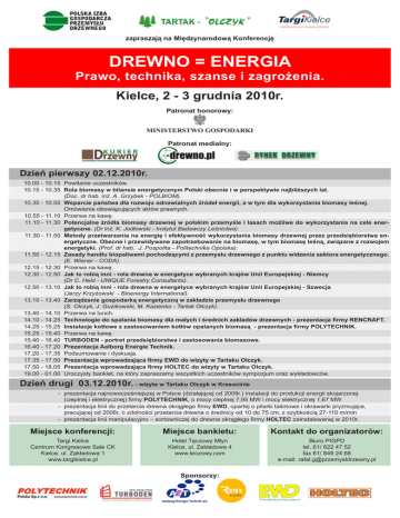zapraszają na Międzynarodową Konferencję DREWNO = ENERGIA Prawo, technika, szanse i zagrożenia. Kielce, 2 - 3 grudnia 2010r. Patronat honorowy: Patronat medialny: Dzień pierwszy 02.12.2010r. 10.00 - 10.15 Powitanie uczestników. 10.15 - 10.35 Rola biomasy w bilansie energetycznym Polski obecnie i w perspektywie najbliższych lat. (Doc. dr hab. inż. A. Grzybek - POLBIOM). 10.35 - 10.55 Wsparcie państwa dla rozwoju odnawialnych źródeł energii, a w tym dla wykorzystania biomasy leśnej. Omówienie obowiązujących aktów prawnych. 10.55 - 11.10 Przerwa na kawę. 11.10 - 11.30 Potencjalne źródła biomasy drzewnej w polskim przemyśle i lasach możliwe do wykorzystania na cele energetyczne. (Dr inż. K. Jodłowski - Instytut Badawczy Leśnictwa). 11.30 - 11.50 Metody przetwarzania na energię i efektywność wykorzystania biomasy drzewnej przez przedsiębiorstwa energetyczne. Obecne i przewidywane zapotrzebowanie na biomasę, w tym biomasę leśną, związane z rozwojem energetyki. (Prof. dr hab. J. Pospolita - Politechnika Opolska). 11.50 - 12.15 Zasady handlu biopaliwami pochodzącymi z przemysłu drzewnego z punktu widzenia sektora energetycznego. (E. Wiener - CODA). 12.15 - 12.30 Przerwa na kawę. 12.30 - 12.50 Jak to robią inni - rola drewna w energetyce wybranych krajów Unii Europejskiej - Niemcy (Dr C. Held - UNIQUE Forestry Consultants). 12.50 - 13.10 Jak to robią inni - rola drewna w energetyce wybranych krajów Unii Europejskiej - Szwecja (Jerzy Krzyżowski - Bioenergy International). 13.10 - 13.40 Zarządzanie gospodarką energetyczną w zakładzie przemysłu drzewnego (S. Olczyk, J. Guzikowski, M. Kazienko - Tartak Olczyk). 13.40 - 14.10 Przerwa na lunch. 14.10 - 14.25 Technologie do spalania biomasy dla małych i średnich zakładów drzewnych - prezentacja firmy RENCRAFT. 14.25 - 15.25 Instalacje kotłowe z zastosowaniem kotłów opalanych biomasą - prezentacja firmy POLYTECHNIK. 15.25 - 15.40 Przerwa na kawę. 15.40 - 16.40 TURBODEN - portret przedsiębiorstwa i zastosowania biomasowe. 16.40 - 17.20 Prezentacja Aalborg Energie Technik. 17.20 - 17.35 Podsumowanie i dyskusja. 17.35 - 17.50 Prezentacja wprowadzająca firmy EWD do wizyty w Tartaku Olczyk. 17.50 - 18.05 Prezentacja wprowadzająca firmy HOLTEC do wizyty w Tartaku Olczyk. 19.00 - 01.00 Uroczysty bankiet, na który zapraszamy wszystkich uczestników sympozjum oraz wykładowców. Dzień drugi 03.12.2010r. - wizyta w Tartaku Olczyk w Krasocinie - prezentacja najnowocześniejszej w Polsce (działającej od 2009r.) instalacji do produkcji energii skojarzonej (cieplnej i elektrycznej) firmy POLYTECHNIK, o mocy cieplnej 7,95 MW i mocy elektrycznej 1,67 MW - prezentacja linii do przetarcia drewna okrągłego firmy EWD, opartej o pilarki taśmowe i okrawarki pryzmujące, pracującej od 2006r, o zdolności przetarcia drewna o średnicy od 10 do 75 cm, z szybkością 27-110 m/min - prezentacja linii manipulacyjno – sortowniczej do drewna okrągłego firmy HOLTEC zainstalowanej w 2010r. Miejsce konferencji: Miejsce bankietu: Kontakt do organizatorów: Targi Kielce Centrum Kongresowe Sale CK Kielce, ul. Zakładowa 1 www.targikielce.pl Hotel Tęczowy Młyn Kielce, ul. Zakładowa 4 www.teczowy.com Biuro PIGPD tel. 61/ 822 47 52 fax 61/ 849 24 68 e-mail: [email protected] Sponsorzy:
