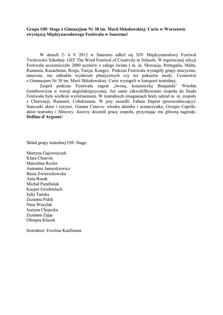 Grupa Off- Stage z Gimnazjum Nr 38 im. Marii Skłodowskiej- Curie w Warszawie zwycięzcą Międzynarodowego Festiwalu w Sanremo! W dniach 2- 6 V 2012 w Sanremo odbył się XIV Międzynarodowy Festiwal Twórczości Szkolnej- GEF The Word Festiwal of Creativity in Schools. W tegorocznej edycji Festiwalu uczestniczyło 2000 uczniów z całego świata ( m. in. Słowacja, Portugalia, Malta, Rumunia, Kazachstan, Rosja, Turcja, Kongo). Podczas Festiwalu wystąpiły grupy muzyczne, taneczne, nie zabrakło wydarzeń plastycznych czy też pokazów mody. Uczniowie z Gimnazjum Nr 38 im. Marii Skłodowskiej- Curie wystąpili w kategorii teatralnej. Zespół podczas Festiwalu zagrał „Iwonę, księżniczkę Burgunda” Witolda Gombrowicza w wersji angielskojęzycznej. Już samo zakwalifikowanie zespołu do finału Festiwalu było wielkim wyróżnieniem. W teatralnych zmaganiach brały udział m. in. zespoły z Chorwacji, Rumunii, Uzbekistanu. W jury zasiedli: Fabien Duprat (przewodniczący)francuski aktor i reżyser, Gianna Canova- włoska aktorka i scenarzystka, Giorgio Caprileaktor teatralny i filmowy. Jurorzy docenili pracę zespołu, przyznając mu główną nagrodęDelfino d’Argento! Skład grupy teatralnej Off- Stage: Martyna Gajowniczek Klara Chauvin Marcelina Rezler Antonina Januszkiewicz Basia Zwierzchowska Ania Rusak Michał Parafiniuk Kacper Grzebieluch Julia Tańska Zuzanna Pidek Nina Wasyluk Justyna Chojecka Zuzanna Zając Olimpia Kluzek Instruktor: Ewelina Kaufmann