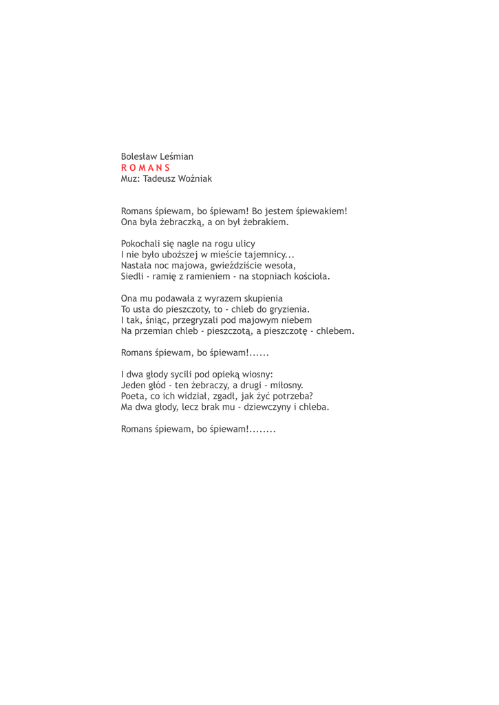 Bolesław Leśmian ROMANS Muz: Tadeusz Woźniak Romans śpiewam, bo śpiewam! Bo jestem śpiewakiem! Ona była żebraczką, a on był żebrakiem. Pokochali się nagle na rogu ulicy I nie było uboższej w mieście tajemnicy... Nastała noc majowa, gwieździście wesoła, Siedli - ramię z ramieniem - na stopniach kościoła. Ona mu podawała z wyrazem skupienia To usta do pieszczoty, to - chleb do gryzienia. I tak, śniąc, przegryzali pod majowym niebem Na przemian chleb - pieszczotą, a pieszczotę - chlebem. Romans śpiewam, bo śpiewam!...... I dwa głody sycili pod opieką wiosny: Jeden głód - ten żebraczy, a drugi - miłosny. Poeta, co ich widział, zgadł, jak żyć potrzeba? Ma dwa głody, lecz brak mu - dziewczyny i chleba. Romans śpiewam, bo śpiewam!........