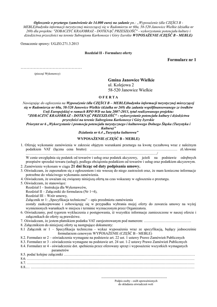 Ogłoszenie o przetargu (zamówienie do 14.000 euro) na zadanie pn.: „Wyposażenie (dla CZĘŚCI B MEBLE)budynku informacji turystycznej mieszczącej się w Radomierzu nr 60a, 58-520 Janowice Wielkie (działka nr 269) dla projektu: "ZOBACZYĆ KRAJOBRAZ - DOTKNĄĆ PRZESZŁOŚĆ" - wykorzystanie potencjału kultury i dziedzictwa przeszłości na terenie Subregionu Karkonosze i Góry Izerskie WYPOSAŻENIE (CZĘŚĆ B - MEBLE) Oznaczenie sprawy: UG.ZO.271.3.2013 Rozdział II - Formularz oferty Formularz nr 1 …………………………………… (pieczęć Wykonawcy) Gmina Janowice Wielkie ul. Kolejowa 2 58-520 Janowice Wielkie O FE RTA Nawiązując do ogłoszenia na Wyposażenie (dla CZĘŚCI B – MEBLE)budynku informacji turystycznej mieszczącej się w Radomierzu nr 60a, 58-520 Janowice Wielkie (działka nr 269) dla zadania współfinansowanego ze środków Unii Europejskiej w ramach RPO WD na lata 2007-2013, tytuł realizowanego projektu: "ZOBACZYĆ KRAJOBRAZ - DOTKNĄĆ PRZESZŁOŚĆ" - wykorzystanie potencjału kultury i dziedzictwa przeszłości na terenie Subregionu Karkonosze i Góry Izerskie Priorytet nr 6 „Wykorzystanie i promocja potencjału turystycznego i kulturowego Dolnego Śląska (Turystyka i Kultura)” Działania nr 6.4 „Turystyka kulturowa” WYPOSAŻENIE (CZĘŚĆ B - MEBLE) 1. Oferuję wykonanie zamówienia w zakresie objętym warunkami przetargu na kwotę ryczałtową wraz z należnym podatkiem VAT (łączna cena brutto): ……………………………………………………………… zł./słownie ………………………………………………………………………………………………/ W cenie uwzględnia się podatek od towarów i usług oraz podatek akcyzowy, jeżeli na podstawie odrębnych przepisów sprzedaż towaru (usługi), podlega obciążeniu podatkiem od towarów i usług oraz podatkiem akcyzowym. 2. Zamówienie wykonam w ciągu 21 dni licząc od daty podpisania umowy. 3. Oświadczam, że zapoznałem się z ogłoszeniem i nie wnoszę do niego zastrzeżeń oraz, że mam konieczne informacje potrzebne do właściwego wykonania zamówienia. 4. Oświadczam, że uważam się związany niniejszą ofertą na czas wskazany w ogłoszeniu o przetargu. 5. Oświadczam, że stanowiące: Rozdział I – Instrukcja dla Wykonawców, Rozdział II – Załączniki do formularza (Nr 1÷4), Rozdział III – Wzór umowy, Załącznik nr 1: „Specyfikacja techniczna” – opis przedmiotu zamówienia zostały zaakceptowane i zobowiązuję się w przypadku wybrania mojej oferty do zawarcia umowy na wyżej wymienionych warunkach w miejscu i terminie wyznaczonym przez Organizatora. 6. Oświadczamy, pod rygorem wykluczenia z postępowania, iż wszystkie informacje zamieszczone w naszej ofercie i załącznikach do oferty są prawdziwe. 7. Oświadczam, że jestem płatnikiem podatku VAT zarejestrowanym pod numerem: ………………………………… 8. Załącznikiem do niniejszej oferty są następujące dokumenty: 8.1 Załącznik nr 1 – Specyfikacja techniczna - wykaz wyposażenia wraz ze specyfikacją, będący jednocześnie formularzem cenowym WYPOSAŻENIE (CZĘŚĆ B - MEBLE) 8.2. Formularz nr 2 – oświadczenia wymagane na podstawie art. 22 ust. 1 ustawy Prawo Zamówień Publicznych 8.3. Formularz nr 3 - oświadczenia wymagane na podstawie art. 24 ust. 1-2 ustawy Prawo Zamówień Publicznych 8.4. Formularz nr 4 - oświadczenie dot. spełnienia przez oferowany sprzęt i wyposażenie wszystkich wymaganych parametrów 8.5. podać kolejne załączniki ……………………………………………………………………………………………… 8.6. ………………………………………………………………………………………………………………………… 8.7. ………………………………………………………………………………………………………………………… 8.8.… ……………………………………………………………………………………………………………………… ............................................................ Podpis osoby - osób upoważnionych do składania oświadczeń woli