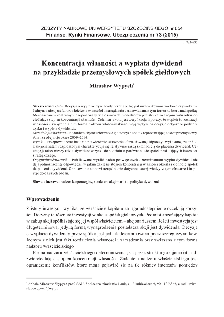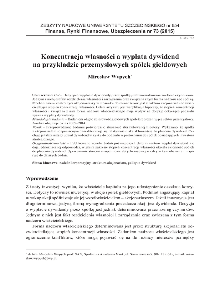 ZESZYTY NAUKOWE UNIWERSYTETU SZCZECIŃSKIEGO nr 854 Finanse, Rynki Finansowe, Ubezpieczenia nr 73 (2015) s. 783–792 Koncentracja własności a wypłata dywidend na przykładzie przemysłowych spółek giełdowych Mirosław Wypych* Streszczenie: Cel – Decyzja o wypłacie dywidendy przez spółkę jest uwarunkowana wieloma czynnikami. Jednym z nich jest fakt rozdzielenia własności i zarządzania oraz związana z tym forma nadzoru nad spółką. Mechanizmem kontrolnym akcjonariuszy w stosunku do menedżerów jest struktura akcjonariatu odzwierciedlająca stopień koncentracji własności. Celem artykułu jest weryfikacja hipotezy, że stopień koncentracji własności i związana z nim forma nadzoru właścicielskiego mają wpływ na decyzje dotyczące podziału zysku i wypłaty dywidendy. Metodologia badania – Badaniem objęto zbiorowość giełdowych spółek reprezentującą sektor przemysłowy. Analiza obejmuje okres 2009–2014. Wynik – Przeprowadzone badanie potwierdziło słuszność sformułowanej hipotezy. Wykazano, że spółki z akcjonariatem rozproszonym charakteryzują się relatywnie niską skłonnością do płacenia dywidend. Cechuje je także niższy udział dywidend w zysku do podziału w porównaniu do spółek posiadających inwestora strategicznego. Oryginalność/wartość – Publikowane wyniki badań poświęconych determinantom wypłat dywidend nie dają jednoznacznej odpowiedzi, w jakim zakresie stopień koncentracji własności określa skłonność spółek do płacenia dywidend. Opracowanie stanowi uzupełnienie dotychczasowej wiedzy w tym obszarze i inspiruje do dalszych badań. Słowa kluczowe: nadzór korporacyjny, struktura akcjonariatu, polityka dywidend Wprowadzenie Z istoty inwestycji wynika, że właściciele kapitału za jego udostępnienie oczekują korzyści. Dotyczy to również inwestycji w akcje spółek giełdowych. Podmiot angażujący kapitał w zakup akcji spółki staje się jej współwłaścicielem – akcjonariuszem. Jeżeli inwestycja jest długoterminowa, jedyną formą wynagrodzenia posiadacza akcji jest dywidenda. Decyzja o wypłacie dywidendy przez spółkę jest jednak determinowana przez szereg czynników. Jednym z nich jest fakt rozdzielenia własności i zarządzania oraz związana z tym forma nadzoru właścicielskiego. Forma nadzoru właścicielskiego determinowana jest przez strukturę akcjonariatu odzwierciedlającą stopień koncentracji własności. Zadaniem nadzoru właścicielskiego jest ograniczenie konfliktów, które mogą pojawiać się na tle różnicy interesów pomiędzy * dr hab. Mirosław Wypych prof. SAN, Społeczna Akademia Nauk, ul. Sienkiewicza 9, 90-113 Łódź, e-mail: [email protected]. 784 Mirosław Wypych dawcami kapitału a kadrą zarządzającą. Odnosi się to między innymi do podziału zysku i decyzji o wypłacie dywidendy. Wypłata dywidendy dla akcjonariusza jest korzyścią, ale dla spółki stanowi koszt – uszczerbek kapitału. Menedżerowie mogą być zainteresowani zatrzymaniem zysku i przeznaczeniem go na cele inwestycyjne. Można postawić hipotezę, że stopień koncentracji własności i związana z nim forma nadzoru właścicielskiego mają wpływ na decyzje dotyczące podziału zysku i wypłaty dywidendy. W celu weryfikacji tak sformułowanej hipotezy dokonano analizy wypłat dywidend przez spółki giełdowe reprezentujące sektor przemysłu. Badaniem objęto 108 spółek, których akcje notowane były na giełdzie w latach 2009–2014. 1. Koncentracja własności jako mechanizm nadzoru korporacyjnego Spółka akcyjna jest uznawana za najbardziej typową formę organizacyjno-prawną przedsiębiorstw w gospodarce rynkowej. Jedną z fundamentalnych cech spółki akcyjnej jest rozdzielenie własności i zarządzania. Zarządzaniem zajmują się menedżerowie, którzy są upoważnieni przez właścicieli do podejmowania decyzji zarówno bieżących, jak i strategicznych związanych z funkcjonowaniem spółki. Konsekwencją oddzielenia zarządzania od własności jest jednak możliwość powstania konfliktów między menedżerami a akcjonariuszami. Na tym tle pojawił się problem sprawowania kontroli nad działalnością zarządu, służącej dbałości o przetrwanie i rozwój spółki oraz zapewnienia realizacji podstawowego celu przedsiębiorstwa, jakim jest maksymalizacja zwrotu z zainwestowanego przez właścicieli kapitału. Problem ten powszechnie prezentowany jest w literaturze jako nadzór właścicielski. Pod pojęciem nadzoru właścicielskiego rozumie się sposób egzekwowania praw własnościowych w relacji między akcjonariuszami a zarządem sprawowany przez właściciela lub grupę właścicieli. Pojęciem zbliżonym do nadzoru właścicielskiego jest nadzór korporacyjny, który obejmuje także formalną i nieformalną strukturę wpływów na najważniejsze decyzje podejmowane przez menedżerów (Zalega 2003). Mechanizmem kontrolnym akcjonariuszy w stosunku do menedżerów jest struktura akcjonariatu, odzwierciedlająca możliwość ingerencji akcjonariuszy w zachowanie kadry zarządzającej. Należy w tym miejscu zaznaczyć, że prawa z akcji w świetle teorii własności są prawami ułomnymi. Ułomność praw z akcji polega na tym, że nie gwarantują one kontroli nad sposobem wykorzystania powierzonego spółce kapitału (Jeżak 2004). Tak jak spółka jest w istocie instytucją, która sprzedaje obietnice przyszłych zysków, tak akcjonariusze są dawcami kapitału oraz właścicielami posiadanych akcji, ale nie są właścicielami przedsiębiorstwa prowadzonego przez spółkę. Delegowanie władzy i decyzji w zakresie zarządzania kapitałem na rzecz menedżerów jest konieczne z uwagi na różnorodność i złożoność decyzji zarządczych. Ale nie oznacza to, że właścicielami spółki stają się menedżerowie. To struktura akcjonariatu decyduje, w jakim zakresie akcjonariusze mogą nadzorować menedżerów. Koncentracja własności a wypłata dywidend n