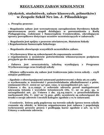 REGULAMIN ZABAW SZKOLNYCH (dyskotek, studniówek, zabaw klasowych, półmetków) w Zespole Szkół Nr1 im. J. Piłsudskiego 1. Przepisy prawne: - Regulamin zabaw jest wewnętrznym zarządzeniem Dyrektora Szkoły opracowanym przez zespół działający w porozumieniu z Radą Pedagogiczną, rodzicami i Samorządem Uczniowskim, określającym sprawy porządkowe dotyczące uczniów uczestniczących w zabawach. - Regulamin jest spójny z prawem oświatowym, Statutem Szkoły i Regulaminem Samorządu Szkolnego - Regulamin obowiązuje wszystkich uczestników zabaw. - Wychowawcy klas są zobowiązani do zapoznania uczniów z regulaminem a uczniowie potwierdzenia własnoręcznym podpisem przyjęcie go do wiadomości. - Zabawa jest uroczystością szkolną Wychowawczego oraz tradycji szkoły wynikającą z Programu - Miejsce odbywania się zabaw jest traktowane jako teren szkoły - czyli miejsce publiczne - Zgodnie z obowiązującymi ustawami państwowymi z dnia 26.10.1982 o wychowaniu w trzeźwości i przeciwdziałaniu alkoholizmowi z późn, zmianami (Dz.U. 2002 nr 147 poz. 1231, w szczególności art. 14) ; Ustawa z dn. 9.11.1995r. o ochronie zdrowia przed następstwami używania tytoniu i wyrobów tytoniowych (Dz. U. nr 10 poz. 55, w szczególności art. 5); Ustawa z dn. 24.04.1997r. o przeciwdziałaniu narkomanii (Dz. U. 1997 nr 75 poz. 468), uczniowie są zobowiązani do troski o swoje zdrowie i swoich kolegów zgodnie z w/w ustawami. - Uczniowie, którzy palą papierosy na terenie szkoły (przez teren szkoły rozumie się obiekt, w którym organizowana jest zabawa ) popełniają wykroczenie przeciw prawu i podlegają karze zgodnie z art. 13 w/w Ustawy o ochronie zdrowia. Uczniowie, którzy łamią wyżej wymienione ustawy podlegają następującym karom: - natychmiastowym powiadomieniu rodziców o wykroczeniu i ich wezwaniu, - powiadomieniu policji o wykroczeniu, - zakończeniu udziału w zabawie, - wszczęciu procedur przewidzianych w Statucie Szkoły. 2. Cel zabawy: - zagospodarowanie czasu wolnego uczniów szkoły - integracja uczniów szkoły, klasy, nauczycieli, rodziców 3. Uczestnictwo - uczestnikiem może być każdy uczeń szkoły z wyjątkiem tych, którzy zostali ukarani naganą dyrektora szkoły - w dyskotekach szkolnych nie mogą uczestniczyć osoby spoza szkoły z wyjątkiem tych, którzy pozostawią na czas trwania zabawy ważną legitymację szkolną oraz pisemną zgodę rodziców - wszyscy uczestnicy zabaw zobowiązani są do posiadania ważnej legitymacji szkolnej oraz pisemnej zgody rodziców na udział w imprezie i bezpieczny dowóz i powrót swoich dzieci. Uczniowie którzy nie okażą ważnej legitymacji i zgody nie będą wpuszczeni na dyskotekę. - za pozostawienie w czystości obiektu szkolnego (korytarze, toalety i inne wykorzystywane pomieszczenia) odpowiedzialni są przede wszystkim uczestnicy, organizatorzy, Samorząd Uczniowski, opiekunowie, pracownicy obsługi - straty materialne wynikłe podczas zabaw pokrywane są przez rodziców sprawcy lub sprawców, lub z zysku osiągniętego przez organizatorów - opieką w czasie zabaw objęci są tylko uczniowie, którzy znajdują się w budynku szkoły ( lista uczestników, pisemne zgody rodziców pozostają w dokumentacji Samorządu Szkolnego) - uczeń, biorący udział w zabawie nie może opuszczać budynku w trakcie jej trwania. Wyjście z budynku jest jednoznaczne z rezygnacją z zabawy i udaniem się do domu - w czasie zabaw obowiązują wszelkie zasady dobrego zachowania - w czasie imprez szkolnych zakazane są niebezpieczne zabawy oraz zachowania zagrażające bezpieczeństwu uczestników (zaczepki, bójki, wymuszenia itp.) 4. Organizacja zabawy: - organizatorem dyskotek jest Samorząd Szkolny wraz z opiekunem; opiekunami są nauczyciele zgodnie z listą wg alfabetu (1 opiekun/ 30 uczniów) - organizatorem zabaw klasowych, „półmetków” jest Samorząd Klasowy wraz z wychowawcą i rodzicami, którzy sprawują opiekę w trakcie ich trwania - organizatorem „studniówek” jest wychowawca klasy maturalnej wraz z uczniami tych klas i ich rodzicami - Osobami odpowiedzialnymi za przygotowanie i przeprowadzenie studniówki są: • Rodzice na których spoczywa obowiązek bezpiecznego dowozu i powrotu młodzieży do domu i organizację menu (zaświadczenie) • Wychowawcy za szeroko pojęte sprawy wychowawcze, organizację, bezpieczeństwo uczestników - jednorazowo w zabawie szkolnej może wziąć udział do 250 uczestników (z wyjątkiem studniówek) - planując zabawę szkolną (wszystkich typów) organizatorzy zobowiązani są uzyskać zgodę dyrektora szkoły dotyczącą: 1) terminu 2) czasu trwania: dyskotek (1700 – 2200) półmetków (1700 – 2400) studniówek (1900 – 600) 3) miejsca: Zespół Szkół Nr1 ( do roku szkolnego 2007/08 miejsce zabawy studniówkowej jest zgodne z wcześniejszą rezerwacją) 4) zasad korzystania, z pomieszczeń szkolnych - o zamiarze zorganizowania i czasie zabawy szkolnej należy powiadomić z odpowiednim tygodniowym wyprzedzeniem Komendę Policji - dyskoteki szkolne są odpłatne dla uczestników. O cenie biletu i wydatkowaniu zebranych środków decyduje Samorząd Szkolny wraz z opiekunem, organizatorzy - 0rganizatorzy nie odpowiadają za pozostawione na terenie szkoły podczas odbywającej się dyskoteki odzieży, telefonów komórkowych, biżuterii, pieniędzy itp. - uczestnika dyskoteki usuniętego za nieprzestrzeganie Regulaminu musi osobiście ze szkoły odebrać rodzic . Organizatorzy zabaw mają obowiązek poinformowania dyrektora szkoły o zaistniałym fakcie - udział w zabawie jest wyrażeniem akceptacji niniejszego Regulaminu