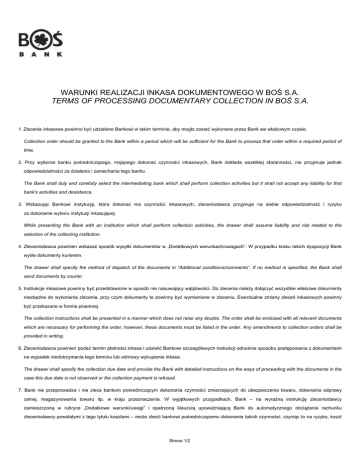 WARUNKI REALIZACJI INKASA DOKUMENTOWEGO W BOŚ S.A. TERMS OF PROCESSING DOCUMENTARY COLLECTION IN BOŚ S.A. 1. Zlecenie inkasowe powinno być udzielone Bankowi w takim terminie, aby mogło zostać wykonane przez Bank we właściwym czasie. Collection order should be granted to the Bank within a period which will be sufficient for the Bank to process that order within a required period of time. 2. Przy wyborze banku pośredniczącego, mającego dokonać czynności inkasowych, Bank dokłada wszelkiej staranności, nie przyjmuje jednak odpowiedzialności za działania i zaniechania tego banku. The Bank shall duly and carefully select the intermediating bank which shall perform collection activities but it shall not accept any liability for that bank's activities and desistance. 3. Wskazując Bankowi instytucję, która dokonać ma czynności inkasowych, zleceniodawca przyjmuje na siebie odpowiedzialność i ryzyko za dokonanie wyboru instytucji inkasującej. While presenting the Bank with an institution which shall perform collection activities, the drawer shall assume liability and risk related to the selection of the collecting institution. 4. Zleceniodawca powinien wskazać sposób wysyłki dokumentów w „Dodatkowych warunkach/uwagach”. W przypadku braku takich dyspozycji Bank wyśle dokumenty kurierem. The drawer shall specify the method of dispatch of the documents in “Additional conditions/comments”. If no method is specified, the Bank shall send documents by courier. 5. Instrukcje inkasowe powinny być przedstawione w sposób nie nasuwający wątpliwości. Do zlecenia należy dołączyć wszystkie właściwe dokumenty niezbędne do wykonania zlecenia, przy czym dokumenty te powinny być wymienione w zleceniu. Ewentualne zmiany zleceń inkasowych powinny być przekazane w formie pisemnej. The collection instructions shall be presented in a manner which does not raise any doubts. The order shall be enclosed with all relevant documents which are necessary for performing the order, however, these documents must be listed in the order. Any amendments to collection orders shall be provided in writing. 6. Zleceniodawca powinien podać termin płatności inkasa i udzielić Bankowi szczegółowych instrukcji odnośnie sposobu postępowania z dokumentami na wypadek niedotrzymania tego terminu lub odmowy wykupienia inkasa. The drawer shall specify the collection due date and provide the Bank with detailed instructions on the ways of proceeding with the documents in the case this due date is not observed or the collection payment is refused. 7. Bank nie przeprowadza i nie zleca bankom pośredniczącym dokonania czynności zmierzających do ubezpieczenia towaru, dokonania odprawy celnej, magazynowania towaru itp. w kraju przeznaczenia. W wyjątkowych przypadkach, Bank – na wyraźną instrukcję zleceniodawcy zamieszczoną w rubryce „Dodatkowe warunki/uwagi” i opatrzoną klauzulą upoważniającą Bank do automatycznego obciążenia rachunku zleceniodawcy powstałymi z tego tytułu kosztami – może zlecić bankowi pośredniczącemu dokonanie takich czynności, czyniąc to na ryzyko, koszt Strona 1/2 i odpowiedzialność zleceniodawcy. Bank zastrzega, że w takich przypadkach nie ponosi żadnej odpowiedzialności za odmowę, brak lub skutki działania banku pośredniczącego oraz spedytorów, itp. The Bank shall not perform, and shall not order with other intermediating banks, activities aimed at insuring the goods, completing the customs control, storage of the goods etc. in the destination country. In special cases, the Bank – upon the drawer's clear instruction contained in column "Additional conditions/comments" and containing a clause which authorised the Bank to automatically debit the drawer's account with costs arising from that – shall have the right to order, with an intermediating bank, to perform such activities, at the drawer's own risk, cost, and liability. The Bank shall make this reservation that in such cases it shall not bear any liability for a refusal, lack or results of actions performed by the intermediating bank, forwarding companies etc. 8. Zlecenie inkasowe powinno zawierać instrukcje dotyczące ewentualnego dokonania czynności zachowawczych w odniesieniu do weksli (protest). Bank nie przyjmuje odpowiedzialności za wykonanie tych instrukcji przez bank pośredniczący, do którego dokumenty inkasowe zostaną przez Bank przesłane. The collection order shall contain instructions on potential performance of activities with regard to the bills of exchange (protest). The Bank shall not assume liability for executing these instructions by the intermediating bank to which the Bank shall send the collection documents. 9. Jeżeli w wekslu trasowanym trasat ma ustalić domicyl – zleceniodawca powinien wskazać w miejscu „Dodatkowe warunki/uwagi” kto ponosi koszty domicylowania. If in a drawn bill of exchange the drawee is to determine a domicile – the drawer shall indicate, in box "Additional conditions/comments", who pays the cost of domiciling. 10. W przypadku braku odmiennych dyspozycji Bank przyjmuje, iż: If there are no different instructions, the Bank assumes that: 1) prowizje i koszty Banku oraz banku pośredniczącego obciążają zleceniodawcę; the commissions and fees of the Bank and the intermediating bank shall be paid by the drawer; 2) jeżeli zleceniodawca zaznaczył, że prowizje i koszty należne Bankowi pośredniczącemu obciążają płatnika, lecz nie uzależnił wydania dokumentów od ich pokrycia Bank może wydać dokumenty płatnikowi za zapłatę kwoty inkasa nawet wówczas, gdy odmówił on pokrycia prowizji i kosztów. W takim przypadku nie pokrytą prowizję i koszty potrąca się z należności inkasowej. if the drawer has indicated that the commissions and fees due to the intermediating bank are to be paid by the drawee, but has not made the provision of documents dependent on payment of those commissions and fees, the Bank