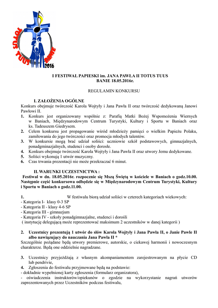 I FESTIWAL PAPIESKI im. JANA PAWŁA II TOTUS TUUS BANIE 18.05.2016r. REGULAMIN KONKURSU I. ZAŁOŻENIA OGÓLNE Konkurs obejmuje twórczość Karola Wojtyły i Jana Pawła II oraz twórczość dedykowaną Janowi Pawłowi II. 1. Konkurs jest organizowany wspólnie z: Parafią Matki Bożej Wspomożenia Wiernych w Baniach, Międzynarodowym Centrum Turystyki, Kultury i Sportu w Baniach oraz ks. Tadeuszem Giedrysem. 2. Celem konkursu jest propagowanie wśród młodzieży pamięci o wielkim Papieżu Polaku, zamiłowania do jego twórczości oraz promocja młodych talentów. 3. W konkursie mogą brać udział soliści: uczniowie szkół podstawowych, gimnazjalnych, ponadgminazjalnych, studenci i osoby dorosłe. 4. Konkurs obejmuje twórczość Karola Wojtyły i Jana Pawła II oraz utwory Jemu dedykowane. 5. Soliści wykonują 1 utwór muzyczny. 6. Czas trwania prezentacji nie może przekraczać 6 minut. II. WARUNKI UCZESTNICTWA : Festiwal w dn. 18.05.2016r. rozpocznie się Mszą Świętą w kościele w Baniach o godz.10.00. Następnie część konkursowa odbędzie się w Międzynarodowym Centrum Turystyki, Kultury i Sportu w Baniach o godz.11.00. 1. W festiwalu biorą udział soliści w czterech kategoriach wiekowych: - Kategoria I- klasy 0-3 SP - Kategoria II - klasy 4-6 SP - Kategoria III - gimnazjum - Kategoria IV - szkoły ponadgimnazjalne, studenci i dorośli ( instytucję delegującą może reprezentować maksimum 2 uczestników w danej kategorii ) 2. Uczestnicy prezentują 1 utwór do słów Karola Wojtyły i Jana Pawła II, o Janie Pawle II albo nawiązujący do nauczania Jana Pawła II * Szczególnie pożądane będą utwory premierowe, autorskie, o ciekawej harmonii i nowoczesnym charakterze. Będą one oddzielnie nagradzane. 3. Uczestnicy przyjeżdżają z własnym akompaniamentem zarejestrowanym na płycie CD lub pendrivie, 4. Zgłoszenia do festiwalu przyjmowane będą na podstawie: - dokładnie wypełnionej karty zgłoszenia (formularz organizatora), - oświadczenia instruktorów/opiekunów o zgodzie na wykorzystanie nagrań utworów zaprezentowanych przez Uczestników podczas festiwalu, - znajomość regulaminu potwierdzają opiekunowie Uczestników lub pełnoletni Uczestnicy, podpisując czytelnie karty zgłoszeń, - kompletnie wypełnioną Kartę Zgłoszenia należy dostarczyć organizatorom pocztą lub na adres mailowy do dnia: 11.05.2016r. pod adres: Międzynarodowe Centrum Turystyki, Kultury i Sportu ul. Skośna 7, 74-110 Banie, e-mail: [email protected] (tel.91 41 66 366) 5. Laureat Grand Prix nie bierze udziału w następnych edycjach konkursu. III. JURY Komisja powołana przez organizatorów oceniać będzie Wykonawców w 4 kategoriach wiekowych przyjmując następujące kryteria oceny: - warunki głosowe - muzykalność - interpretacja - dykcja - ogólny wyraz artystyczny - jury może przyznać nagrodę Grand Prix i dwie równorzędne nagrody w danej kategorii. IV. PATRONI 1. Patronat honorowy: - Ks. Arcybiskup Andrzej Dzięga - Starosta Gryfiński - Wójt Gminy Banie 2. Patronat medialny: - Niedziela - Arka – Telewizja Szczecin - Radio Plus V. KOŃCOWE INFORMACJE organizatorzy przewidują dyplom uczestnictwa dla każdego i cenne nagrody każdy z uczestników i opiekunów ma zapewniony skromny poczęstunek organizatorzy nie zwracają kosztów podróży zmiana repertuaru możliwa jest jedynie za zgodą organizatorów każdy z uczestników i opiekunów powinien być ubezpieczony we własnym zakresie szczegółowy program festiwalu będzie umieszczony od 14 maja 2016r. na stronie internetowej www.mctkis.eu oraz Facebooku Międzynarodowego Centrum Turystyki, Kultury i Sportu w Baniach karta zgłoszenia i regulamin będzie na stronie www.mctkis.eu oraz Facebooku Międzynarodowego Centrum Turystyki, Kultury i Sportu w Baniach * Treść utworu oparta na konkretnej homilii, przemówieniu. W karcie podajemy tekst źródłowy np. "Przemówienie do młodzieży na Westerplatte 12.06.1987r." I FESTIWAL PAPIESKI im. JANA PAWŁA II TOTUS TUUS BANIE 18.05.2016r. KARTA ZGŁOSZENIOWA Uczestnictwa w konkursie piosenki papieskiej BANIE 2016 1. Imię i nazwisko Uczestnika.............................................................................................................. klasa i instytucja delegująca.............................................................................................................. 2. Kategoria wiekowa Uczestnika (właściwe podkreślić): I – 0-3 SP II – 4-6 SP III - gimnazja IV- ponadgimnazjalne, studenci i osoby dorosłe 3. Instytucja, którą reprezentuje Uczestnik (szkoła, parafia, dom kultury lub inna instytucja) pieczątka adresowa właściwej instytucji: 4. Osoba przygotowująca: imię i nazwisko, telefon kontaktowy, e-mail: ................................................................................................................................................................ ................................................................................................................................................................ 5. Repertuar: a) tytuł utworu:....................................................................................................................................... 6. b) autor muzyki:..................................................................................................................................... 7. c) autor tekstu (jeżeli jest znany)............................................................................................................ Proszę podkreślić i zaznaczyć w kółku utwór premierowy 8. Czas trwania utworu (w minutach i sekundach):............................................................................... 9. Forma występu (właściwe podkreślić): a) a cappella b) z półplaybackiem (tylko CD, pendriv) c) z akompaniamentem instrumentu (jakiego?).................................................................................... 10. Ilość mikrofonów i warun