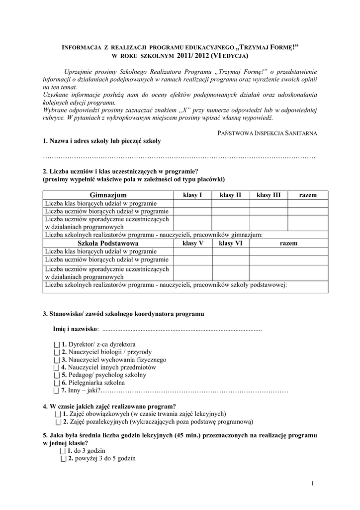INFORMACJA Z REALIZACJI PROGRAMU EDUKACYJNEGO „TRZYMAJ FORMĘ!” W ROKU SZKOLNYM 2011/ 2012 (VI EDYCJA) Uprzejmie prosimy Szkolnego Realizatora Programu „Trzymaj Formę!” o przedstawienie informacji o działaniach podejmowanych w ramach realizacji programu oraz wyrażenie swoich opinii na ten temat. Uzyskane informacje posłużą nam do oceny efektów podejmowanych działań oraz udoskonalania kolejnych edycji programu. Wybrane odpowiedzi prosimy zaznaczać znakiem „X” przy numerze odpowiedzi lub w odpowiedniej rubryce. W pytaniach z wykropkowanym miejscem prosimy wpisać własną wypowiedź. PAŃSTWOWA INSPEKCJA SANITARNA 1. Nazwa i adres szkoły lub pieczęć szkoły …………………………………………………………………………………………………………… 2. Liczba uczniów i klas uczestniczących w programie? (prosimy wypełnić właściwe pola w zależności od typu placówki) klasy I klasy II klasy III razem Gimnazjum Liczba klas biorących udział w programie Liczba uczniów biorących udział w programie Liczba uczniów sporadycznie uczestniczących w działaniach programowych Liczba szkolnych realizatorów programu - nauczycieli, pracowników gimnazjum: klasy V klasy VI razem Szkoła Podstawowa Liczba klas biorących udział w programie Liczba uczniów biorących udział w programie Liczba uczniów sporadycznie uczestniczących w działaniach programowych Liczba szkolnych realizatorów programu - nauczycieli, pracowników szkoły podstawowej: 3. Stanowisko/ zawód szkolnego koordynatora programu Imię i nazwisko: ................................................................................................ |_| 1. Dyrektor/ z-ca dyrektora |_| 2. Nauczyciel biologii / przyrody |_| 3. Nauczyciel wychowania fizycznego |_| 4. Nauczyciel innych przedmiotów |_| 5. Pedagog/ psycholog szkolny |_| 6. Pielęgniarka szkolna |_| 7. Inny – jaki?………………………………………………………………………… 4. W czasie jakich zajęć realizowano program? |_| 1. Zajęć obowiązkowych (w czasie trwania zajęć lekcyjnych) |_| 2. Zajęć pozalekcyjnych (wykraczających poza podstawę programową) 5. Jaka była średnia liczba godzin lekcyjnych (45 min.) przeznaczonych na realizację programu w jednej klasie? |_| 1. do 3 godzin |_| 2. powyżej 3 do 5 godzin 1 |_| 3. powyżej 5 do 8 godzin |_| 4. powyżej 8 do 10 godzin |_| 5. powyżej 10 do 20 godzin |_| 6. powyżej 20 godzin 6. Czy opracowano w szkole własny projekt edukacyjny zawierający: temat, cele, zadania, osoby odpowiedzialne, terminy realizacji, sposób i kryteria oceny efektów? |_| 1. Tak |_| 2. Nie (Prosimy przejść do pyt. 11) 7. Projekty, w ramach programu były przygotowywane (prosimy zaznaczyć wszystkie wybrane odpowiedzi): |_| 1. Wyłącznie przez uczniów |_| 2. Wyłącznie przez nauczycieli |_| 3. Przez uczniów pod opieką nauczyciela |_| 4. Przez uczniów, nauczycieli i przy wsparciu rodziców |_| 5. Przez inne osoby, jakie? …………………………………………………………………. 8. Jaki był tytuł (ewentualnie temat) i cele projektów edukacyjnych opracowanych w szkole? Lp. Szkoła, miejscowość Tytuł projektu edukacyjnego Cele projektu edukacyjnego 9. Czy realizowany projekt edukacyjny był oceniany i prezentowany? |_| 1. Tak |_| a. na forum klasy |_| b. na forum klasy z udziałem rodziców |_| c. na forum szkoły dla społeczności szkolnej (imprezy, festyny, święta okolicznościowe) |_| d. na forum szkoły dla społeczności szkolnej z udziałem rodziców |_| e. na forum szkoły dla społeczności szkolnej i społeczności/ instytucji spoza szkoły |_| f. na forum innych szkół/ podczas współpracy międzyszkolnej |_| g. w innych okolicznościach, jakich? …………………………………….................. ….............................................................................................................................. |_| 2. Nie 10. Czy udało się zrealizować zakładany cel/ cele projektu ? 1. Tak, w całości 2. Prawie w całości 3. Nieznacznie 4. Zupełnie nie 11. Jakie instytucje, organizacje i osoby wspierały lub współpracowały przy realizacji programu? (Prosimy zaznaczyć wszystkie wybrane odpowiedzi) |_| 1. Samorządy lokalne …………………………………………………………………………... |_| 2. Miejskie/gminne komisje, ośrodki pomocy społecznej ........................................................... 2 |_| 3. Placówki oświaty i kultury, uczelnie, biblioteki, teatry .......................................................... …………………………………………………………………............................................. |_| 4. Podmioty wykonujące działania w zakresie ochrony zdrowia np. profilaktyczne, terapeutyczne ………………………………………....................................................................................... |_| 5. Rady osiedla, spółdzielnie mieszkaniowe ……………………………………….................. |_| 6. Organizacje pozarządowe - towarzystwa, stowarzyszenia, fundacje prowadzące działalność prozdrowotną (np. PCK), ekologiczną, integrującą środowisko, aktywizującą i inną ................................................................................................................................................... |_| 7. Towarzystwa ds. kultury fizycznej, ośrodki sportu i rekreacji, kluby sportowe, orliki, baseny ……………………….............................................................................................................. |_| 8. Ośrodki, towarzystwa, kluby, koła turystyczne, rekreacyjne, wypoczynkowe ........................ ................................................................................................................................................... |_| 9. Parki krajobrazowe, leśnictwa, centra edukacji eko