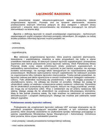ŁĄCZNOŚĆ RADIOWA Na powodzenie działań ratowniczo-gaśniczych wpływa skuteczna, dobrze zorganizowana łączność. Pozwala ona na sprawne alarmowanie, wczesne przekazywanie ważnych informacji jadącym do akcji zastępom i sekcjom straży pożarnych i wreszcie służy porozumiewaniu się strażaków pracujących na różnych stanowiskach na terenie akcji. Zgodnie z definicją łączność to zespół przedsięwzięć organizacyjno - technicznych zapewniających szybki przepływ informacji pomiędzy ratownikami. Ze względu na rodzaj środka przekazu informacji łączność można podzielić na: - radiową, - przewodową, - sygnalizacyjną. Bez właściwie zorganizowanej łączności, która powinna zapewnić alarmowanie, dowodzenie i współdziałanie, dowódca w wielu przypadkach nie byłby w stanie prawidłowo kierować akcją. W obecnych czasach łączność sygnalizacyjna i przewodowa wypierana jest niemal powszechnie przez łączność radiową. Obok Państwowej Straży Pożarnej działa coraz więcej ochotniczych straży pożarnych wyposażonych w radiotelefony samochodowe i nasobne. Łączność ta jest bardzo wygodna: nie wymaga kontaktu wzrokowego, nie wymaga także niewygodnych do rozprowadzania połączeń przewodowych. Możliwość wykorzystania różnych częstotliwości fal radiowych pozwala na organizowanie kilku rodzajów łączności równocześnie. Trzeba jednak powiedzieć, że łączność radiowa jest także ograniczona w swoich możliwościach zasięgiem nadawania i odbioru. Fale ultrakrótkie rozchodzą się prostoliniowo, l więc nie omijają przeszkód v ukształtowaniu terenu, nie odbijają się również od jonosfery. Dlatego też zasięg fal ultrakrótkich zależy od wielkości umieszczenia anteny nadaw:ej i odbiorczej. Wprawdzie dla fal ultrakrótkich przeszkodą są także budynki, których nie mogą przeniknąć, ominąć, ale mogą się od budynków odbić. Wraz z oddalaniem się od anteny nadawczej fale słabną, dlatego zasięg dla fal ultrakrótkich nie przekracza kilkudziesięciu kilometrów. Mają te fale jednak poważną zaletę. Są mało wrażliwe na zakłócenia od wyładowań atmosferycznych i urządzeń elektrycznych. Dlatego też możliwe jest odebranie nawet słabych sygnałów. Podstawowe zasady łączności radiowej Posługiwanie się urządzeniami łączności radiowej UKF wymaga stosowania się do jednolitych przepisów obozujących wszystkie jednostki, w tym ochotnicze straże pożarne), które otrzymały zezwolenie na użytkowanie sprzętu radiowego pracującego w paśmie częstotliwości Ministerstwa Spraw Wewnętrznych i Administracji. Ochotnicza straż pożarna, która używa radiotelefon powinna: - znać przepisy i zasady prowadzenia korespondencji radiowej, - mieć ważne zezwolenie, -znać zasady obsługi urządzenia radiowego, -dysponować aktualnymi danymi radiowymi. Dane radiowe Są to dokumenty umożliwiające prowadzenie łączności z określonymi korespondentami danej sieci. W dokumentach tych zawarte powinny być podstawowe elementy takie jak: -wytyczne określające sposób organizacji łączności radiowej, - obowiązujące sygnały radiowe, -numer kanału pracy (częstotliwość), - kryptonim stacji głównej oraz kryptonimy korespondentów danej sieci radiowej. Dane radiowe są dokumentami poufnymi zastrzeżonymi "do użytku służbowego". Sieć radiową tworzą co najmniej trzy stacje pracujące na wspólnych danych radiowych. Kierunek radiowy jest to sposób organizacji łączności pomiędzy dwoma stacjami, które pracują na wspólnych danych radiowych. Zasady prowadzenia korespondencji Dla zachowania sprawności systemu łączności, który powinien ułatwiać prowadzenie działań ratowniczo-gaśniczych, niezbędne jest przestrzeganie zasad prowadzenia korespondencji. Najważniejsze z nich to: 1. Podczas prowadzenia korespondencji należy kierować się zasadą: "minimum czasu nadawania - maksimum treści". 2. Wymieniając korespondencję w warunkach słabej słyszalności trzeba najważniejsze hasła powtarzać dwa razy, a nawet stosować zgłoskowanie. 3. W czasie prowadzenia korespondentów: "Ty". korespondencji stosuje się formę zwracania do 4. Nie należy, nawet w przypadku przekazywania informacji o charakterze jawnym, używać stopni służbowych i nazwisk osób funkcyjnych. Do określenia osób służą specjalne kody. 5. Podstawowym rodzajem pracy w sieciach radiowych jest prowadzenie nasłuchu. Nadawanie ma miejsce w przypadku: - potrzeby wywołania korespondenta i przekazania informacji, - zgłoszenia się na wywołanie korespondenta w celu odebrania informacji. Nawiązanie łączności Aby wywołać korespondenta, należy nadać: - kryptonim korespondenta - 1 raz - zwrot "TU" - 1 raz - kryptonim własny - 1 raz - zwrot "ODBIÓR" - 1 raz Zabrzmi to następująco: "15-05" tu "15-06" odbiór. Jeśli korespondent nie zgłosi się, treść wywołania należy powtórzyć, jednak nie więcej niż dwa razy. Ponowne wywoływanie powinno się rozpocząć po upływie kilku minut. W przypadku braku odbioru przy ponownym wywoływaniu, trzeba starać się wywołać korespondenta za pomocą innej stacji. Na przykład: " 15-07" tu "15-06" wywołaj dla mnie "15-05"-odbiór. Jeśli nasza stacja jest wywoływana przez inną stację, strażak obsługujący ją zgłasza się następująco: Tu "15-06"-odbiór. W przypadku wywoływania stacji przez kilku korespondentów, zgłoszenie się polega na podaniu: - zwrotu "TU" - 1 raz - kryptonimu własnej stacji - 1 raz, - zwrotu "zgłaszam się dla" - 1 raz, - kryptonimu jednej z wywoływanych stacji -1 raz. Zabrzmi to następująco: Tu "15-06" zgłaszam się dla "15-05" - odbiór. Aby przekazać treść korespondencji, należy podać: - kryptonim stacji korespondenta -1raz - zwrot "TU" - 1 raz - kryptonim własnej stacji - 1 raz - treść korespondencji - 1 raz - zwrot "odbiór" - 1 raz Korespondencja będzie miała przykładowo treść: "15-06" tu " 15-05" jestem na mi