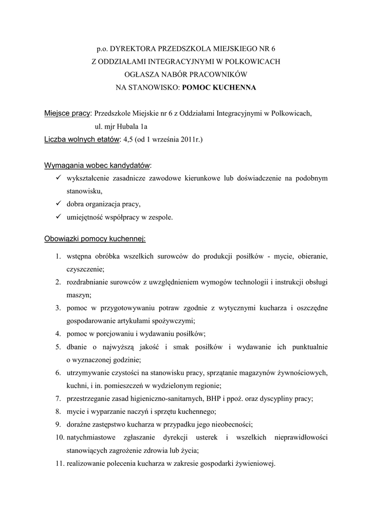 p.o. DYREKTORA PRZEDSZKOLA MIEJSKIEGO NR 6 Z ODDZIAŁAMI INTEGRACYJNYMI W POLKOWICACH OGŁASZA NABÓR PRACOWNIKÓW NA STANOWISKO: POMOC KUCHENNA Miejsce pracy: Przedszkole Miejskie nr 6 z Oddziałami Integracyjnymi w Polkowicach, ul. mjr Hubala 1a Liczba wolnych etatów: 4,5 (od 1 września 2011r.) Wymagania wobec kandydatów: wykształcenie zasadnicze zawodowe kierunkowe lub doświadczenie na podobnym stanowisku, dobra organizacja pracy, umiejętność współpracy w zespole. Obowiązki pomocy kuchennej: 1. wstępna obróbka wszelkich surowców do produkcji posiłków - mycie, obieranie, czyszczenie; 2. rozdrabnianie surowców z uwzględnieniem wymogów technologii i instrukcji obsługi maszyn; 3. pomoc w przygotowywaniu potraw zgodnie z wytycznymi kucharza i oszczędne gospodarowanie artykułami spoŜywczymi; 4. pomoc w porcjowaniu i wydawaniu posiłków; 5. dbanie o najwyŜszą jakość i smak posiłków i wydawanie ich punktualnie o wyznaczonej godzinie; 6. utrzymywanie czystości na stanowisku pracy, sprzątanie magazynów Ŝywnościowych, kuchni, i in. pomieszczeń w wydzielonym regionie; 7. przestrzeganie zasad higieniczno-sanitarnych, BHP i ppoŜ. oraz dyscypliny pracy; 8. mycie i wyparzanie naczyń i sprzętu kuchennego; 9. doraźne zastępstwo kucharza w przypadku jego nieobecności; 10. natychmiastowe zgłaszanie dyrekcji usterek i wszelkich nieprawidłowości stanowiących zagroŜenie zdrowia lub Ŝycia; 11. realizowanie polecenia kucharza w zakresie gospodarki Ŝywieniowej. Podania do pracy wraz z CV oraz ewentualnymi dokumentami potwierdzającymi staŜ pracy na podobnym stanowisku naleŜy dostarczać w zamkniętej kopercie z podanym adresem zwrotnym i dopiskiem „Nabór na stanowisko pomocy kuchennej w Przedszkolu Miejskim nr 6 z Oddziałami Integracyjnymi w Polkowicach” w siedzibie Przedszkola Miejskiego nr 5 w Polkowicach (ul. Kolejowa 14) w terminie do 06 czerwca 2011 roku do godziny 16:00 lub wysłać w ww. terminie poleconą przesyłką pocztową na adres: Przedszkole Miejskie nr 5, ul. Kolejowa 14, 59-100 Polkowice. Aplikacje, które wpłyną po wyŜej określonym terminie nie będą rozpatrywane. Wymagane dokumenty powinny być opatrzone klauzulą: “WyraŜam zgodę na przetwarzanie moich danych osobowych zawartych w ofercie pracy dla potrzeb niezbędnych do realizacji procesu rekrutacji zgodnie z ustawą z dnia 29 sierpnia 1997 r. o ochronie danych osobowych (Dz.U. z 2002 r. Nr 101, poz. 926) oraz ustawą z dnia 22 marca 1990 r. o pracownikach samorządowych (Dz.U z 2001 r. Nr 142, poz. 1593, z późn.zm)”. p.o. Dyrektora Przedszkola Miejskiego nr 6 z Oddziałami Integracyjnymi w Polkowicach mgr Magdalena Jedlecka