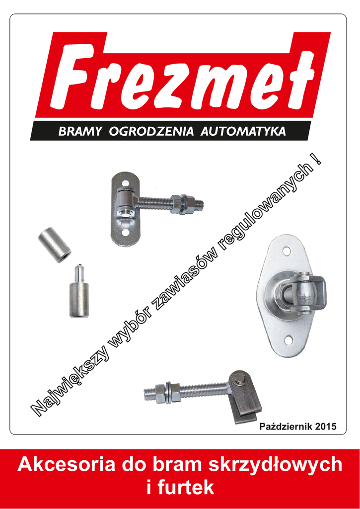 h c y ! an w o l u g e w ó r s a i r ó b w a z y y z s w k ę i w j a N Październik 2015 Akcesoria do bram skrzydłowych i furtek P.P.H.U. „FREZMET” s.c. Szczechla ul. Żyzna 15, 42-202 Częstochowa tel. 34 365 92 73, fax 34 369 81 63 [email protected] ZAWIASY REGULOWANE Numer katalogowy Wymiar ( mm ) Cena netto Cena brutto M16 Zawias regulowany do przyspawania 65 9,00 zł 11,07 zł M20 Zawias regulowany do przyspawania 85 10,00 zł 12,30 zł 23,54 zł 28,95 zł M24 Zawias regulowany do wspawania 375 M16 Zawias regulowany do przykręcenia podstawa kwadratowa 75 x 75 11,50 zł 14,14 zł M20 Zawias regulowany do przykręcenia podstawa kwadratowa 100 x 100 12,50 zł 15,37 zł M16 Zawias regulowany do przykręcenia podstawa prostokątna 75 x 60 11,50 zł 14,14 zł M16 Zawias regulowany do przykręcenia podstawa prostokątna 100 x 75 12,00 zł 14,76 zł M16 Zawias regulowany do przykręcenia podstawa prostokątna ( do wyczerpania zapasów ! ) 120 x 75 12,00 zł 14,76 zł M20 Zawias regulowany do przykręcenia podstawa prostokątna 100 x 80 12,60 zł 15,50 zł M20 Zawias regulowany do przykręcenia podstawa prostokątna 120 x 85 13,30 zł 16,35 zł M20 Zawias regulowany do przykręcenia podstawa prostokątna ( do wyczerpania zapasów ! ) 160 x 85 13,60 zł 16,72 zł M20 Zawias regulowany do przykręcenia podstawa prostokątna, otwory fasole 120 x 75 13,00 zł 15,99 zł www.frezmet.com www.frezmet.com 2 P.P.H.U. „FREZMET” s.c. Szczechla ul. Żyzna 15, 42-202 Częstochowa tel. 34 365 92 73, fax 34 369 81 63 [email protected] Numer katalogowy Wymiar ( mm ) Cena netto Cena brutto 160 x 85 14,00 zł 17,22 zł 160 x 105 x 6 28,90 zł 35,54 zł M16 Zawias regulowany L-130 do przykręcenia 40 x 5 x 115 12,20 zł 15,00 zł M16 Zawias regulowany L-130 do przykręcenia 50 x 5 x 115 12,50 zł 15,37 zł M16 Zawias regulowany L -160 * 9,00 zł 11,07 zł M18 Zawias regulowany L -180 * 11,00 zł 13,30 zł M20 Zawias regulowany L -180 * 12,00 zł 14,76 zł 23,39 zł 36,15 zł Element - kąt otwarcia 180° ( do M16 ) 1,60 zł 1,96 zł Element - kąt otwarcia 180° ( do M18 ) 2,10 zł 2,58 zł Element - kąt otwarcia 180° ( do M20 ) 2,10 zł 2,58 zł M20 Zawias regulowany do przykręcenia podstawa romb M20 Zawias regulowany do przykręcenia podstawa ozdobna M24 Zawias regulowany L -16 ( z długą śrubą i nakrętką ) 61.008 379 * - Możliwość zastosowania elementu - kąt otwarcia 180° Zawias regulowany przykręcany Ø 27 z kulką z M16 200 x 50 11,80 zł 14,51 zł Zawias regulowany przykręcany Ø 30 z kulką z M18 160 x 85 15,30 zł 18,81 zł www.frezmet.com www.frezmet.com 3 P.P.H.U. „FREZMET” s.c. Szczechla ul. Żyzna 15, 42-202 Częstochowa tel. 34 365 92 73, fax 34 369 81 63 [email protected] Numer katalogowy Wymiar ( mm ) Cena netto Cena brutto M20 Zawias regulowany do wspawania ( do łącznika ) 61.055 Ø 30 22,87 zł 28,13 zł M24 Zawias regulowany do wspawania ( do łącznika ) 61.056 Ø 35 32,22 zł 39,63 zł Łącznik zawiasu ( dla zawiasu M20 ) 61.057 Ø 28,5/40x40 15,59 zł 19,18 zł Łącznik zawiasu ( dla zawiasu M24 ) 61.058 Ø 33,5/40x40 18,08 zł 22,24 zł Zawias dolny 61.059 Ø 20/60x60 19,17 zł 23,58 zł www.frezmet.com www.frezmet.com 4 P.P.H.U. „FREZMET” s.c. Szczechla ul. Żyzna 15, 42-202 Częstochowa tel. 34 365 92 73, fax 34 369 81 63 [email protected] Numer katalogowy M18, M22 M20, M24 M18, M22 Wymiar ( mm ) Cena netto Cena brutto M18 zawias do wspawania 61.029 18,00 zł 22,14 zł M20 zawias do wspawania 61.027 18,20 zł 22,38 zł M22 zawias do wspawania 61.030 22,90 zł 28,16 zł M24 zawias do wspawania 61.028 25,80 zł 31,73 zł M18 zawias regulowany do wspawania 61.023 21,80 zł 26,81 zł M20 zawias regulowany do wspawania 61.021 23,80 zł 29,27 zł M22 zawias regulowany do wspawania 61.024 29,00 zł 35,67 zł M18 zawias do wmurowania 61.042 24,70 zł 30,38 zł M20 zawias do wmurowania 61.040 25,50 zł 31,36 zł M22 zawias do wmurowania 61.043 34,80 zł 42,80 zł M24 zawias do wmurowania 61.041 34,70 zł 42,68 zł Zawias do wmurowania - M16 ( nakrętka ) 61.005 16,00 zł 19,68 zł Zawias do wmurowania - M20 ( nakrętka ) 61.006 16,50 zł 20,29 zł M20 M18, M22 M20, M24 www.frezmet.com www.frezmet.com 5 P.P.H.U. „FREZMET” s.c. Szczechla ul. Żyzna 15, 42-202 Częstochowa tel. 34 365 92 73, fax 34 369 81 63 [email protected] ZAWIASY TOCZONE, ZAWIASY KĄTOWE Numer katalogowy Wymiary ( mm ) Cena netto Cena brutto Zawias toczony Ø 12 ZT.12 60 2,52 zł 3,10 zł Zawias toczony Ø 16 ZT.16 66 2,67 zł 3,28 zł Zawias toczony Ø 20 ZT.20 70 2,91 zł 3,58 zł Zawias toczony Ø 24 ZT.24 80 3,70 zł 4,55 zł Zawias toczony Ø 27 ZT.27 90 4,86 zł 5,98 zł Zawias toczony Ø 30 ZT.30 100 5,83 zł 7,17 zł Zawias toczony Ø 35 ZT.35 120 7,48 zł 9,20 zł Zawias toczony Ø 40 ZT.40 120 9,86 zł 12,13 zł Zawias toczony Ø 20 z kulką ZT.20.K 70 3,71 zł 4,56 zł Zawias toczony Ø 24 z kulką ZT.24.K 80 4,68 zł 5,76 zł Zawias toczony Ø 27 z kulką ZT.27.K 90 5,80 zł 7,13 zł Zawias toczony Ø 30 z kulką ZT.30.K 100 6,98 zł 8,59 zł Zawias toczony Ø 35 z kulką ZT.35.K 120 8,67 zł 10,66 zł Zawias toczony Ø 40 z kulką ZT.40.K 120 11,14 zł 13,70 zł Zawias toczony Ø 27 z kulką ozdobny ZTO.27.K 140 12,05 zł 14,82 zł Zawias toczony Ø 35 z kulką ozdobny ZTO.35.K 190 8,67 zł 16,63 zł Zawias kątowy zwykły duży + czop ZK.1.1 dł. 400 mm wys. 600 mm szer. 50 mm gr. 5 mm 24,45 zł 30,07 zł Zawias kątowy ozdobny duży + czop ZK.2.1 dł. 400 mm wys. 600 mm szer. 50 mm gr. 5 mm 29,40 zł 36,16 zł Zawias kątowy zwykły mały ZK.1.2 8,20 zł 10,09 zł Zawias kątowy ozdobny mały ZK.2.2 11,90 zł 14,64 zł dł. 250 mm wys. 290 mm szer. 35 mm dł. 250 mm wys. 290 mm szer. 35 mm gr. 4 mm www.frezmet.com www.frezmet.com 6 P.P.H.U. „FREZMET” s.c. Szczechla ul. Żyzna 15, 42-202 Częstochowa tel. 34 365 92 73, fax 34 369 81 63 [email protected] Numer katalogowy Wymiary ( mm ) Cena netto Cena brutto Zawias czopowy Ø 14 do przykręcenia ZC.14 wys. 150 mm szer.