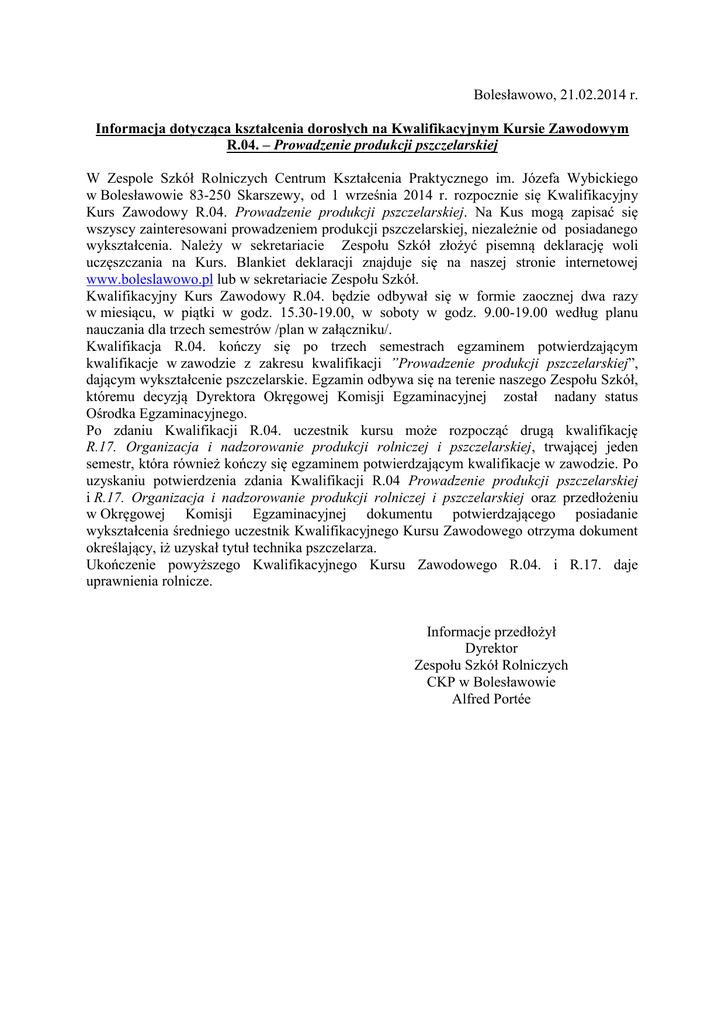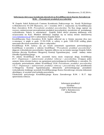Bolesławowo, 21.02.2014 r. Informacja dotycząca kształcenia dorosłych na Kwalifikacyjnym Kursie Zawodowym R.04. – Prowadzenie produkcji pszczelarskiej W Zespole Szkół Rolniczych Centrum Kształcenia Praktycznego im. Józefa Wybickiego w Bolesławowie 83-250 Skarszewy, od 1 września 2014 r. rozpocznie się Kwalifikacyjny Kurs Zawodowy R.04. Prowadzenie produkcji pszczelarskiej. Na Kus mogą zapisać się wszyscy zainteresowani prowadzeniem produkcji pszczelarskiej, niezależnie od posiadanego wykształcenia. Należy w sekretariacie Zespołu Szkół złożyć pisemną deklarację woli uczęszczania na Kurs. Blankiet deklaracji znajduje się na naszej stronie internetowej www.boleslawowo.pl lub w sekretariacie Zespołu Szkół. Kwalifikacyjny Kurs Zawodowy R.04. będzie odbywał się w formie zaocznej dwa razy w miesiącu, w piątki w godz. 15.30-19.00, w soboty w godz. 9.00-19.00 według planu nauczania dla trzech semestrów /plan w załączniku/. Kwalifikacja R.04. kończy się po trzech semestrach egzaminem potwierdzającym kwalifikacje w zawodzie z zakresu kwalifikacji ”Prowadzenie produkcji pszczelarskiej”, dającym wykształcenie pszczelarskie. Egzamin odbywa się na terenie naszego Zespołu Szkół, któremu decyzją Dyrektora Okręgowej Komisji Egzaminacyjnej został nadany status Ośrodka Egzaminacyjnego. Po zdaniu Kwalifikacji R.04. uczestnik kursu może rozpocząć drugą kwalifikację R.17. Organizacja i nadzorowanie produkcji rolniczej i pszczelarskiej, trwającej jeden semestr, która również kończy się egzaminem potwierdzającym kwalifikacje w zawodzie. Po uzyskaniu potwierdzenia zdania Kwalifikacji R.04 Prowadzenie produkcji pszczelarskiej i R.17. Organizacja i nadzorowanie produkcji rolniczej i pszczelarskiej oraz przedłożeniu w Okręgowej Komisji Egzaminacyjnej dokumentu potwierdzającego posiadanie wykształcenia średniego uczestnik Kwalifikacyjnego Kursu Zawodowego otrzyma dokument określający, iż uzyskał tytuł technika pszczelarza. Ukończenie powyższego Kwalifikacyjnego Kursu Zawodowego R.04. i R.17. daje uprawnienia rolnicze. Informacje przedłożył Dyrektor Zespołu Szkół Rolniczych CKP w Bolesławowie Alfred Portée