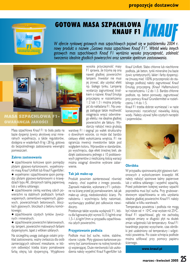 propozycje dostawców GOTOWA MASA SZPACHLOWA KNAUF F1 W ofercie rynkowej gotowych mas szpachlowych pojawił się w październiku 2004 r. nowy produkt o nazwie „Gotowa masa szpachlowa Knauf F1”. Wśród wielu innych gotowych mas szpachlowych Knauf F1 wyróżnia wysoka przyczepność, zdolność tworzenia idealnie gładkich powierzchni oraz szerokie spektrum zastosowania. Masa szpachlowa Knauf F1 to biała pasta na bazie dyspersji żywicy akrylowej oraz mineralnych wypełniaczy, a także regulatorów, dostępna w wiaderkach 8 kg i 28 kg, gotowa do bezpośredniego zastosowania wewnątrz pomieszczeń. Zakres zastosowania ! szpachlowanie końcowe spoin pomiędzy płytami gipsowo-kartonowymi, wypełnionymi masą Knauf Uniflott lub Knauf Fugenfüller; ! wypełnianie i szpachlowanie spoin pomiędzy płytami gipsowo-kartonowymi o krawędziach typu AK, zbrojonych taśmą papierową lub z włókna szklanego; ! szpachlowanie cienką warstwą całych powierzchni na stabilnych podłożach: tynkach wapiennych, cementowo-wapiennych, gipsowych, powierzchniach betonowych, bloczkach gipsowych, bloczkach z betonu komórkowego; ! szpachlowanie czystych tynków żywicznych i mineralnych; ! szpachlowanie powierzchni lakierowanych, np. lamperii, powierzchni malowanych farbami dyspersyjnymi, tapet z włókien szklanych. Na szczególną uwagę zasługuje ostatni przykład zastosowania, ważny zwłaszcza dla osób zamierzających odnowić mieszkanie, w którym odświeżyć trzeba ściany pomalowane farbą olejną lub dyspersyjną. Wyjątkowo wysoka przyczepność masy F1 sprawia, że trzyma się ona nawet gładkiej powierzchni lamperii. Inwestor nie musi jej zrywać, aby uzyskać efekt np. białego tynku. Lamperię wystarczy zagruntować środkiem o nazwie: Knauf Emulsja przyczepna w rozcieńczeniu 1: 2 lub 1: 3 i można przystąpić do nakładania F1. Na uwagę zasługuje także możliwość osiągnięcia wręcz odwrotnego efektu: nie idealnie gładkiej powierzchni ale faktury. Wystarczy nałożyć nieco grubszą warstwę F1 i sięgnąć po wałek strukturalny o dowolnym wzorze, co może dać bardzo ciekawy efekt wykończenia wnętrza. F1 nie ogranicza inwencji inwestorów także pod względem koloru. Wprawdzie w standardzie, po wyschnięciu, daje efekt śnieżnej bieli, ale dzięki zastosowaniu jednego z 10 podstawowych pigmentów z niezliczoną ilością wariacji można osiągnąć dowolnie wybrane zabarwienie. Tak jak make-up Produkt powinien zainteresować również malarzy, choć zupełnie z innego powodu. Zaprawki malarskie, wykonane z F1 i położone na ścianę przed jej pomalowaniem, tak jak make-up ukryją niedoskonałości ściany. Po nałożeniu i wyschnięciu farby natomiast, wyrównujący podkład jest całkowicie niewidoczny. Przekonuje także wysoka wydajność F1, która dla fugowania płyt wynosi 0,15 kg/mb oraz 1,5–1,6 kg/m2/mm w przypadku szpachlowania całych powierzchni. Przygotowanie podłoża Podłoże musi być suche, nośne, stabilne, równe i czyste. Płyty gipsowo-kartonowe powinny być zamontowane na nośnej konstrukcji wspierającej. Duże nierówności lub uszkodzenia należy wypełnić Knauf Fugenfüller lub Knauf Uniflott. Słabo chłonne lub niechłonne podłoża, jak beton, tynki mineralne (na bazie żywic syntetycznych), lakier i farby dyspersyjne (muszą mieć 100% przyczepności do stabilnego podłoża) należy zagruntować Knauf Emulsją przyczepną (Knauf Haftemulsion) w rozcieńczeniu 1:2 do 1:3. Bardzo chłonne podłoże, np. beton porowaty, zagruntować przy pomocy Knauf Grundiermittel w rozieńczeniu 1:4 do 1: 5. Knauf F1 trzeba dobrze wymieszać i w razie konieczności rozcieńczyć niewielką ilością wody. Należy używać tylko czystych narzędzi i pojemników. Obróbka W przypadku spoinowania płyt gipsowo-kartonowych z wykończeniem krawędzi AK należy nałożyć spoinowe taśmy papierowe lub z włókna szklanego i wypełnić szpachlą. Przed położeniem kolejnej warstwy szpachli poprzednia musi być sucha. Przy grubowarstwowym szpachlowaniu w celu uzyskania idealnie gładkiej powierzchni Knauf F1 należy nakładać w kilku warstwach. Temperatura powietrza i podłoża nie mogą być niższe od + 10oC oraz wyższe niż 25oC. Knauf F1 szpachlować, gdy nie zachodzą większe zmiany w długości płyt na skutek zmian wilgotności lub temperatury. Knauf F1 twardnieje poprzez wysychanie, czas obróbki jest uzależniony od temperatury i wilgotności powietrza. Po czasie schnięcia podłoże można szlifować przy pomocy papieru ściernego. www.knauf.pl marzec – kwiecień 2005 25